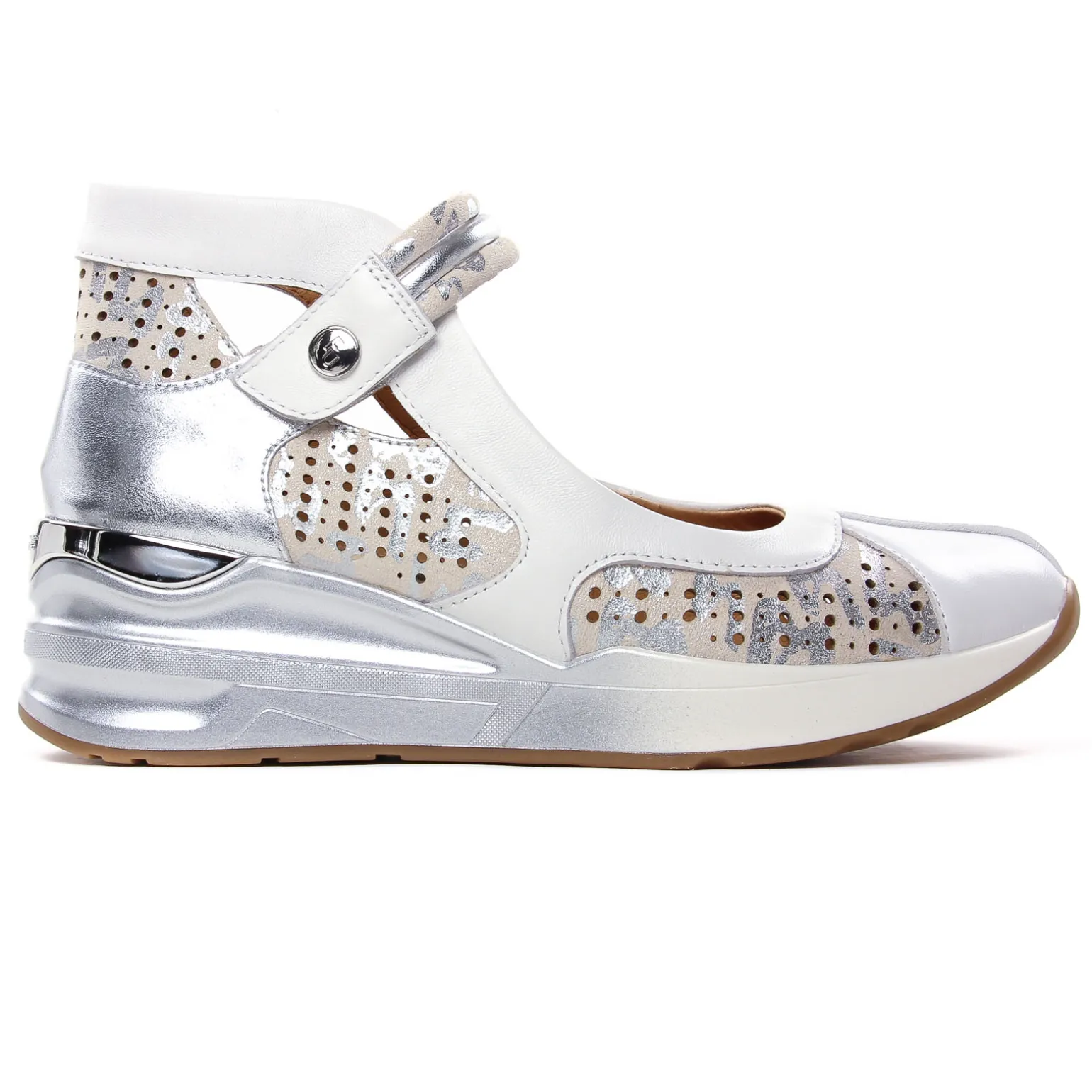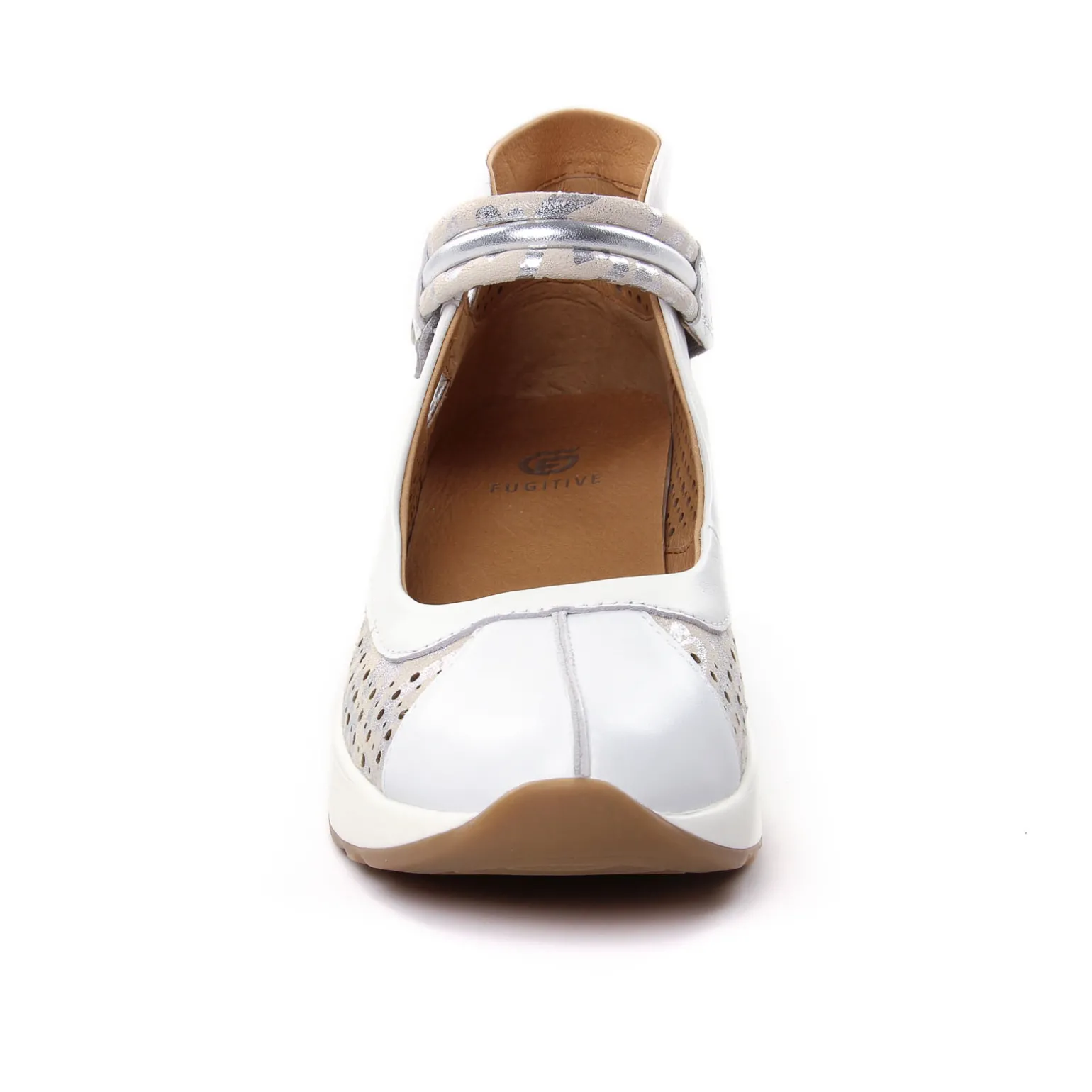 Babies Confort de la marque Fugitive de couleur blanc argent. Originales et glam, ces babies montantes blanches argentées, une semelle sport compensée haute de 4 cm, mélange de textures de cuir métal et lisse, bride sur la cheville, doublure et première de propreté en cuir, nouvelle collection été 2023 de chez Fugitive