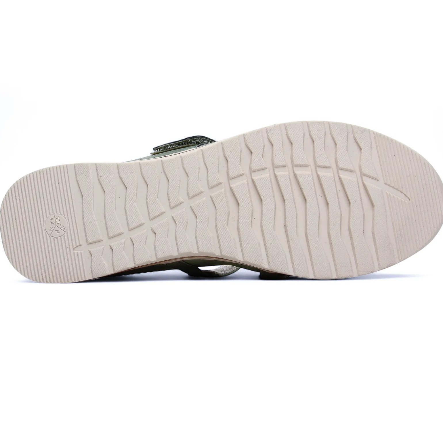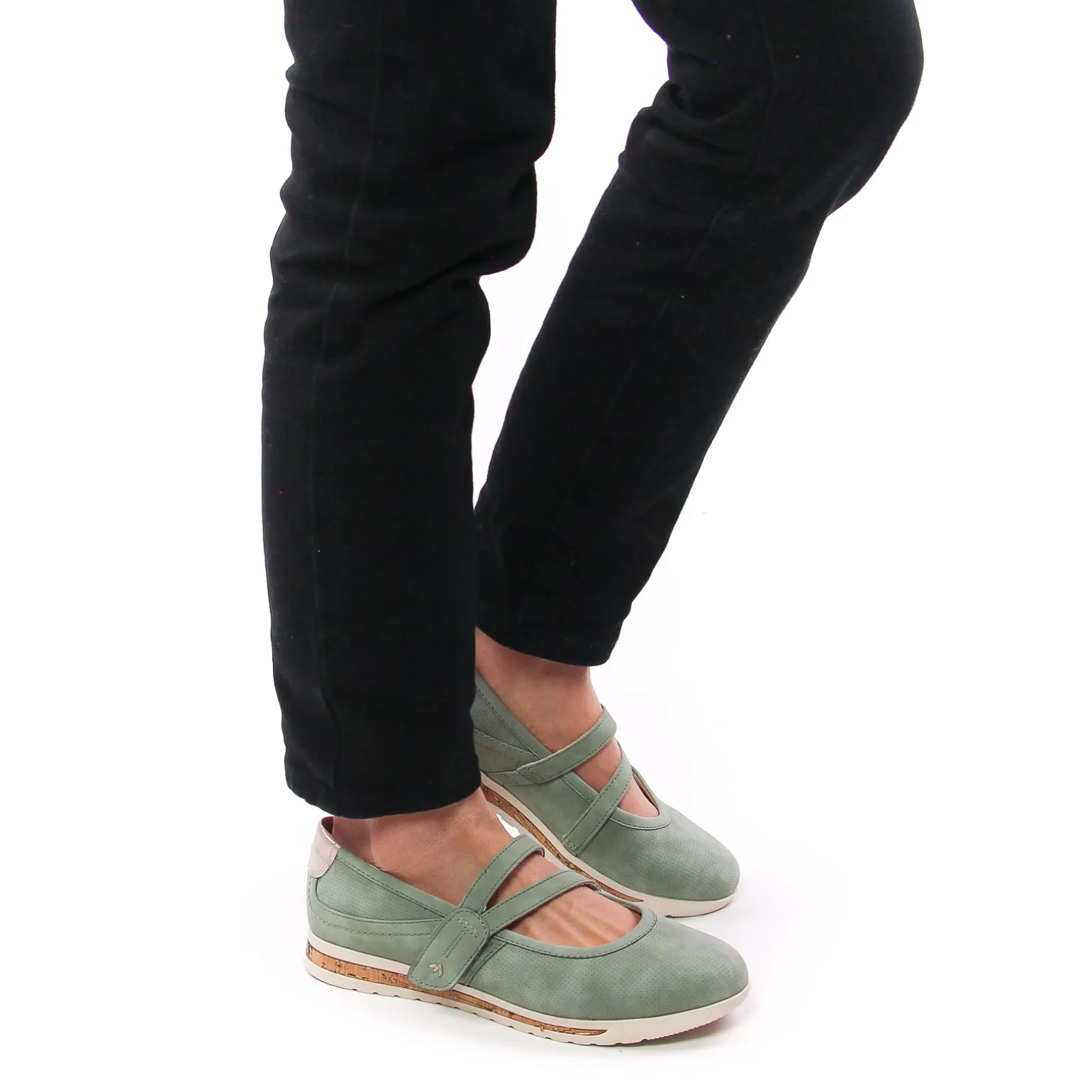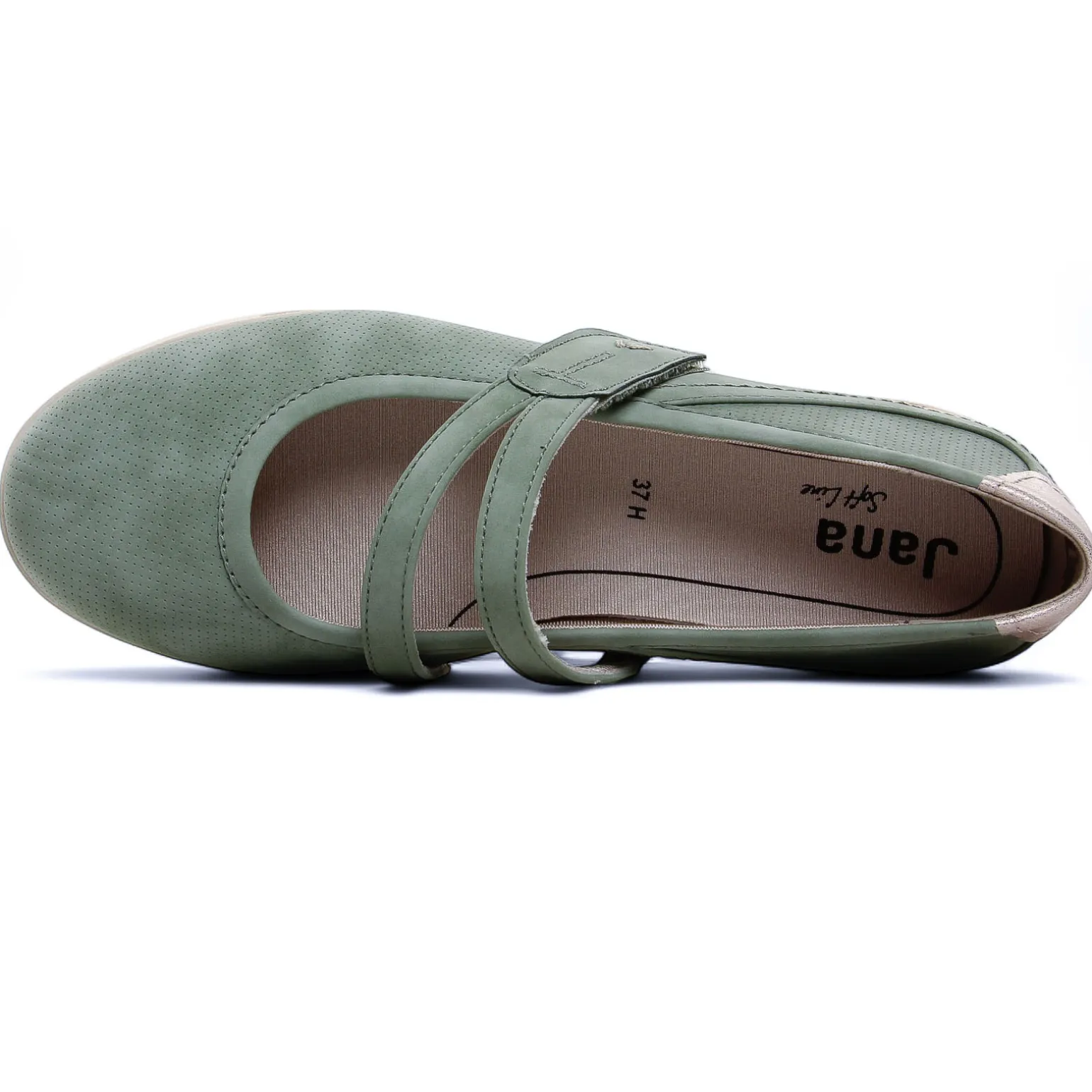 Babies Confort de la marque Jana de couleur vert sauge. Babies sport légères avec une première amovible, une bride sur le coup de pied avec fermeture à scratch, deux versions disponibles pour cette nouvelle collection printemps 2025 : une vert sauge et l’autre bleu marine
