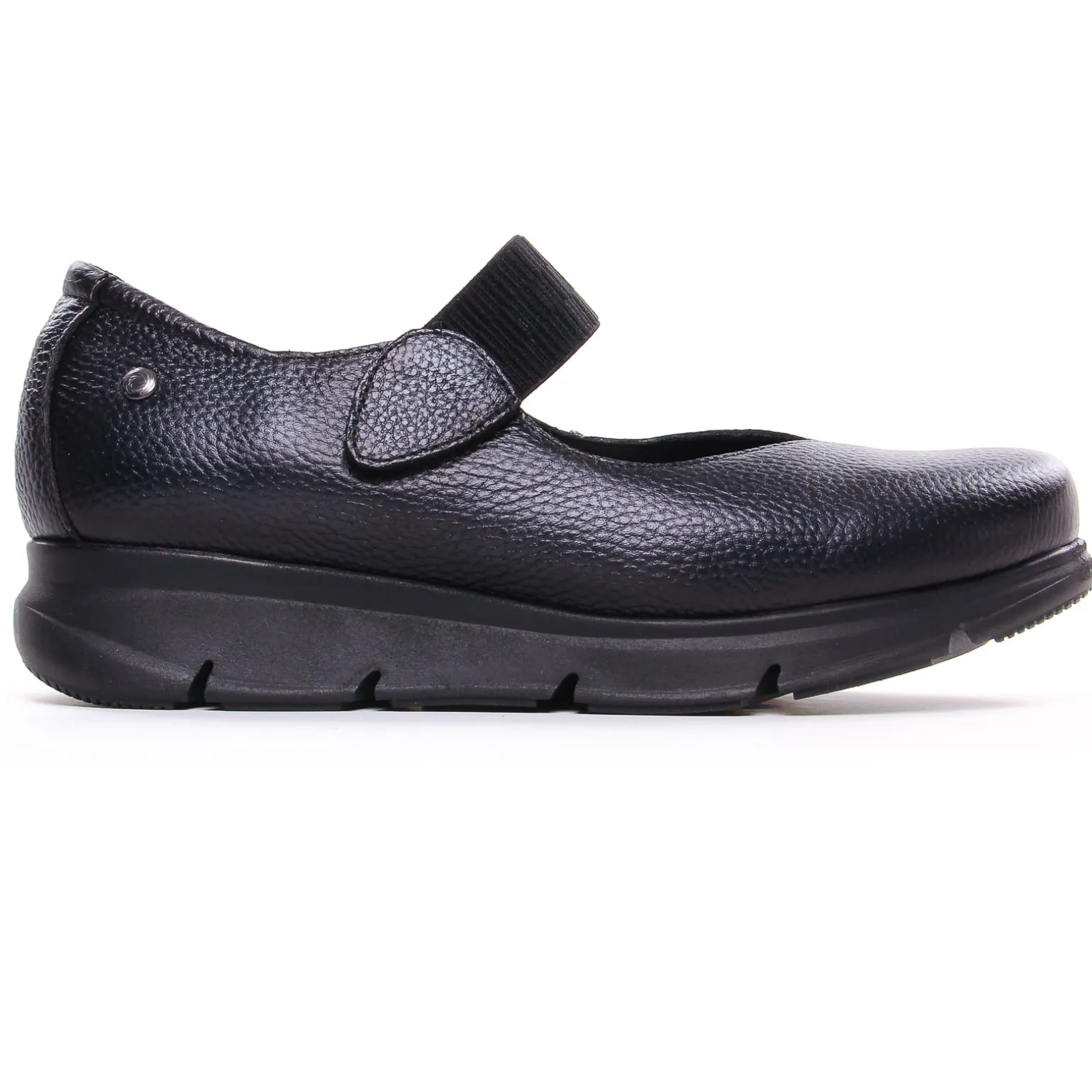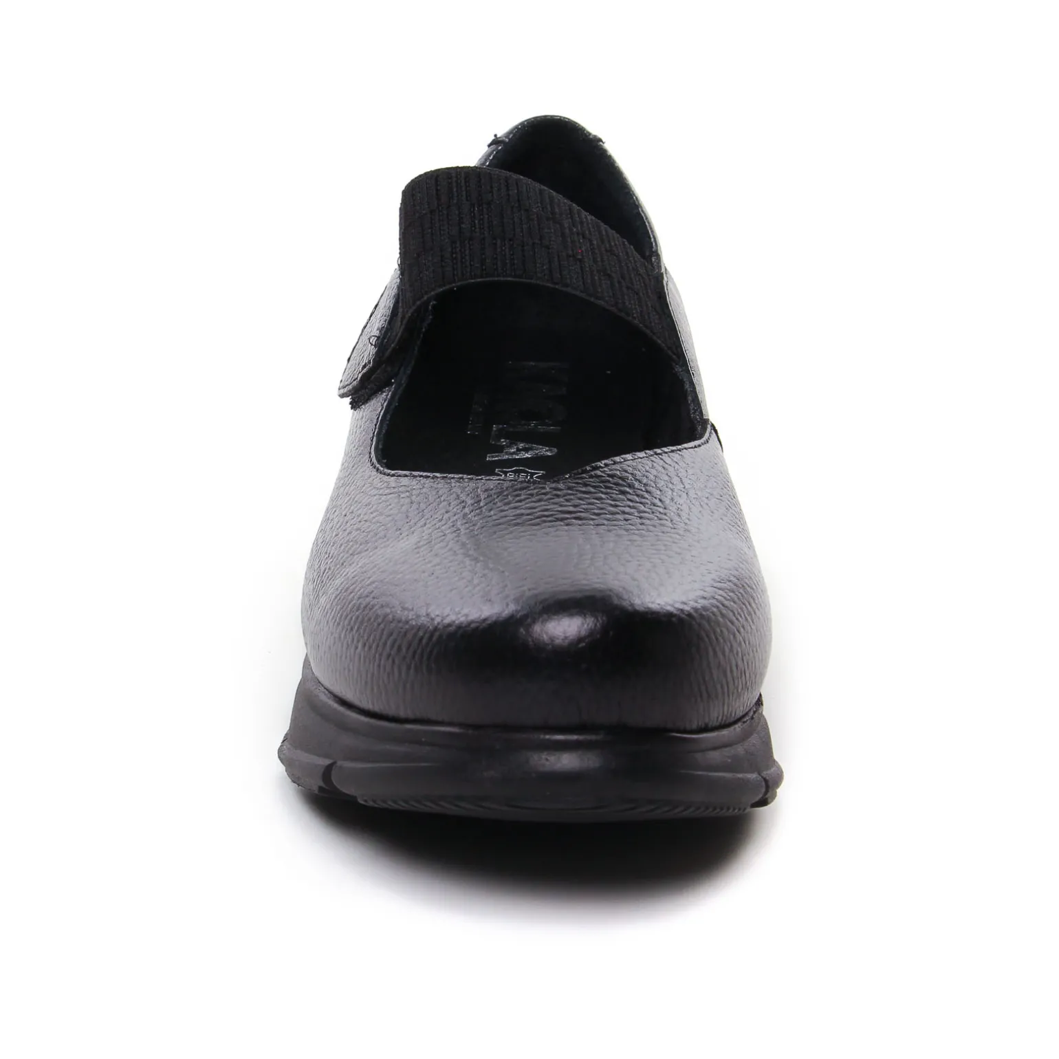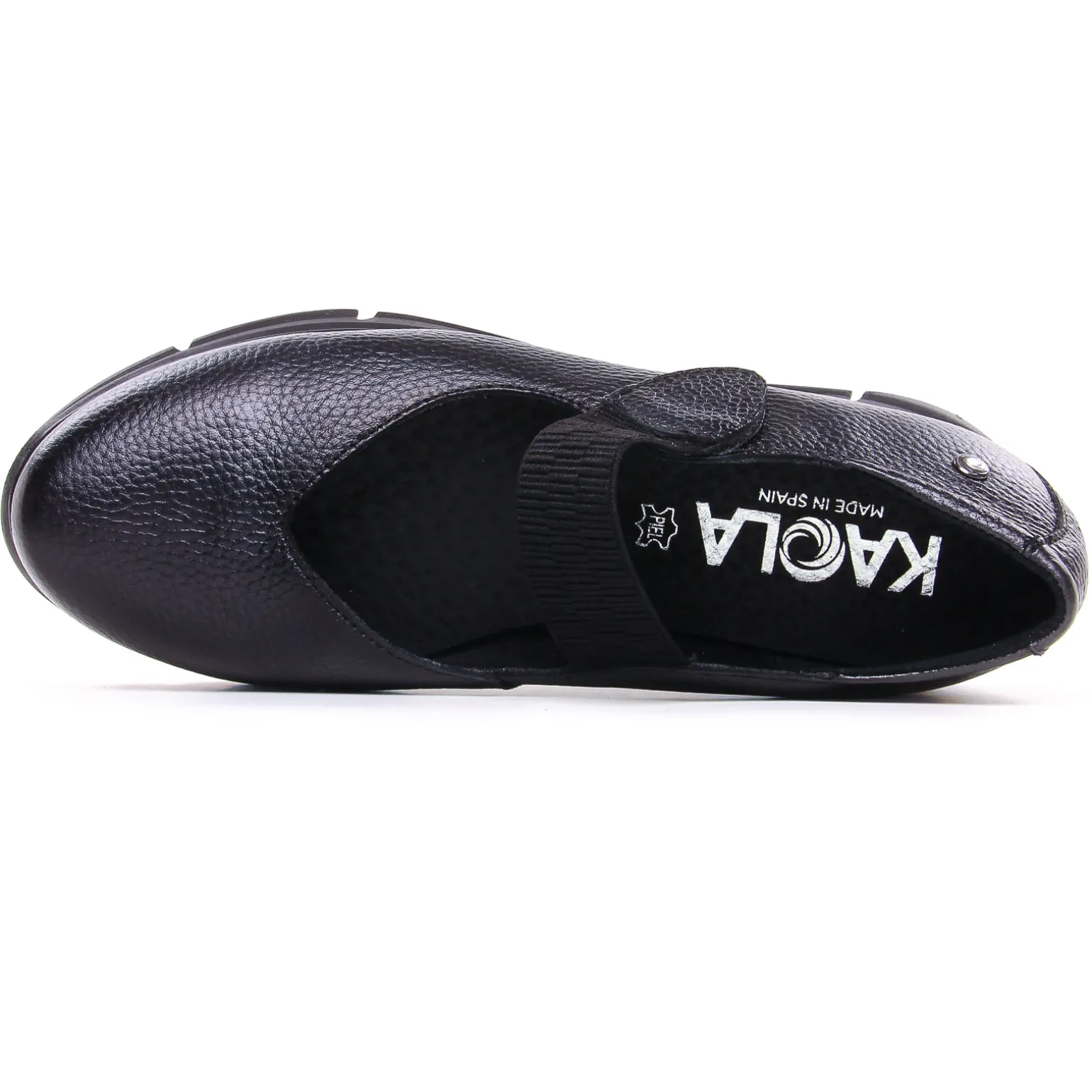 Babies Confort de la marque Kaola de couleur noir. Babies confort avec une semelle plateforme sport, une première amovible, une bride à scratch élastiquée sur le coup pied pour un maintien parfait et confortable, chaussures confort tout cuir sur une semelle élastomère légère, disponible en vert foncé métallisé ou en cuir lisse noir