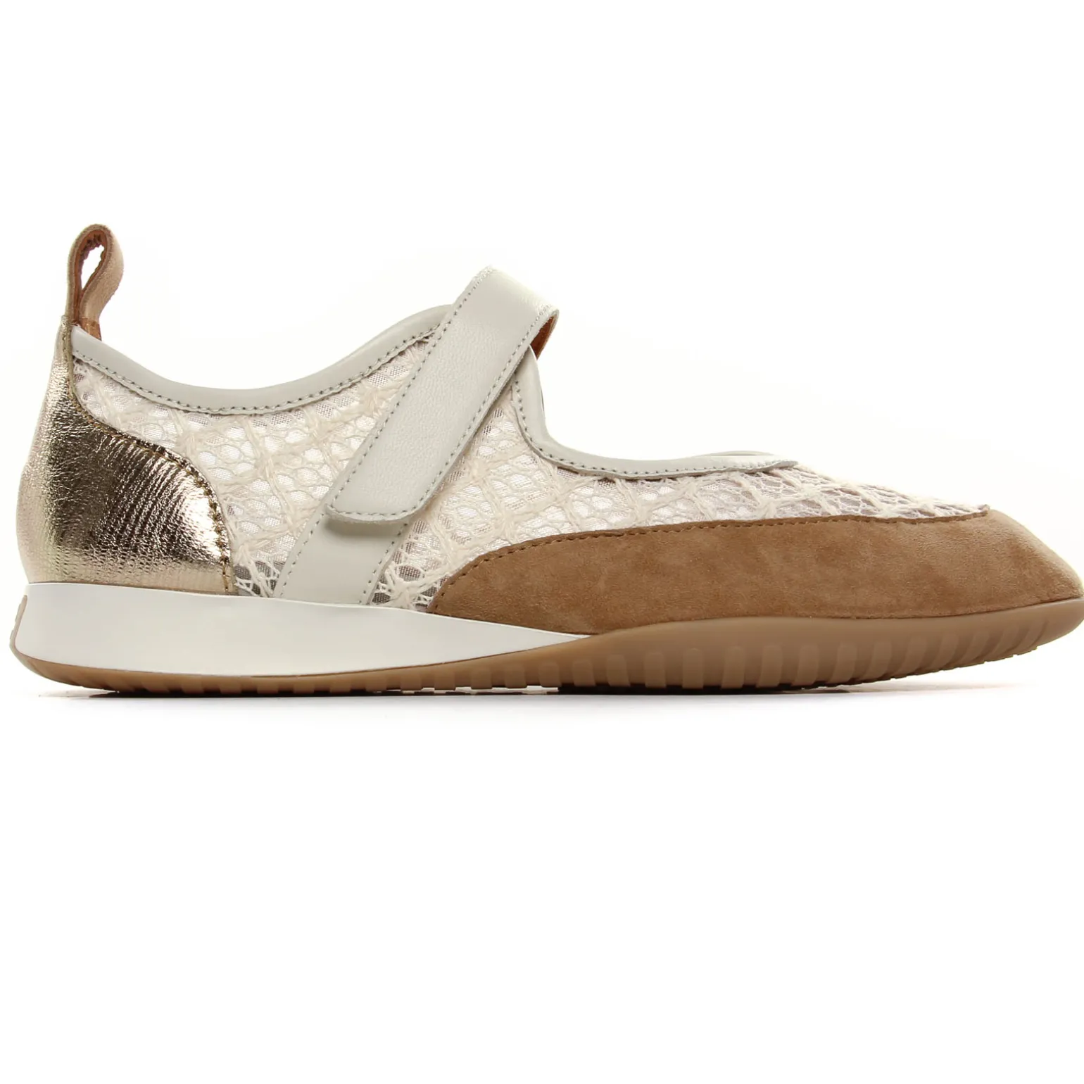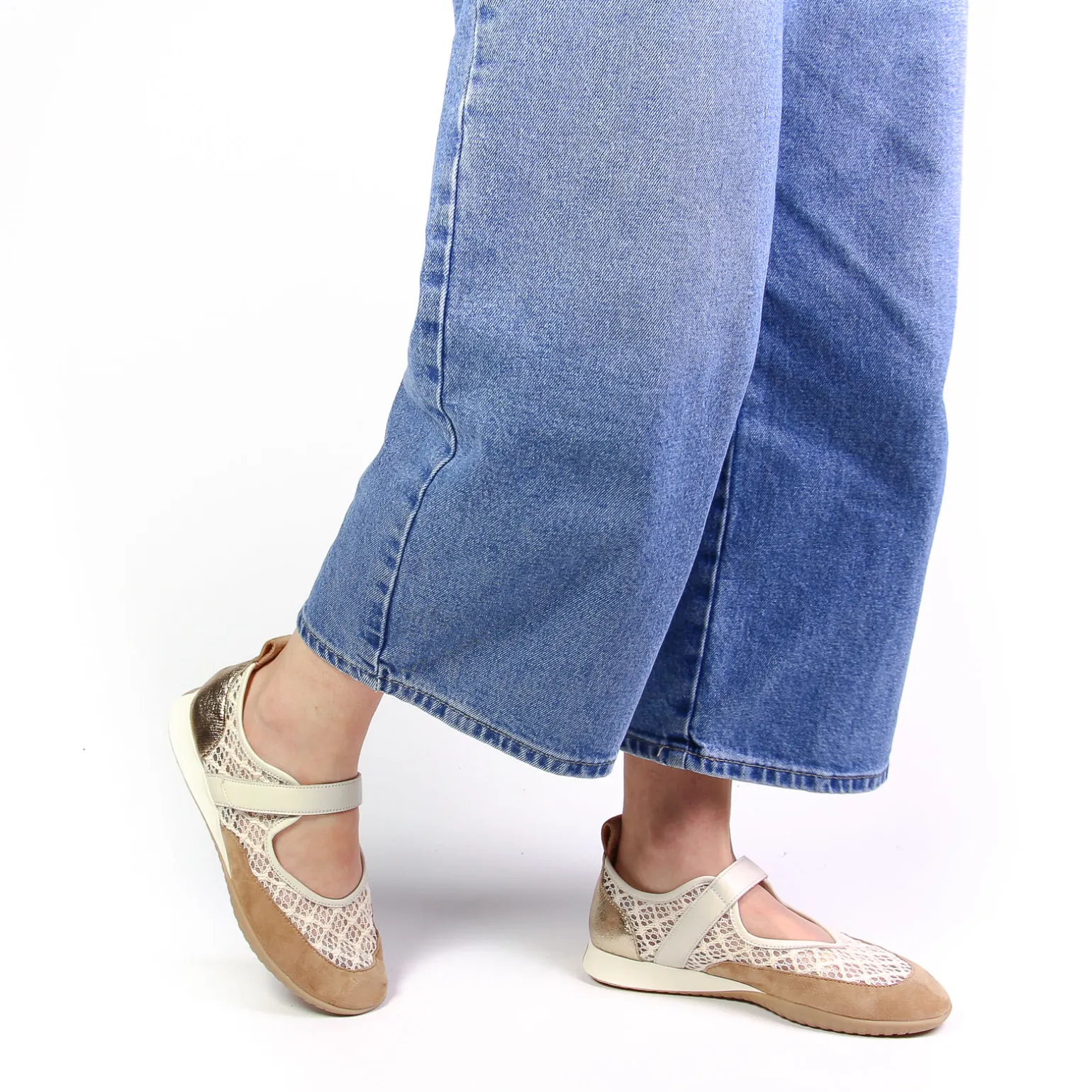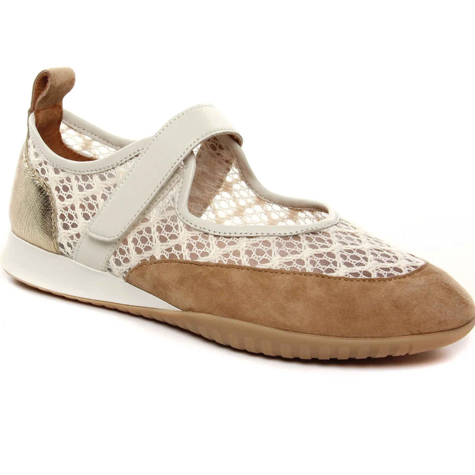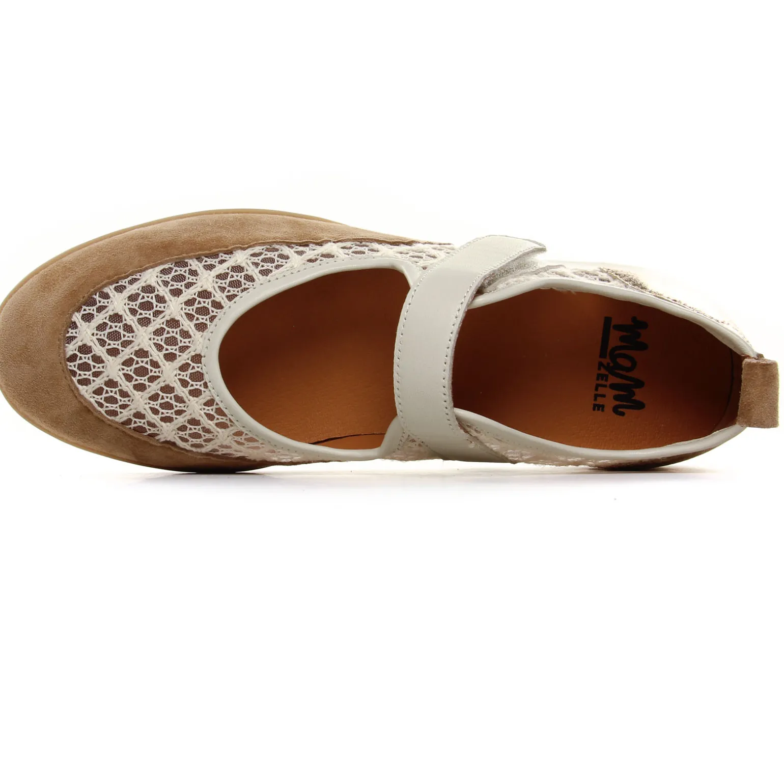 Babies Confort de la marque Mamzelle de couleur marron beige. Babies en cuir et dentelle très féminine, une première de propreté en cuir et amovible, bride sur le coup de pied avec une fermeture à scratch, nouvelle collection Mam’zelle printemps été 2025