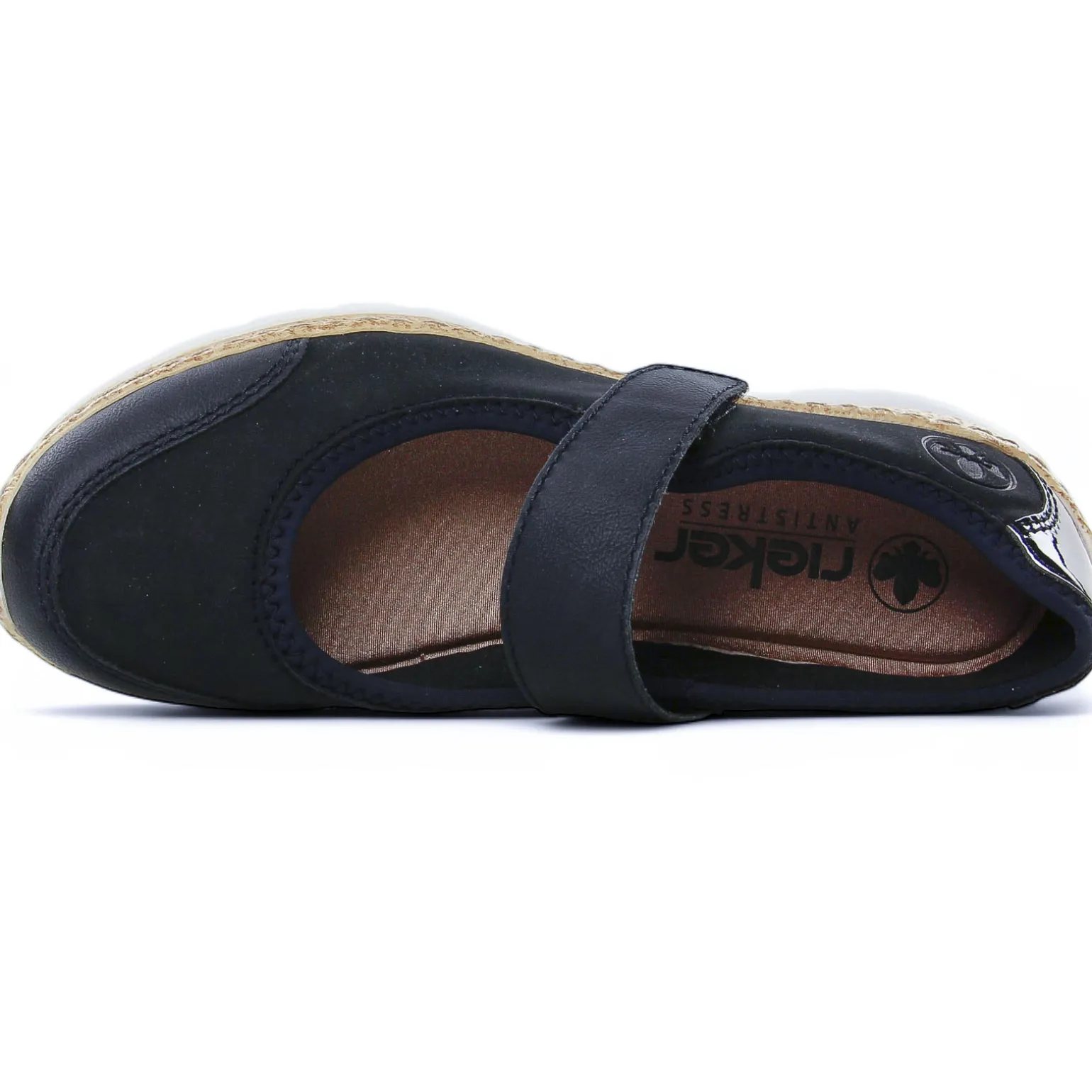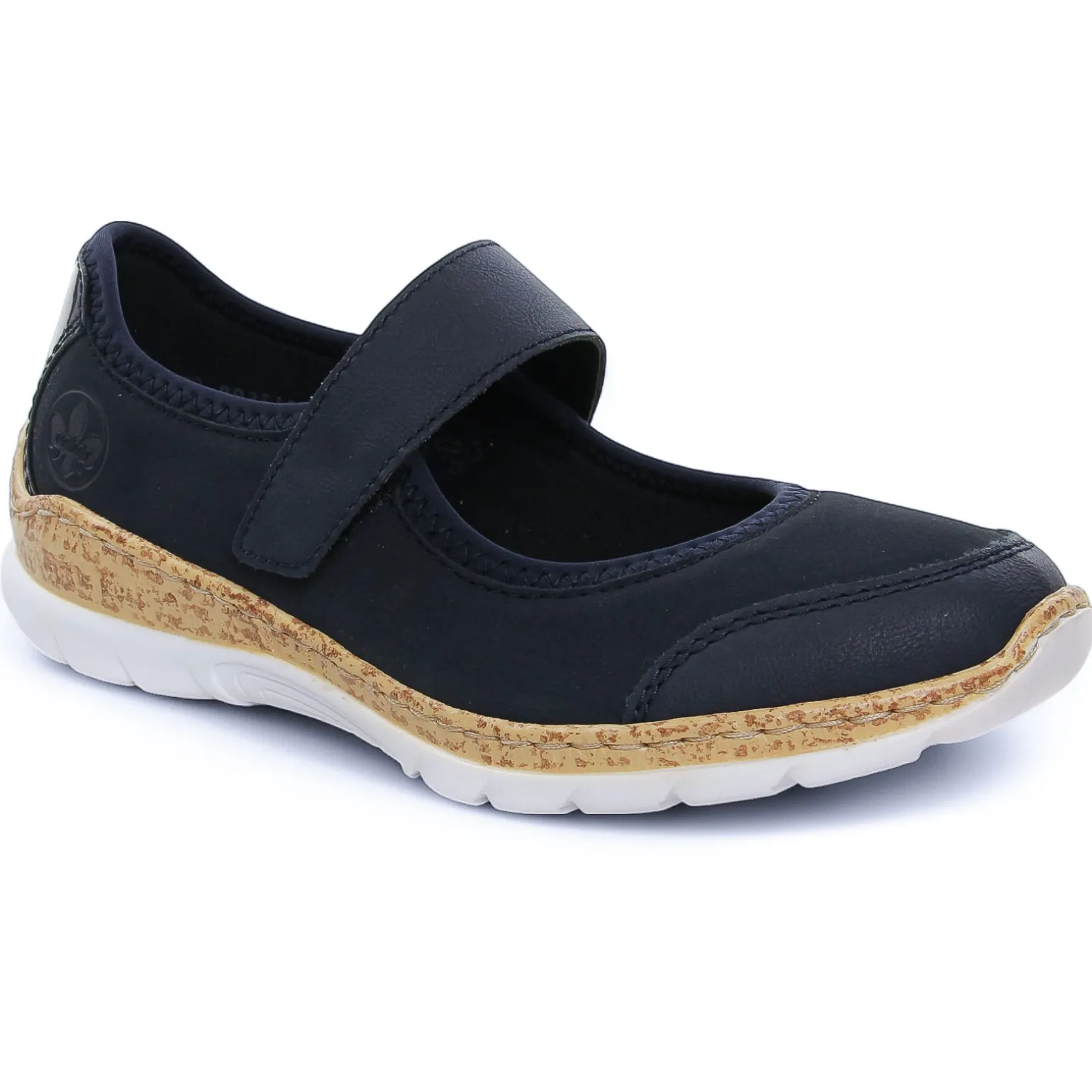 Babies Confort de la marque Rieker de couleur marine. Ballerines légères à bride velcro sur le coup de pied, empiècement au talon d’un simili marine vernis, première ergonomique à mémoire de forme confortable à souhait, semelle blanche, un concentré de confort !