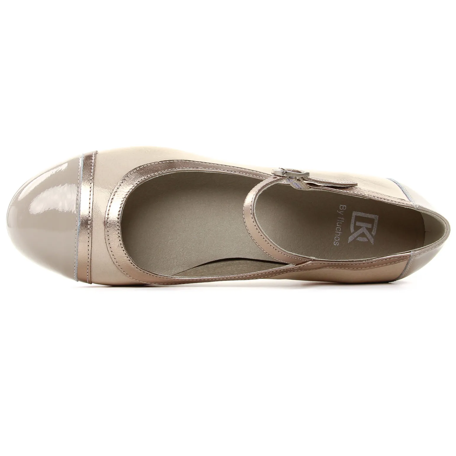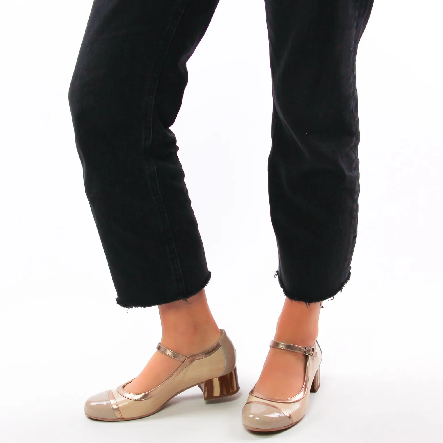 Babies Talon Confort de la marque Dorking de couleur beige doré. Élégantes et féminines ces babies à talon trotteur possèdent une tige en cuir vernis, un bout droit taupe ainsi que son contrefort, une bride à boucle et un liseré sur le décolleté dorés métallisés, un talon travaillé bois et or, doublure et première en microfibre : on adore !