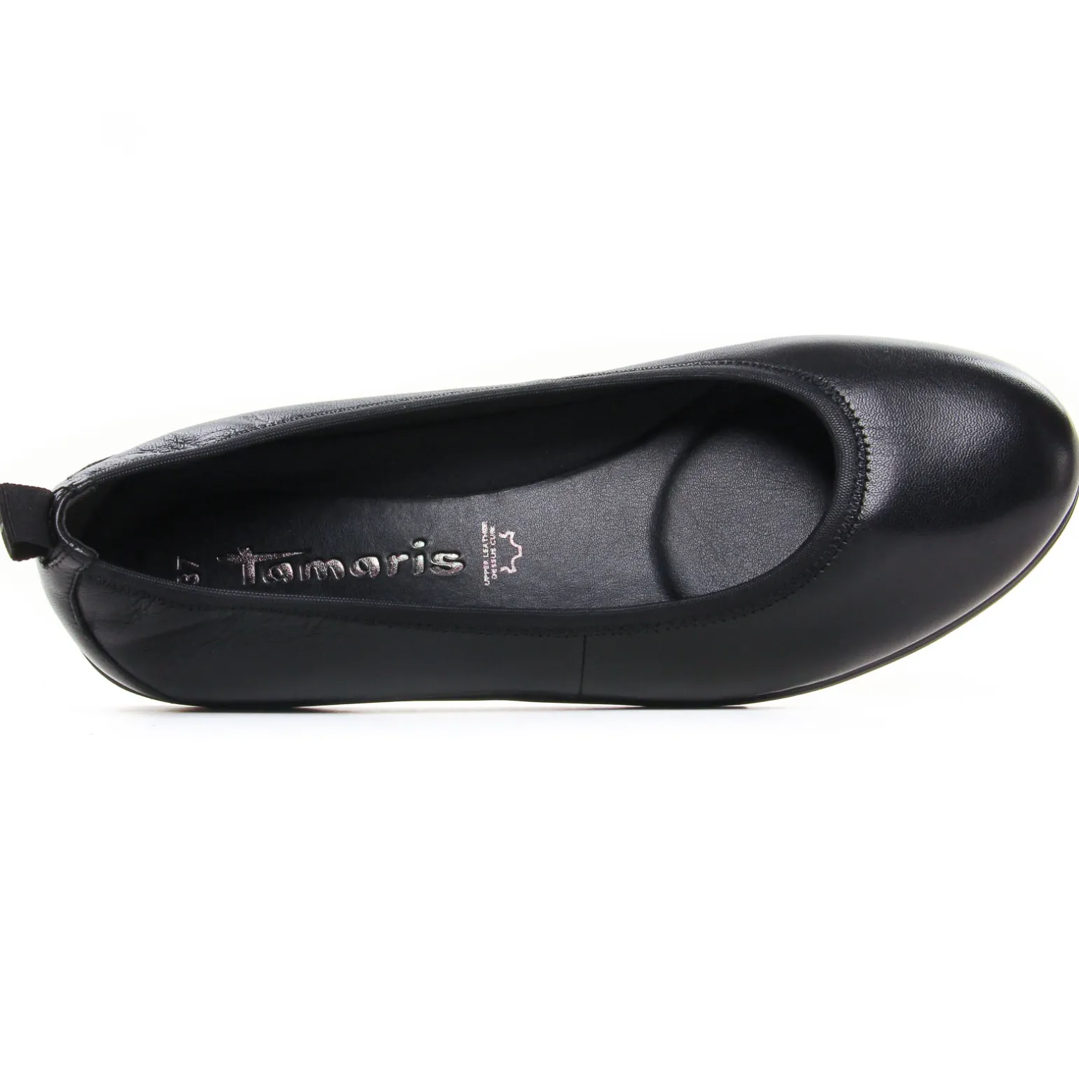 Ballerines Confort de la marque Tamaris de couleur noir. Jolies ballerines confort avec un dessus cuir et un bout rond, première avec amorti et amovible si besoin, une semelle plate en gomme élastomère, une version en cuir suédé marine, une autre en cuir lisse noir pour cette saison été 2025