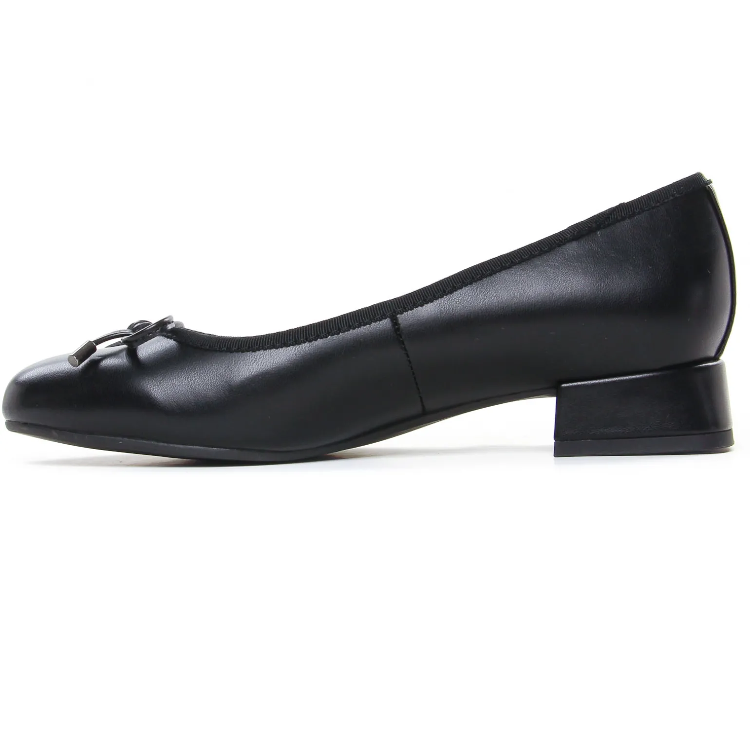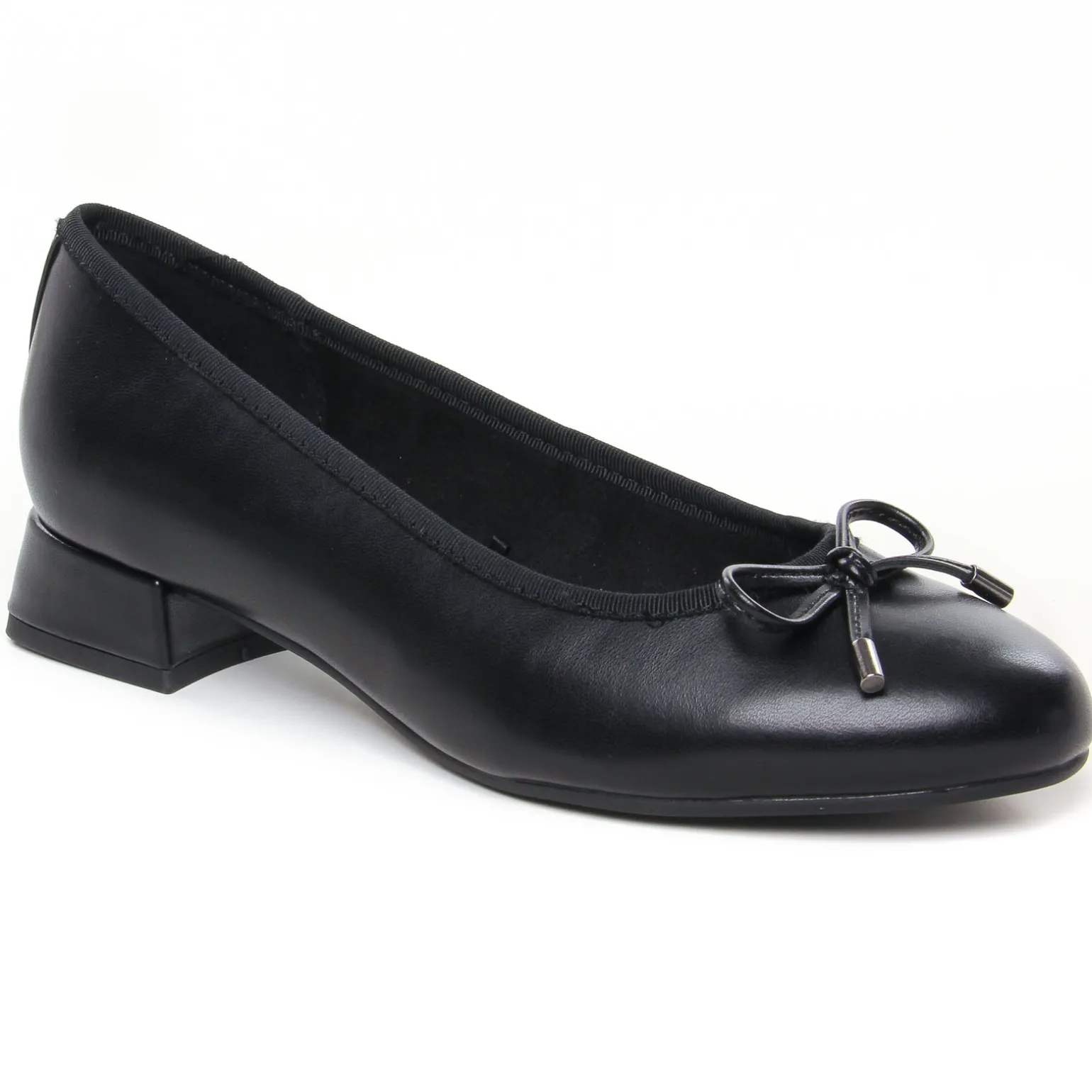 Ballerines Talon de la marque Marco Tozzi de couleur noir. Parfaites pour une tenue classique chic élégante, voici des ballerines en simili cuir lisse ou vernis noir, un petit talon en évasé haut de 3 cm, un petit nœud pour décorer le haut de l’empeigne, ballerines de la collection Vegan de chez Marco Tozzi championne de la mode à petit prix !