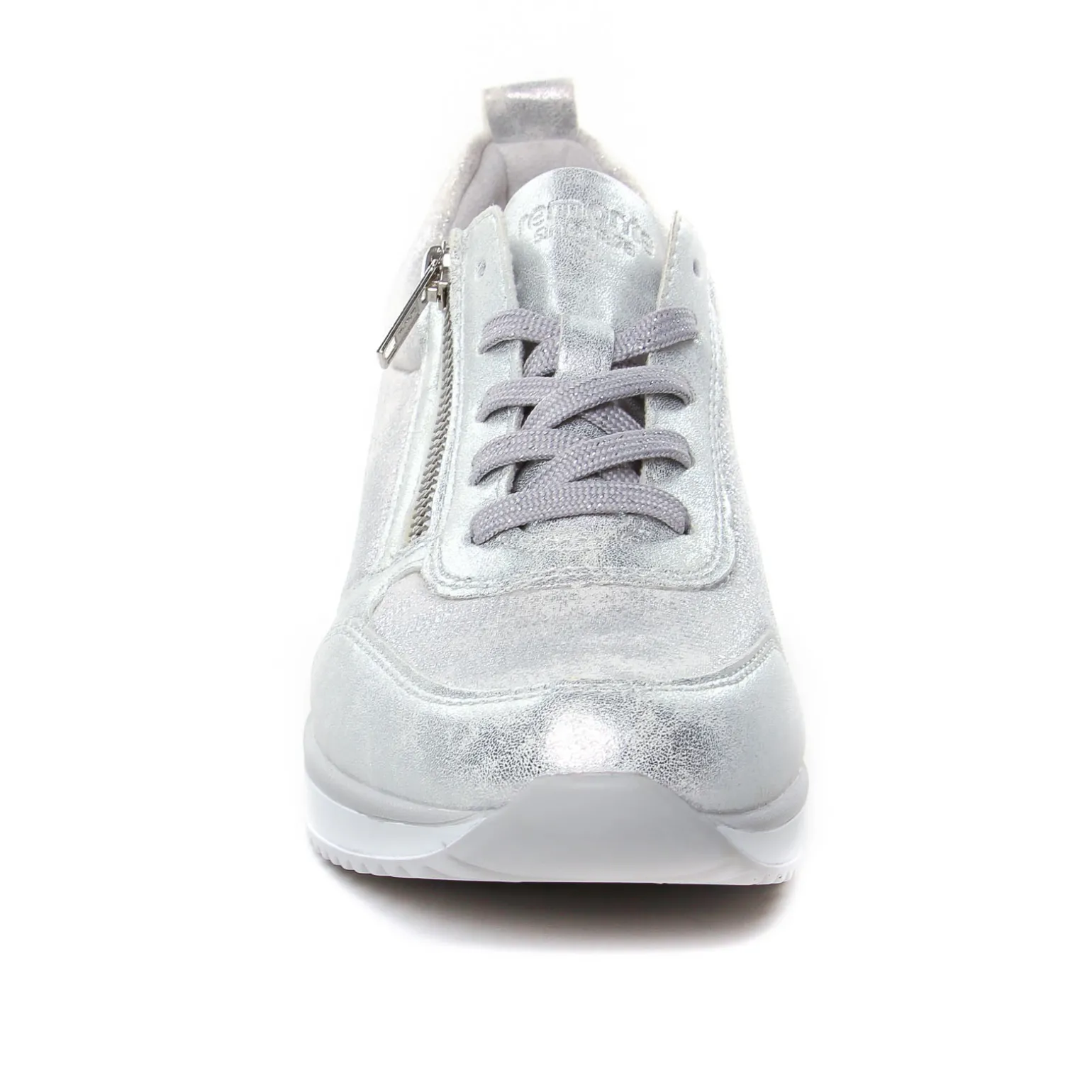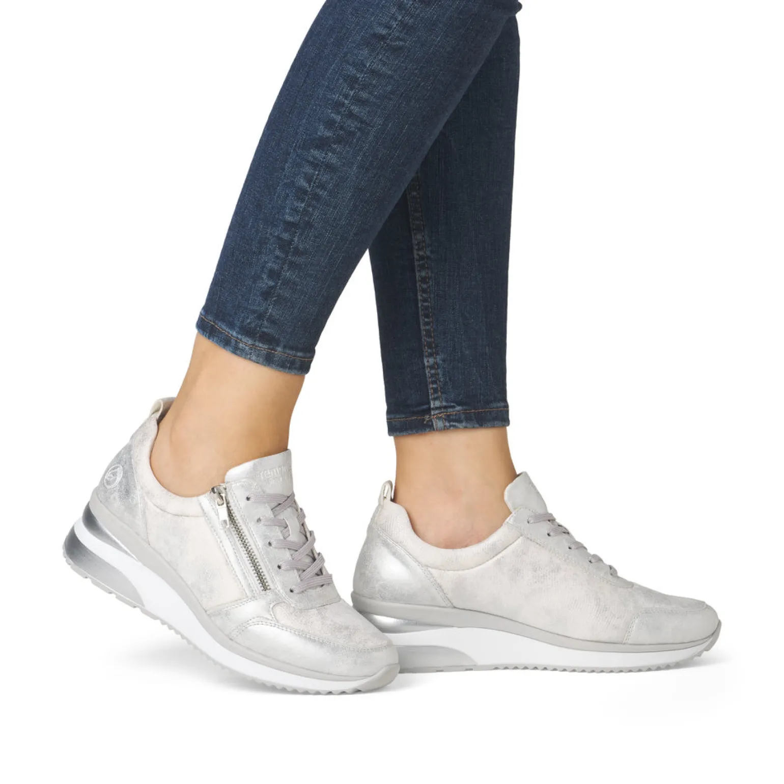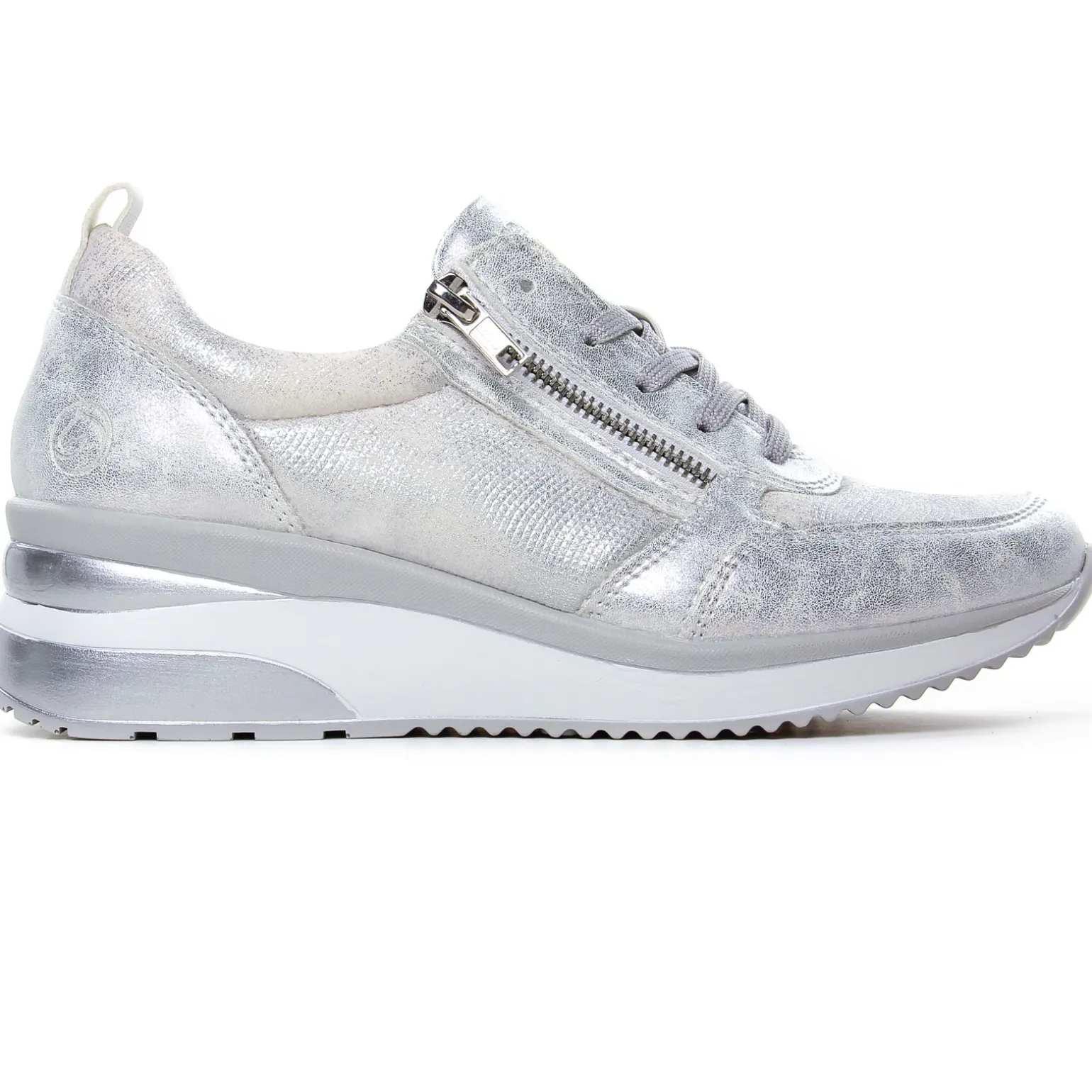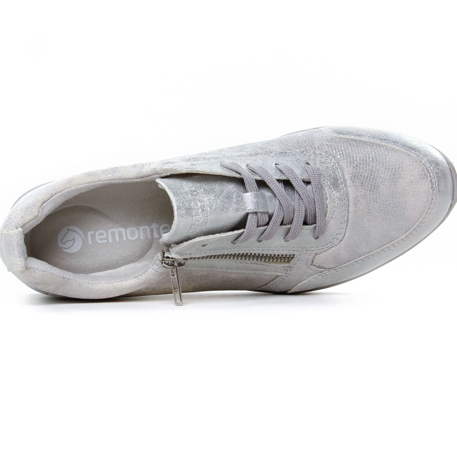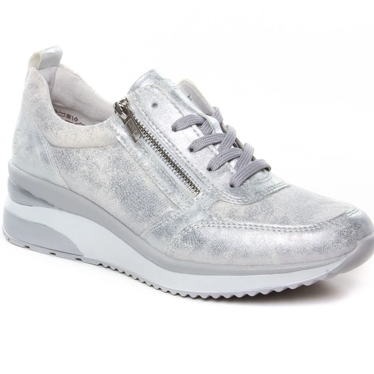 Baskets Compensees de la marque Remonte de couleur gris argent. Baskets compensées haute de 4,5 cm au talon, tige bi-matière, sneakers très légères dans une teinte taupe ou grise argenté, fermeture à glissière pratique, semelle intérieure Memo Soft à mémoire de forme très confort, amovible si besoin