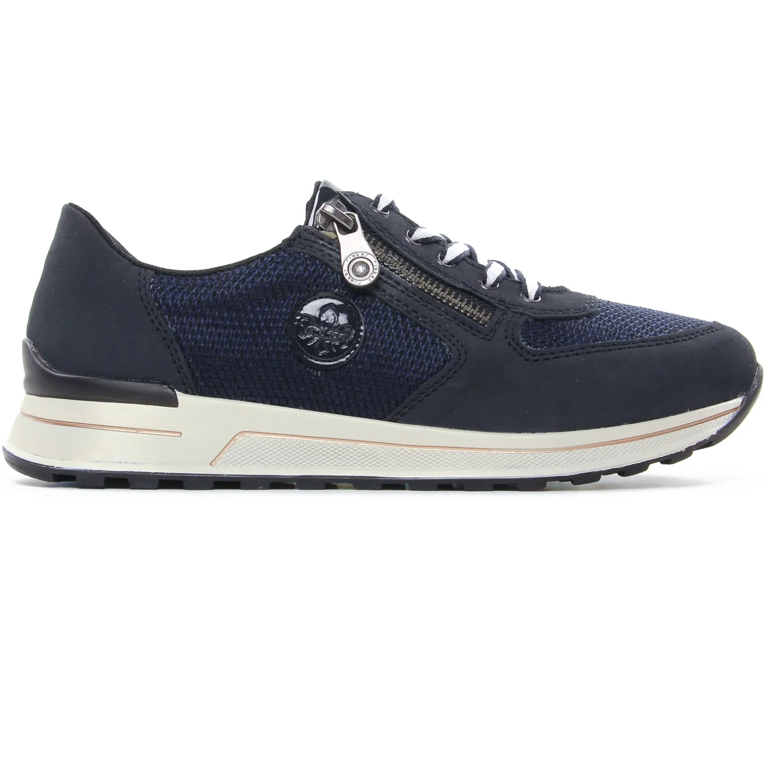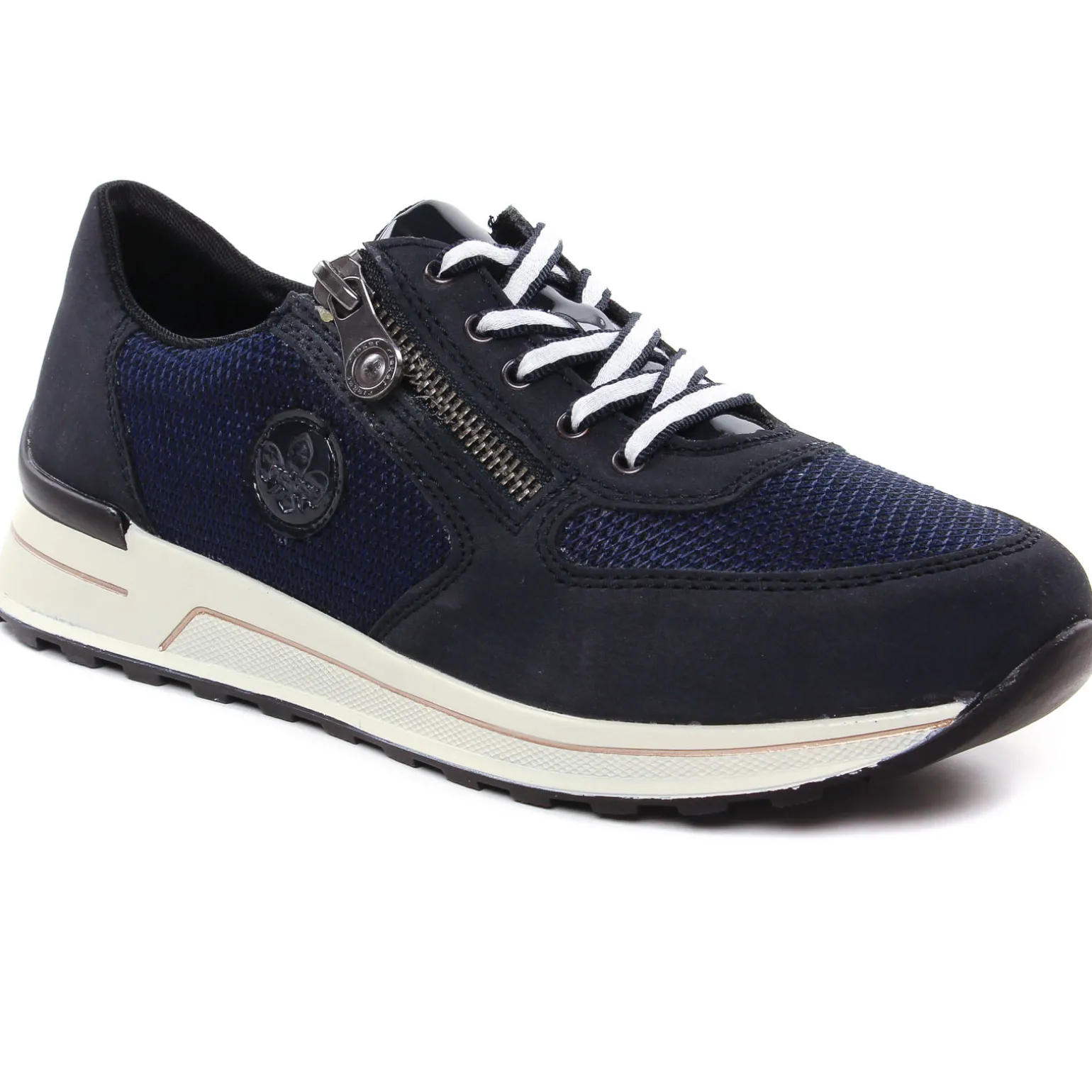 Baskets Compensees de la marque Rieker de couleur bleu marine. Tige en textile bleu marine, un zip sur le coup de pied pour les chausser facilement, une première amovible ergonomique très confortable, une semelle blanche avec 3 cm sous talon, lacet blanc et bleu marine, baskets Rieker nouvelle collection printemps 2024