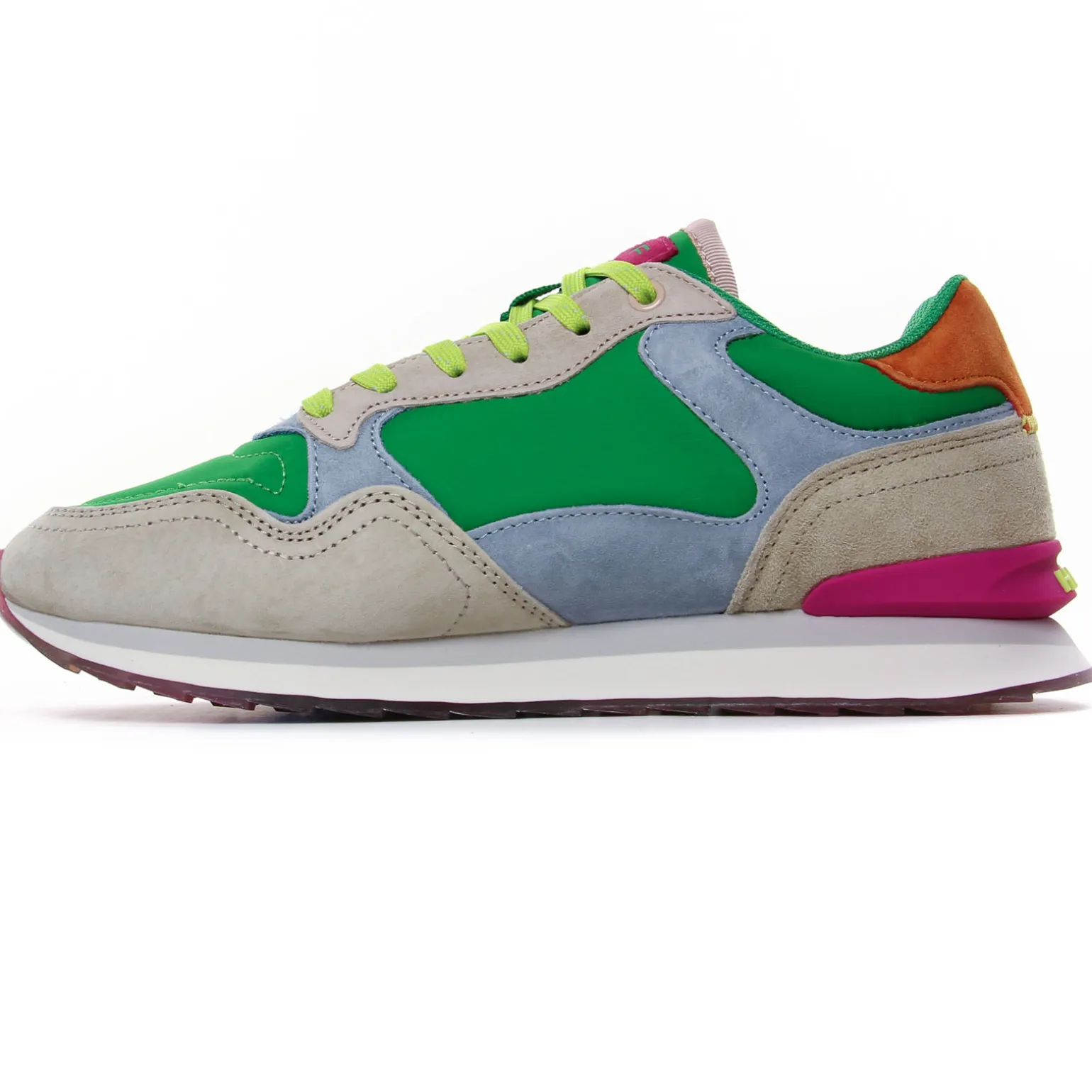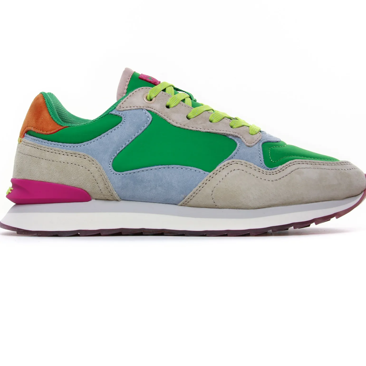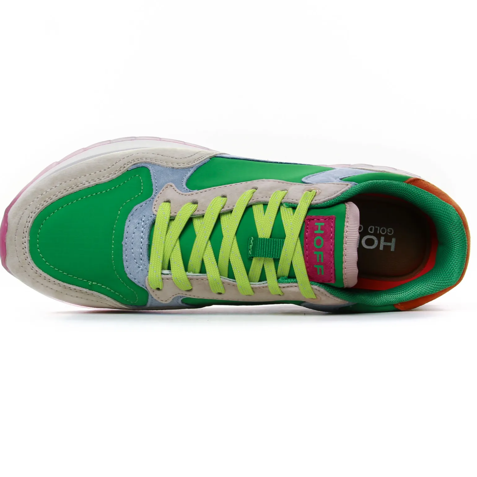 Baskets Mode de la marque Hoff de couleur vert multi. Sneakers modes très légères avec une première amovible, une tige mariant les textures de textiles et de suédines, un nom de ville pour chaque création Hoff pour cette nouvelle collection été 2025, Pour ces baskets femme c’est la ville australienne Gold Coast qui est à l’honneur