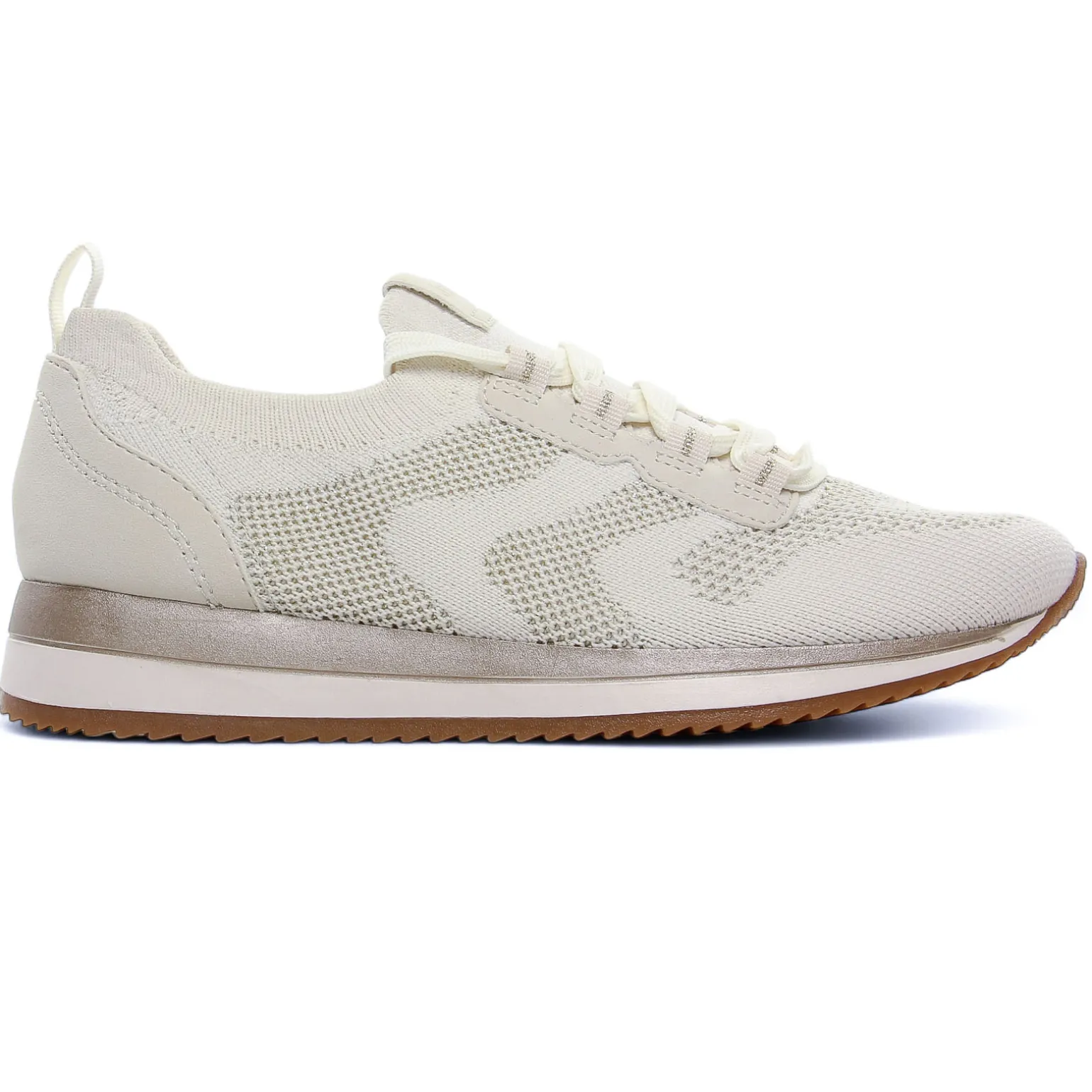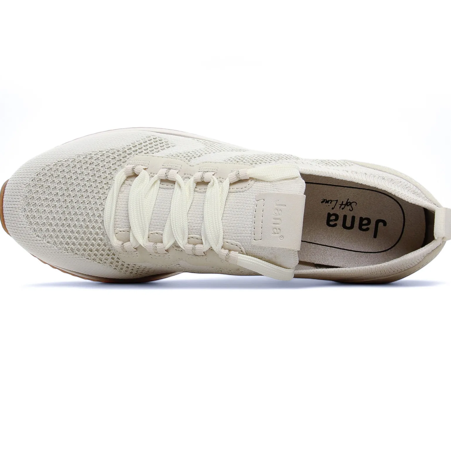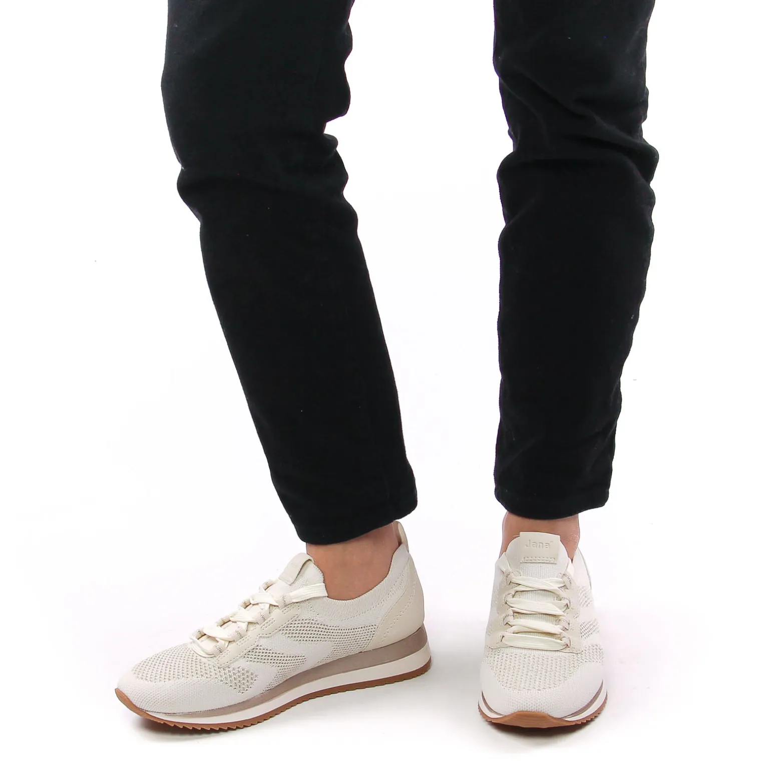 Baskets Mode de la marque Jana de couleur beige doré. hyper légères, petit couteau suisse de votre garde robe sporty chic, jolies baskets chaussettes en toile ajourée disponibles en vert ou en beige, nouvelle collection Jana printemps été 2025