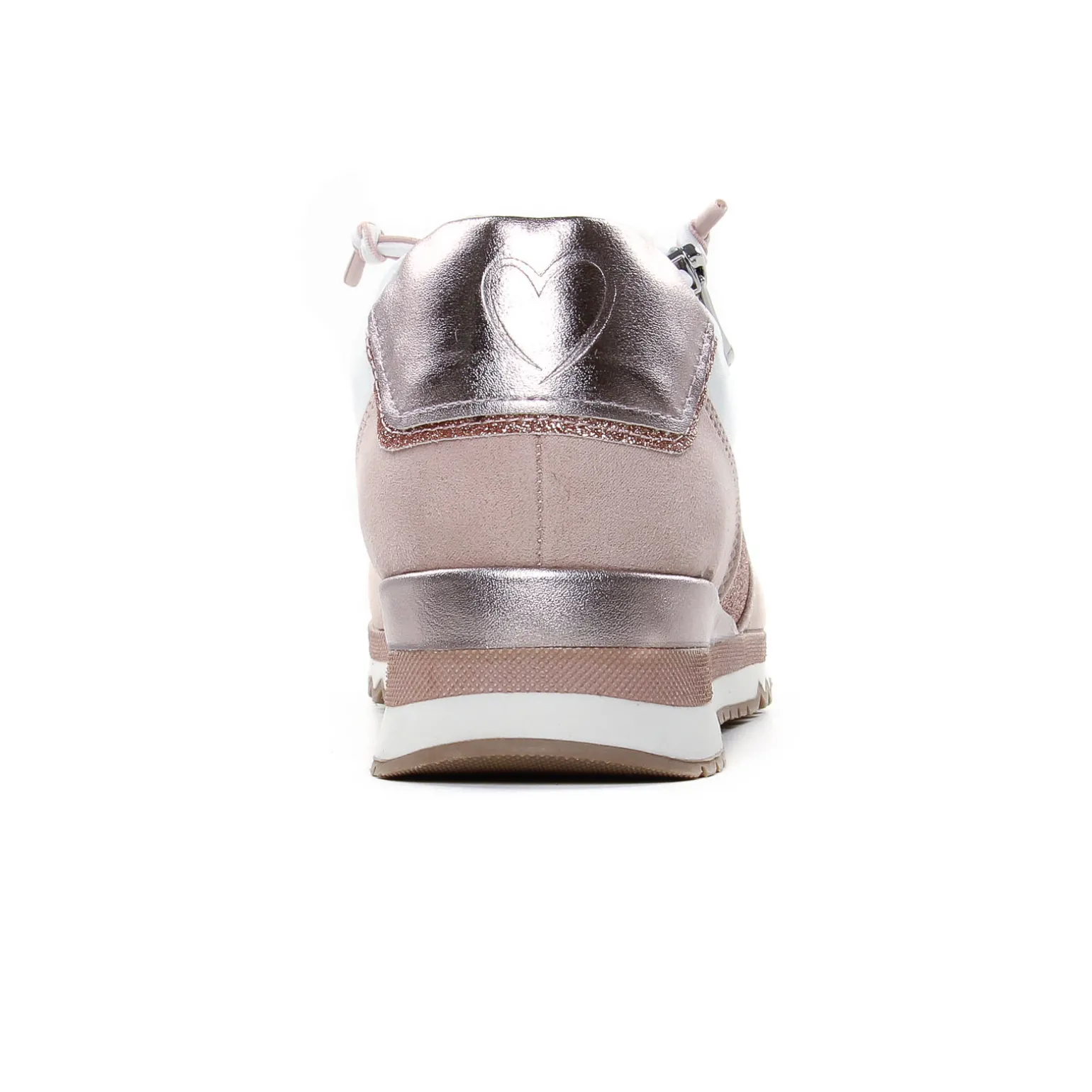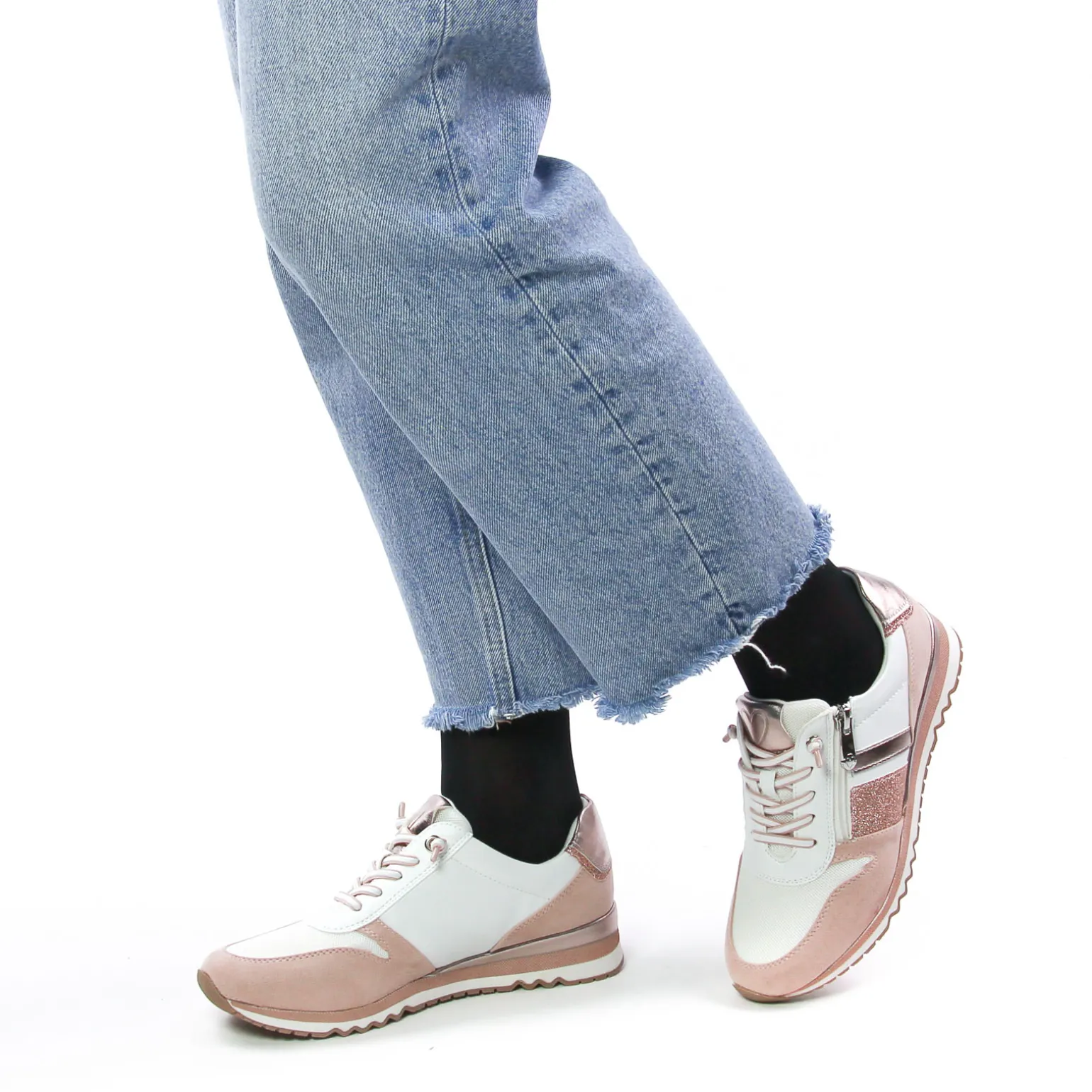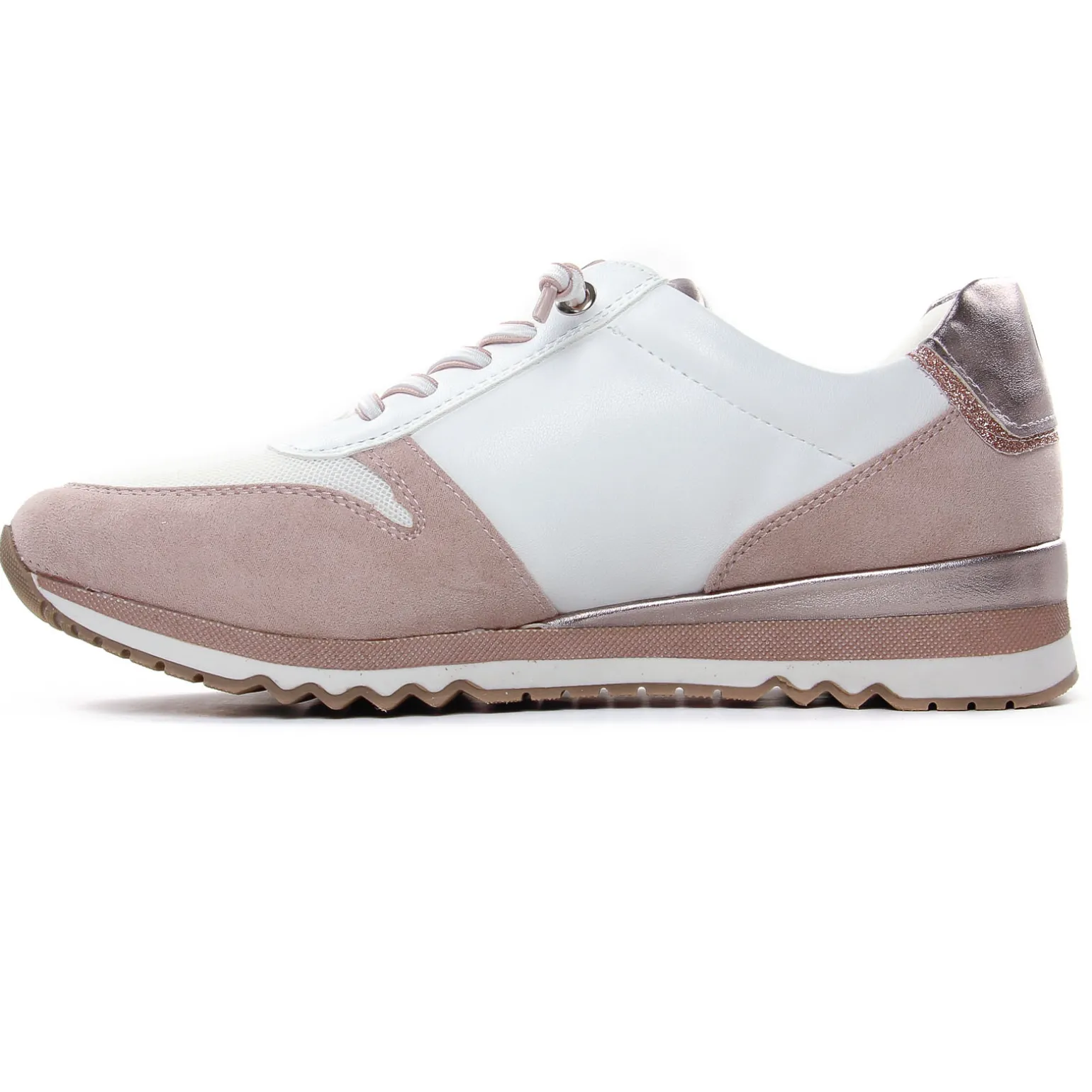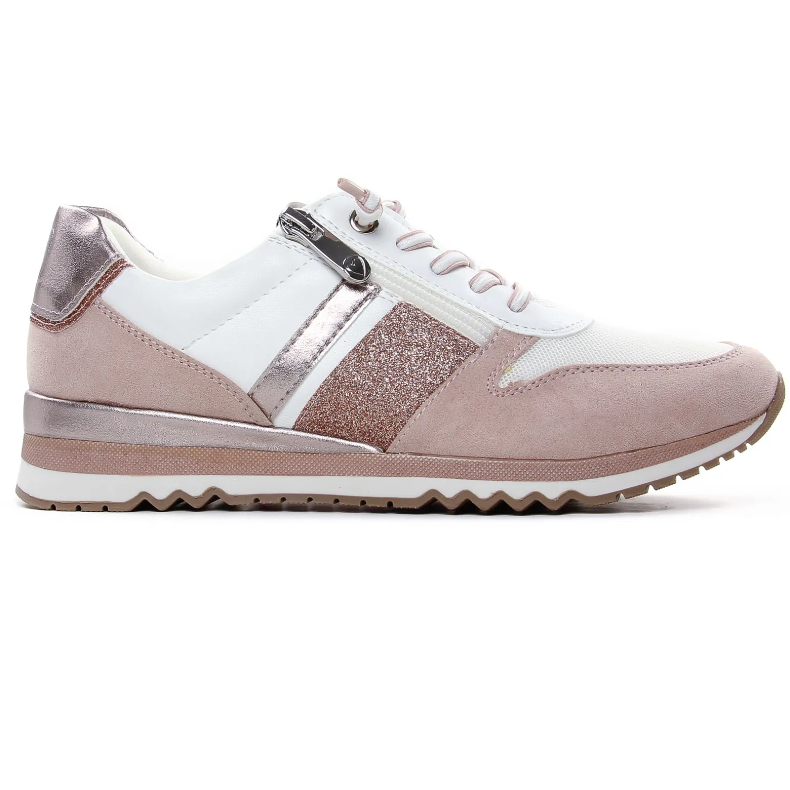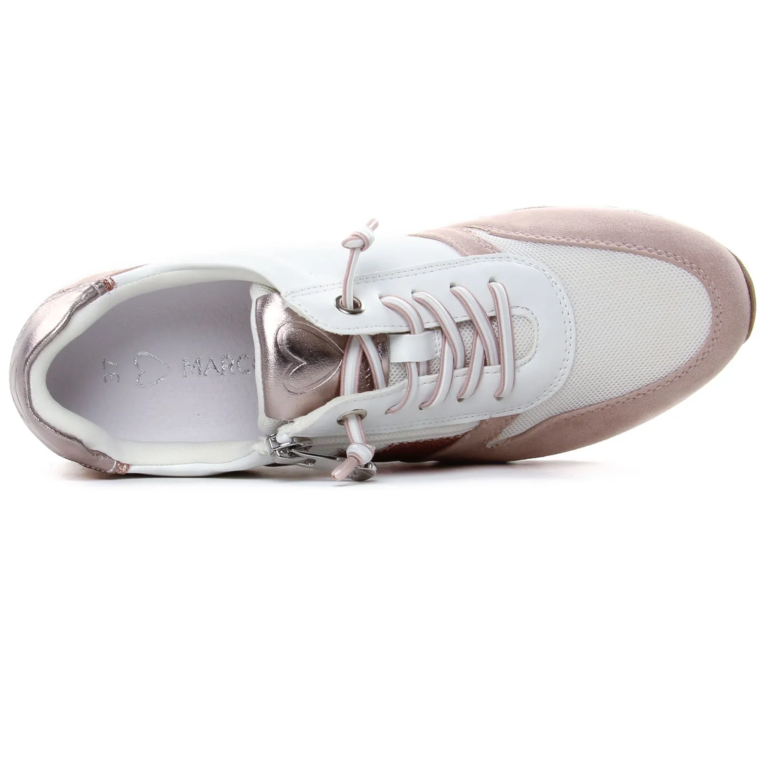 Baskets Mode de la marque Marco Tozzi de couleur blanc rose. Sneaker pour femme confortable et élégante, tige textile et simi beige effet nubuck, baskets habillée, une première de propreté Feel Me confortable, paillettes or et un empiècement or à l’arrière de la chaussure, un zip et des lacets élastiqués qui permettent un effilement sans effort !