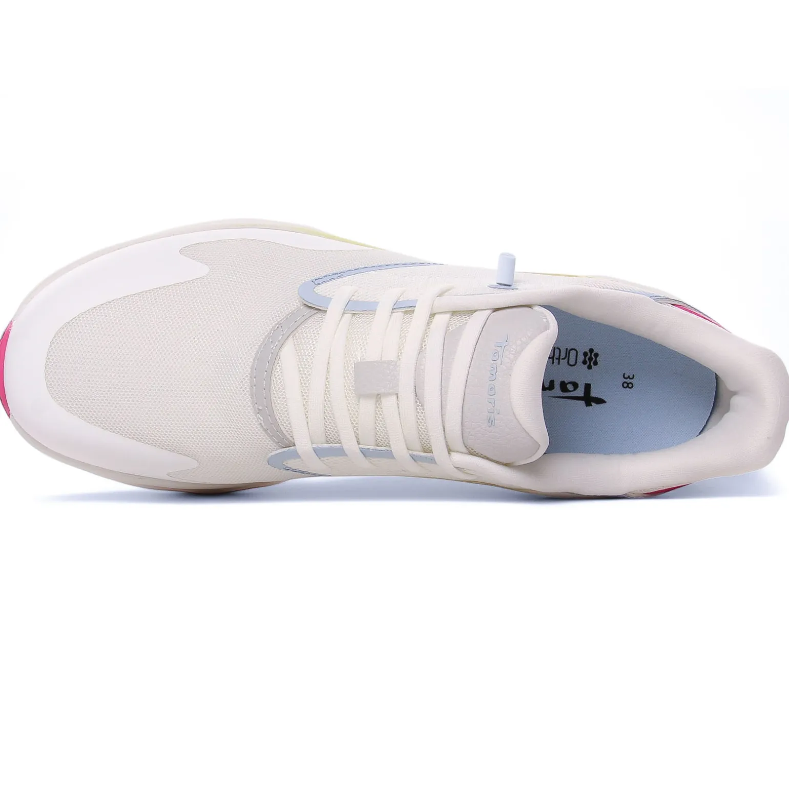Baskets Mode de la marque Tamaris de couleur blanc multicolore. Sneakers basses de la gamme Move Light synonyme de légèreté ! Baskets qui se distinguent par leur design teinté de gaieté et de modernité ! Une première de propreté Touch It hyper confortable, un laçage élastique innovant qui permet un enfilage facile. Le maillage respirant et la semelle intérieure OrthoLite offrent une aération optimale : un look sportif et dynamique par Tamaris !