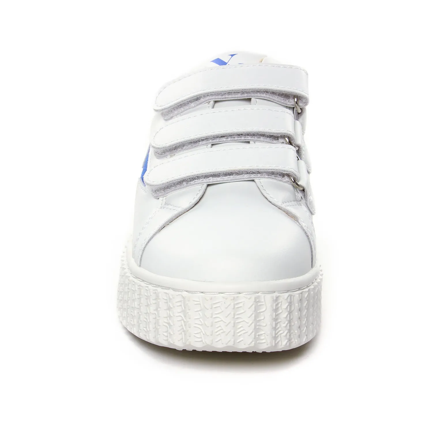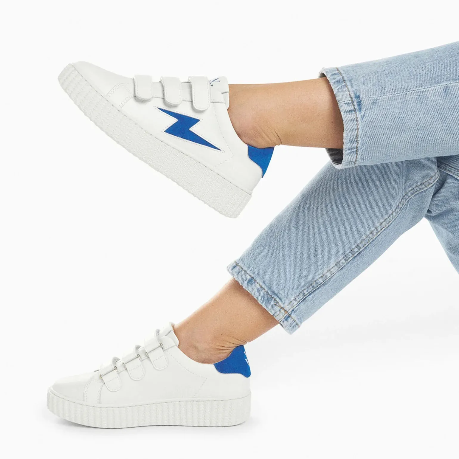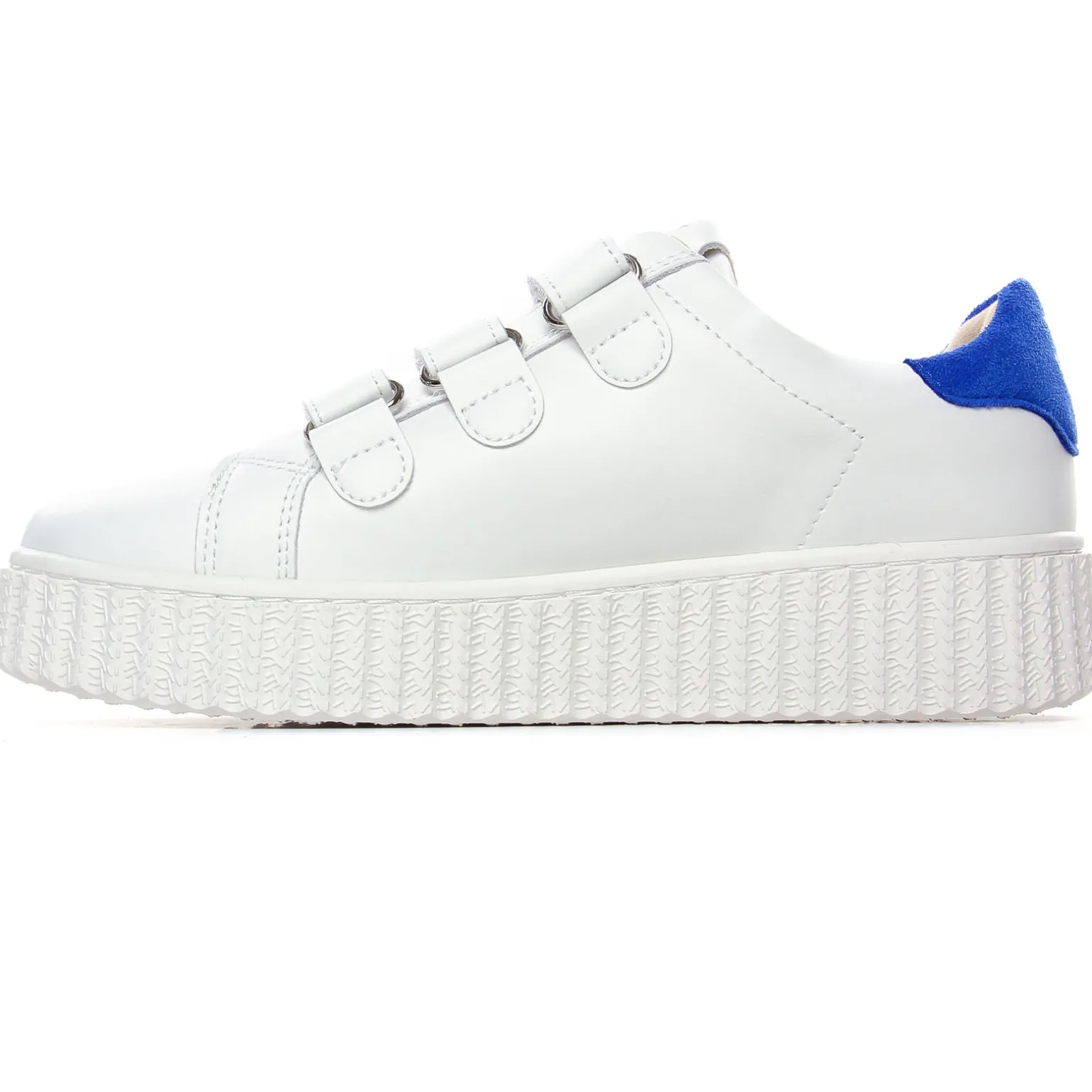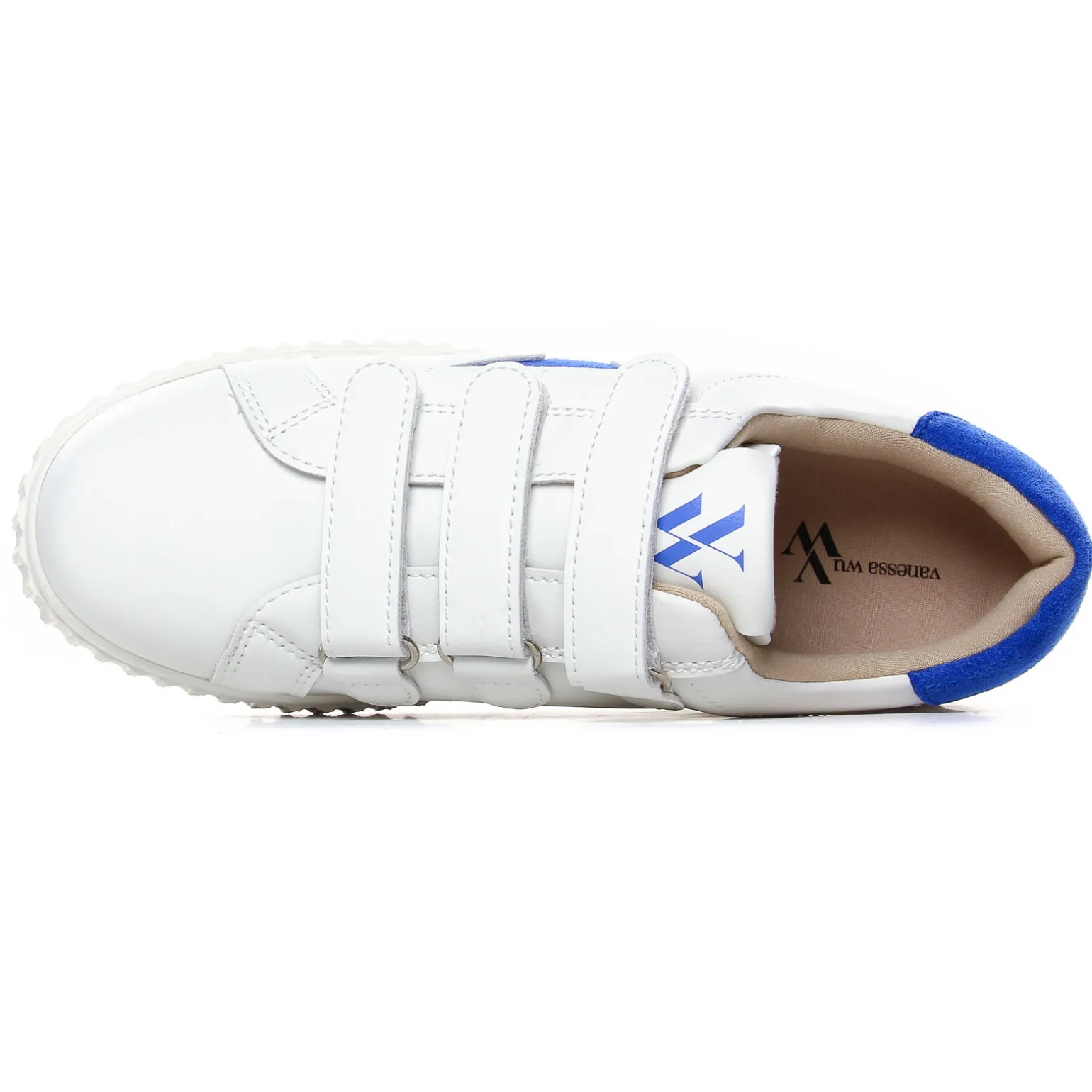 Baskets Mode de la marque Vanessa Wu de couleur blanc bleu. Baskets blanches chics pour femme à triples scratchs blancs, tendances et confortables, un style moderne sporty chic ! Tennis avec des inserts en textile coloré, l’éclair en insert caractéristique de Vanessa WU, les tennis mode plateforme Vicky reviennent pour cette nouvelle collection 2025 !
