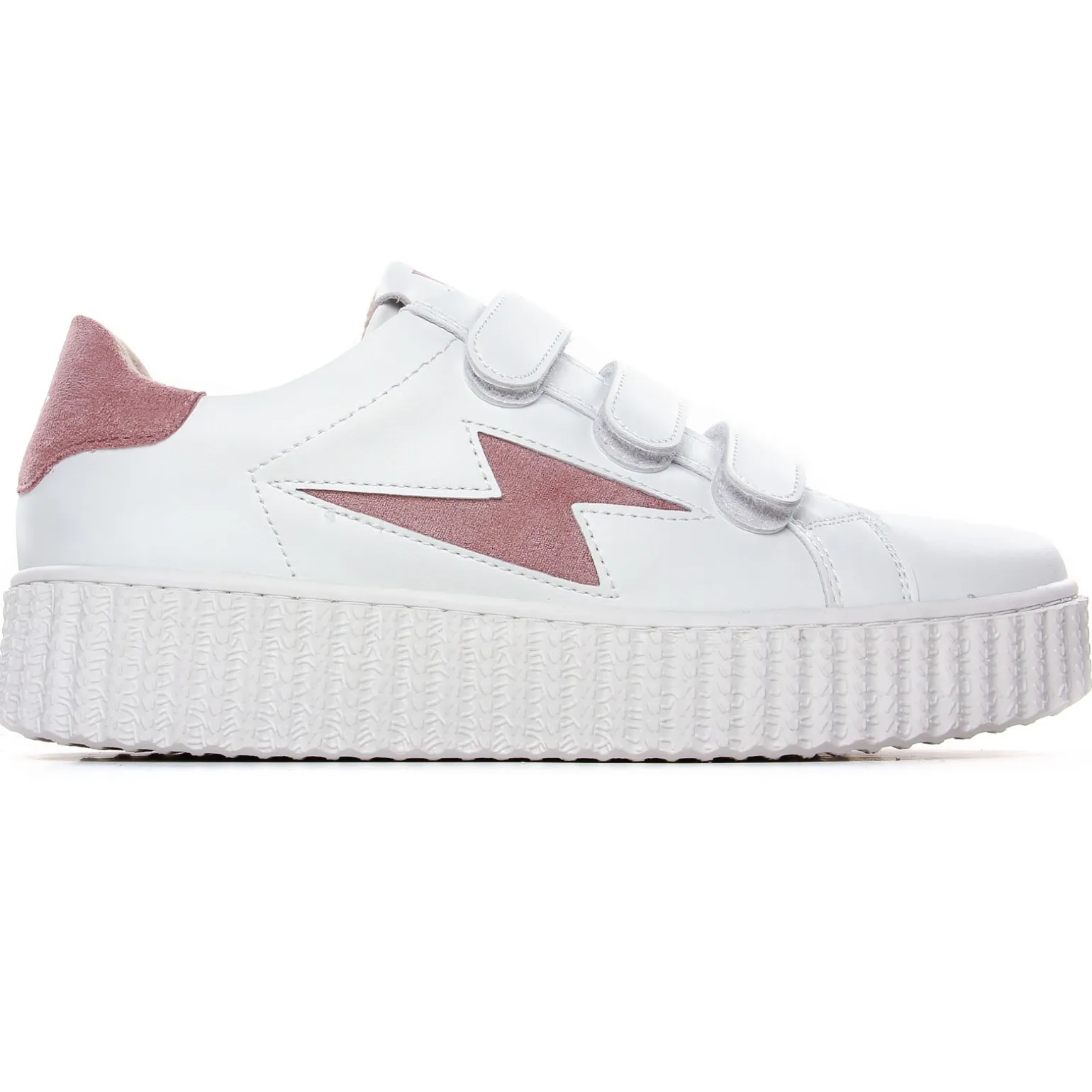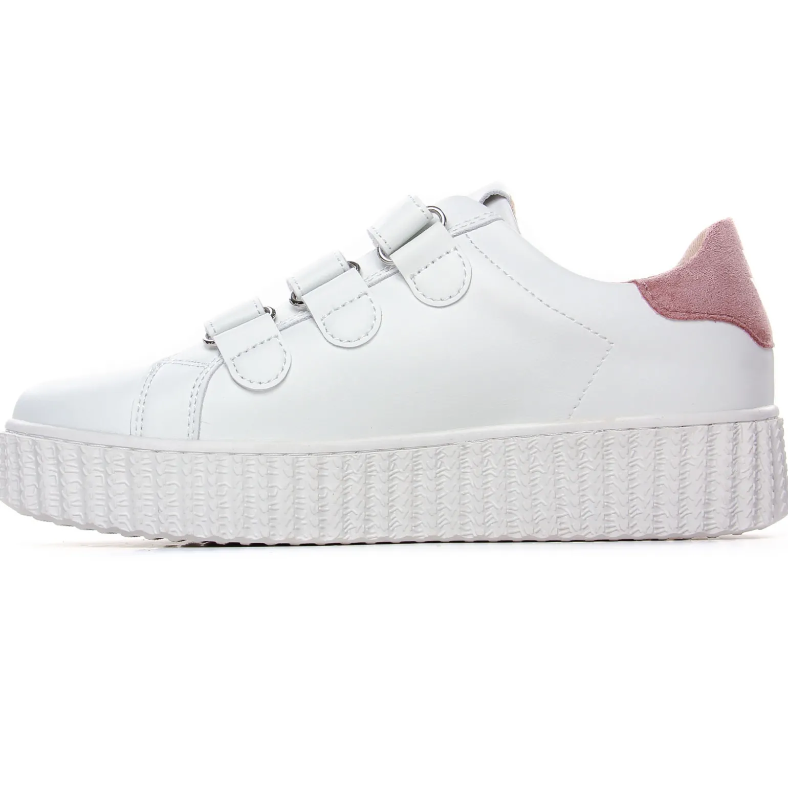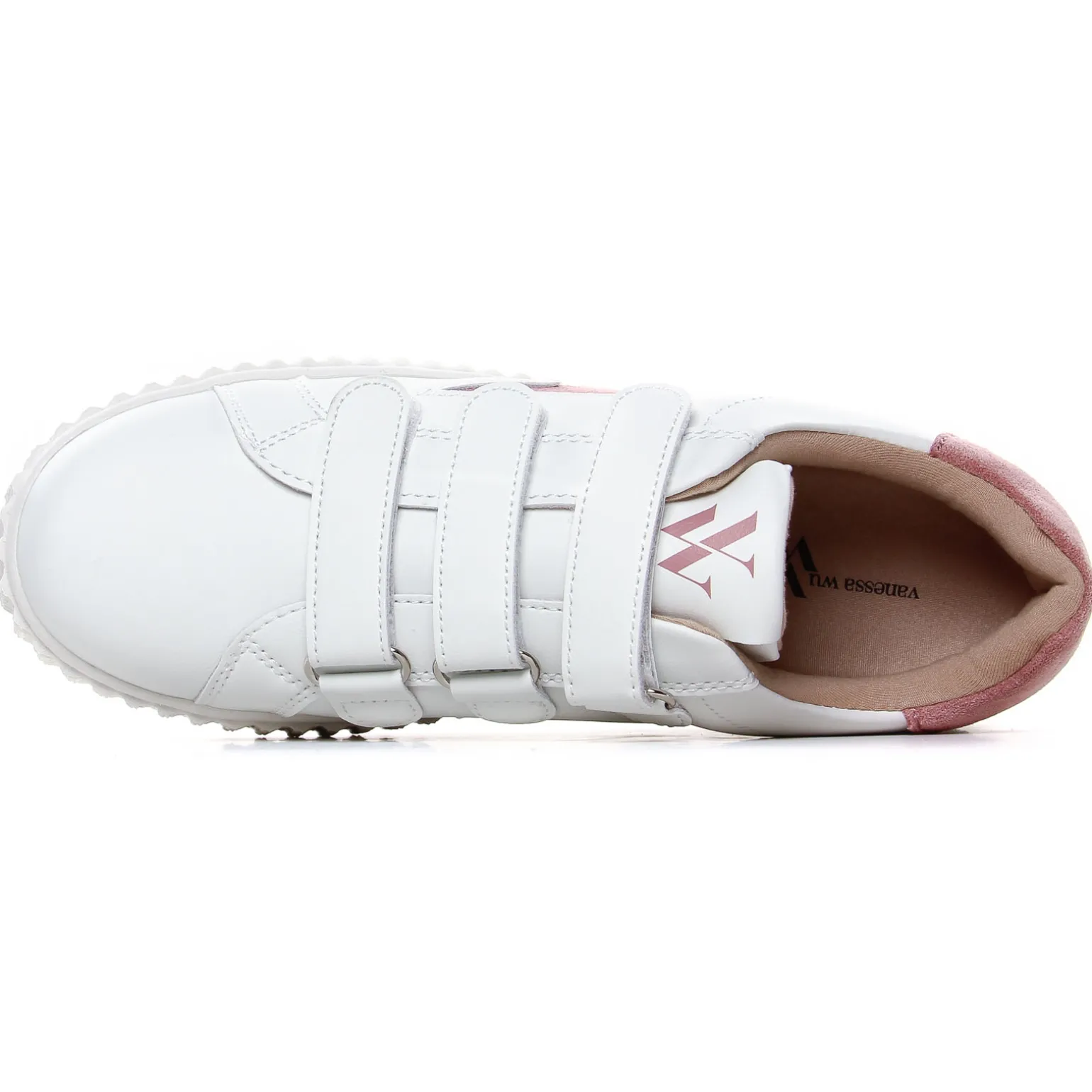 Baskets Mode de la marque Vanessa Wu de couleur blanc vieux rose. Baskets blanches chics pour femme à triples scratchs blancs, tendances et confortables, un style moderne sporty chic ! Tennis avec des inserts en textile coloré, l’éclair en insert caractéristique de Vanessa WU, les tennis mode plateforme Vicky reviennent pour cette nouvelle collection 2025 !