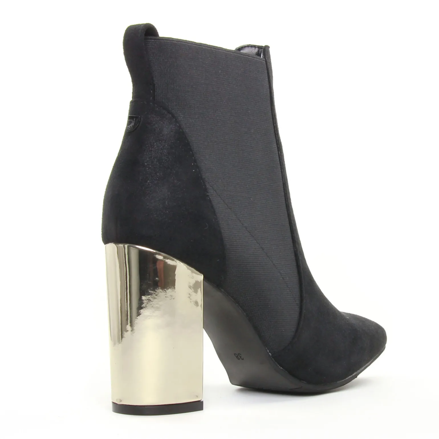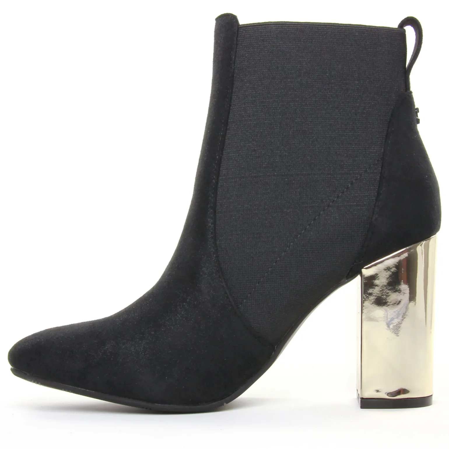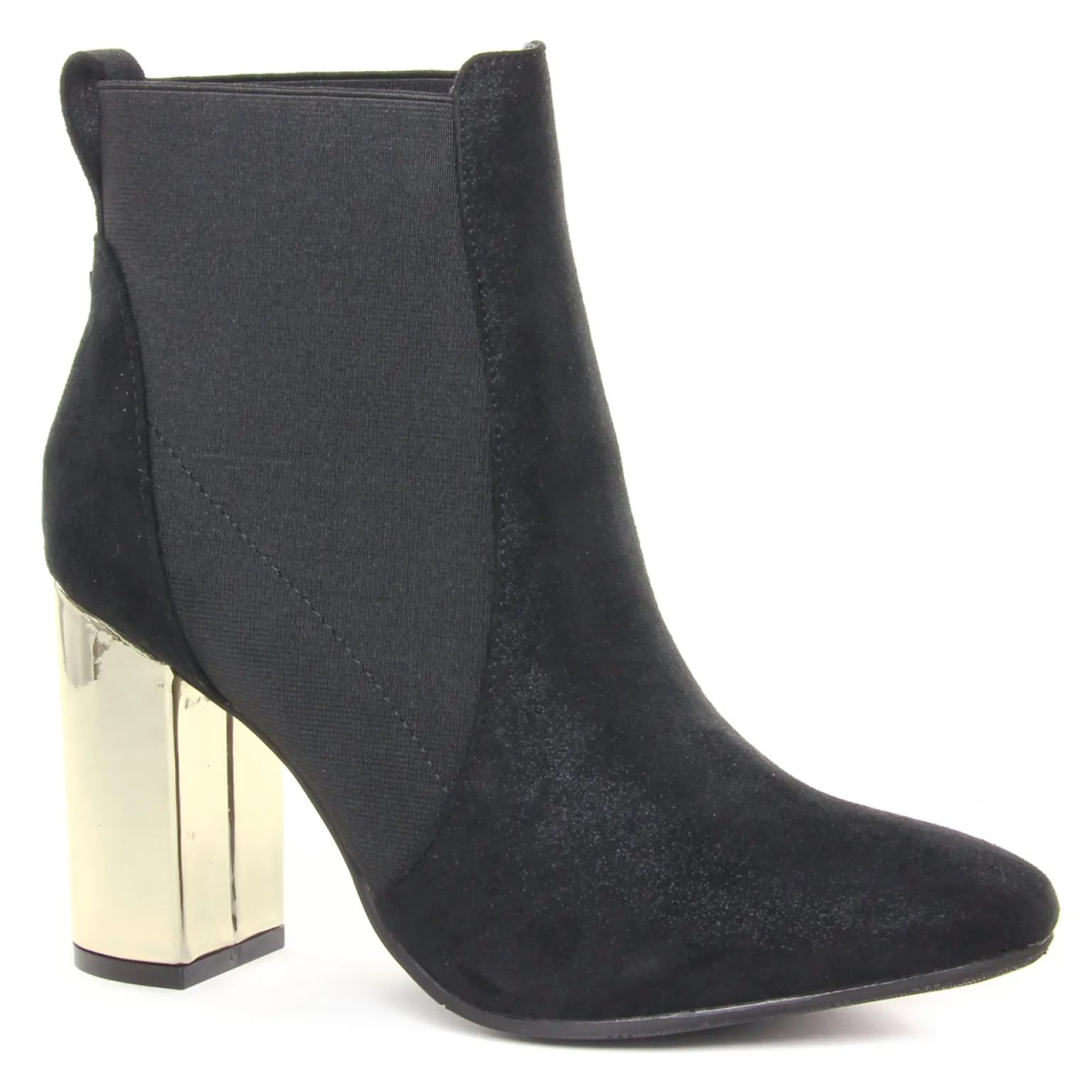 Boots Élastiquées de la marque Gioseppo de couleur noir doré. Revisite glamour et moderne de la boots Chelsea, bottines élastiquée en textile avec un talon doré haut de 9 cm, doublure et première cuir et textile, nouvelle collection de la marque de chaussures espagnole Gioseppo automne hiver 2019.