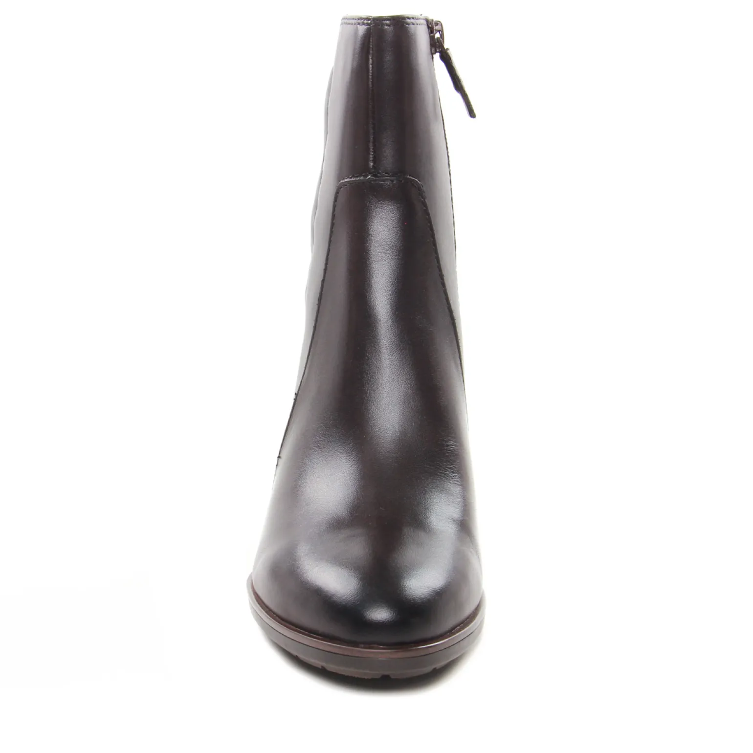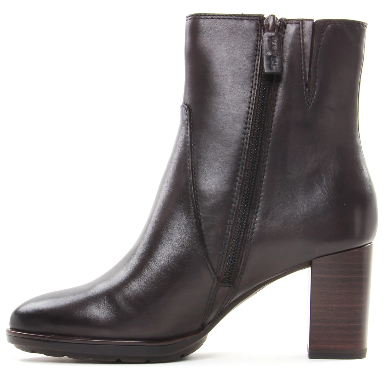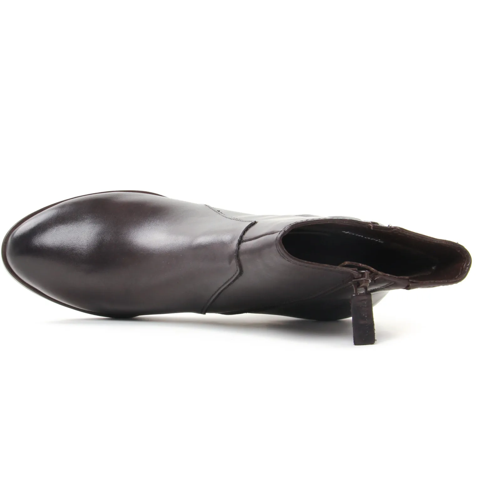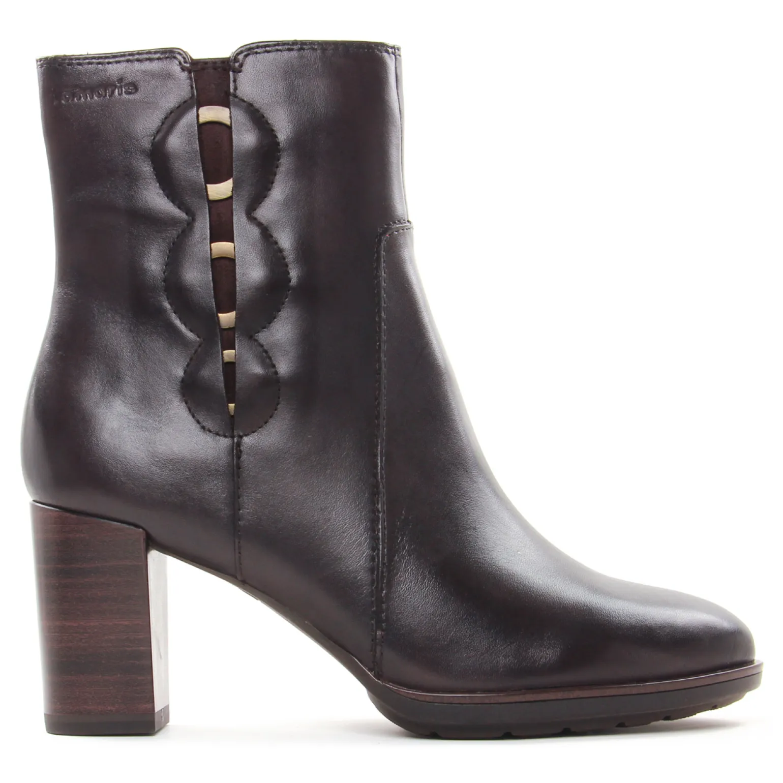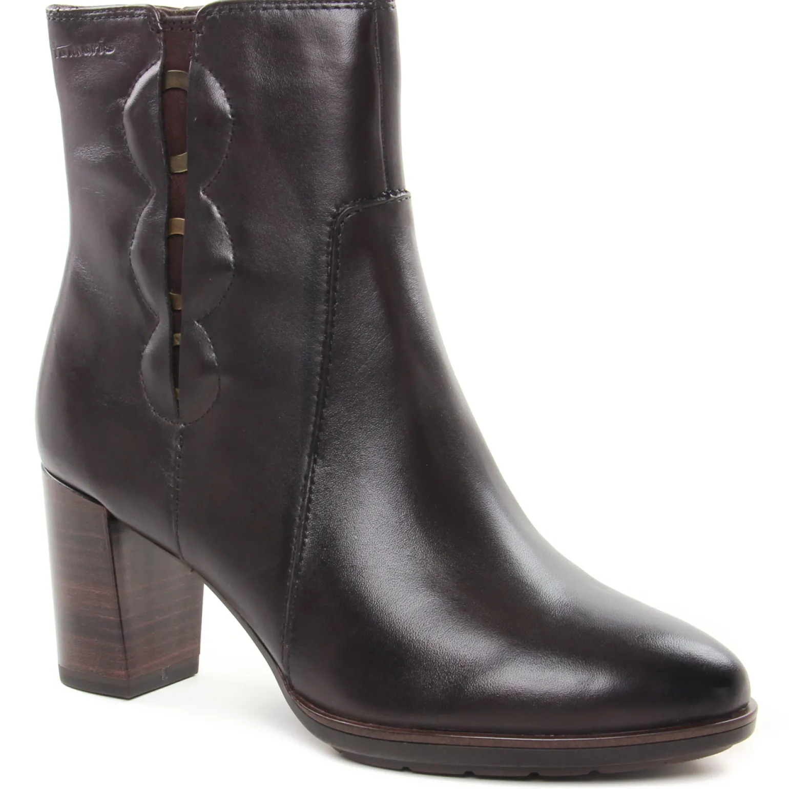 Boots Talon de la marque Tamaris de couleur noir café. Boots mode avec une tige haute en cuir, une tige design pour un rendu original et tendance, ganse élastique pour un meilleur chaussant, une belle noires café, talon haut de 7.5 cm, Tamaris nouvelle collection hiver 2021.