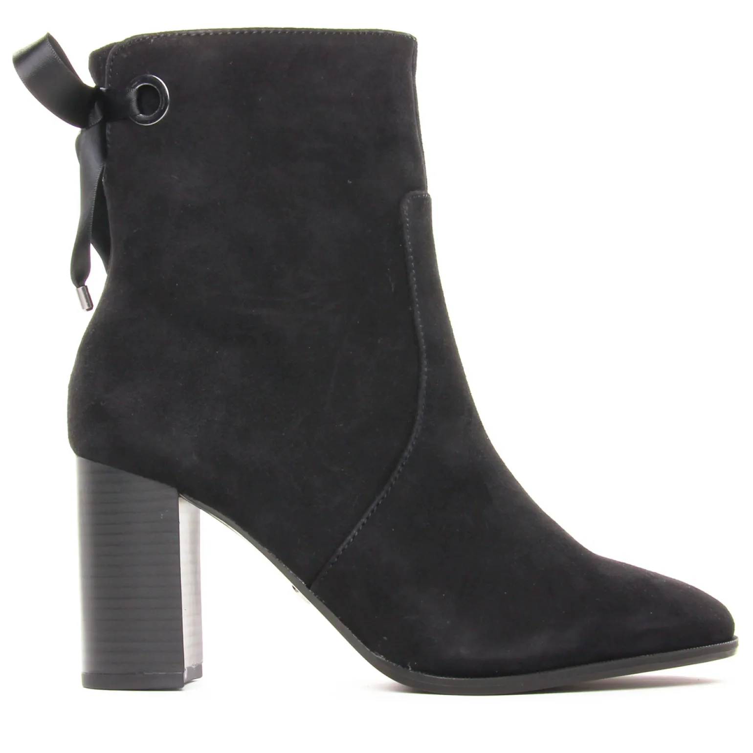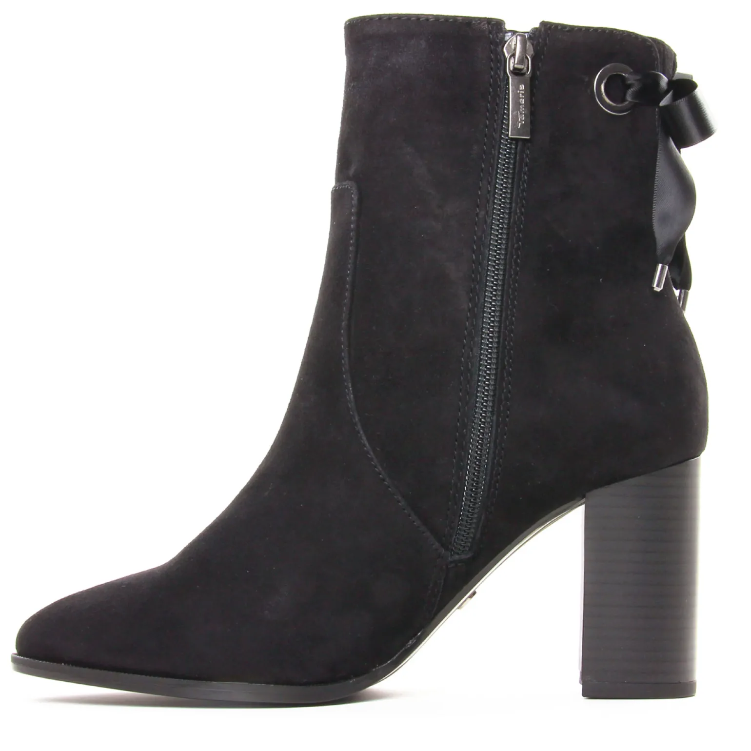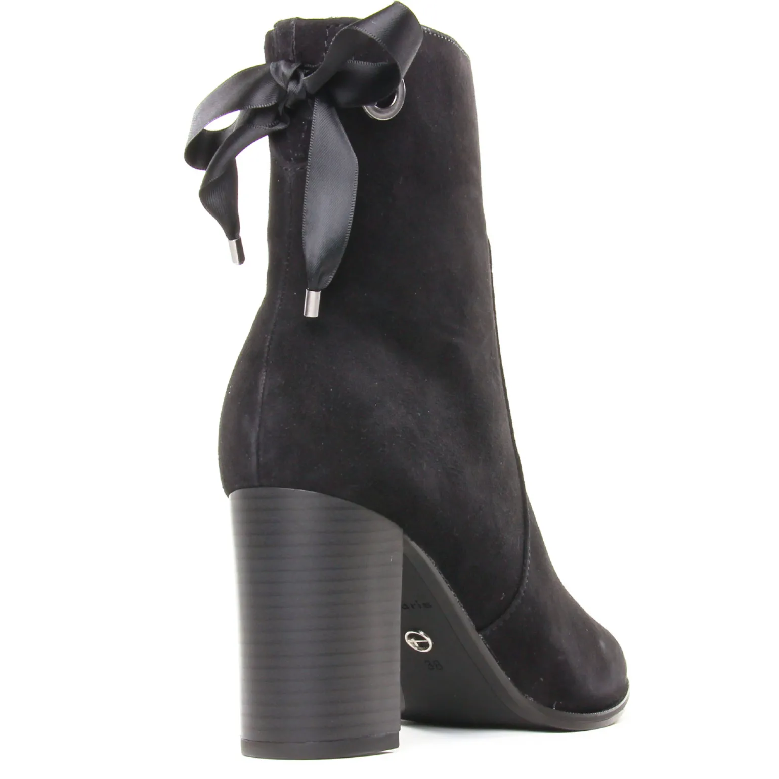 Boots de la marque Tamaris de couleur noir. Boots en cuir suédé nubuck noir ou vert kaki, petit soufflet en haut de tige à l’arrière avec un lacets ruban, tige haute de 10 cm environ au dessus du coup de pied, talon bloc haut de 8 cm breveté, doublure et première textile, bottines glamour et fémine de la nouvelle collection hiver 2019 de chez Tamaris.