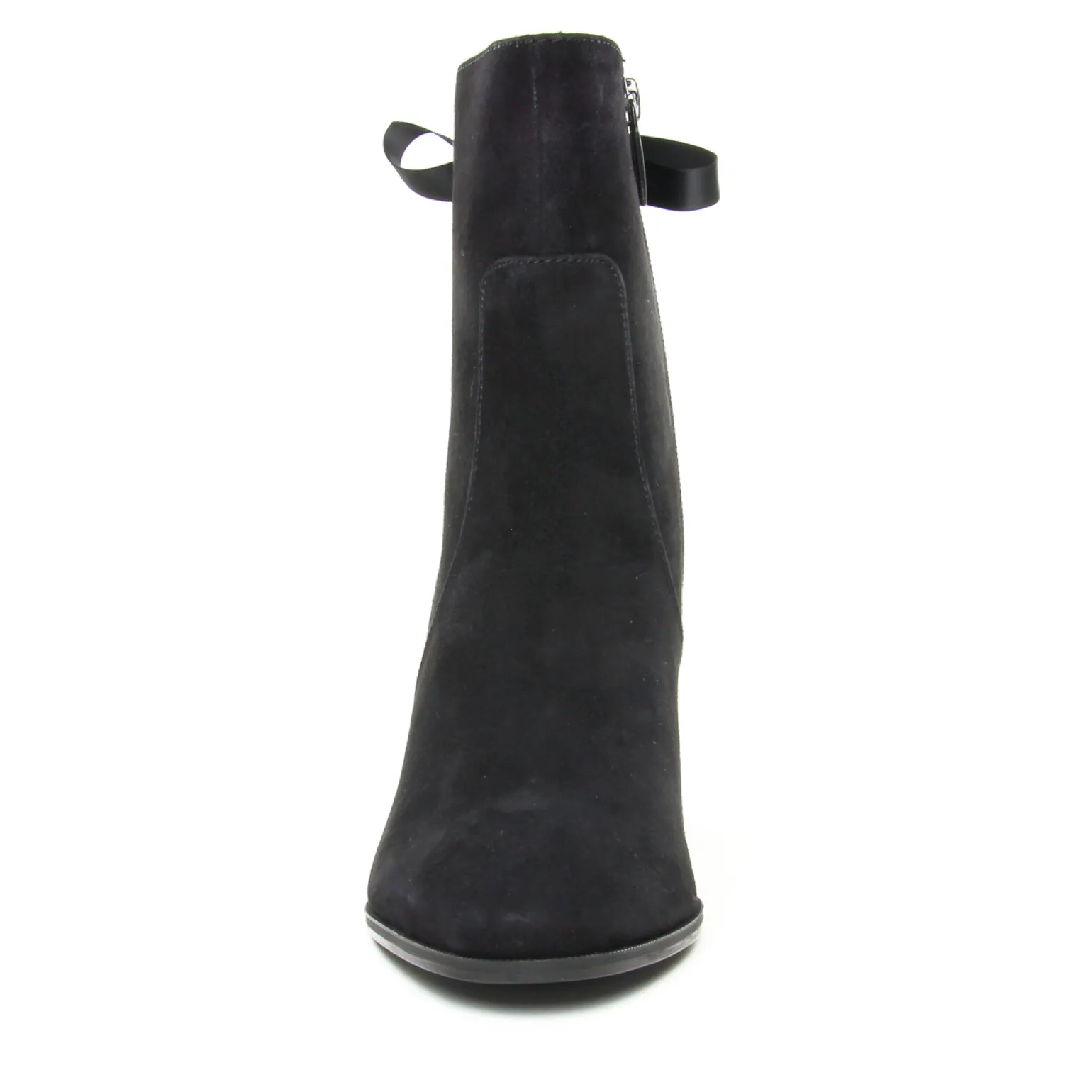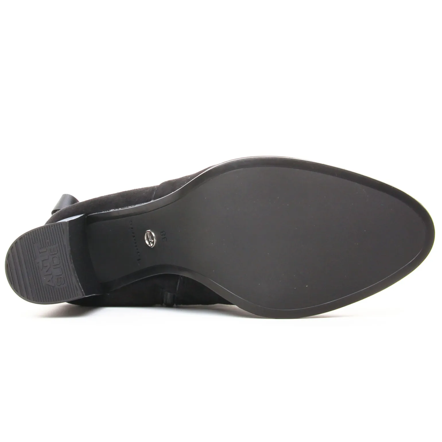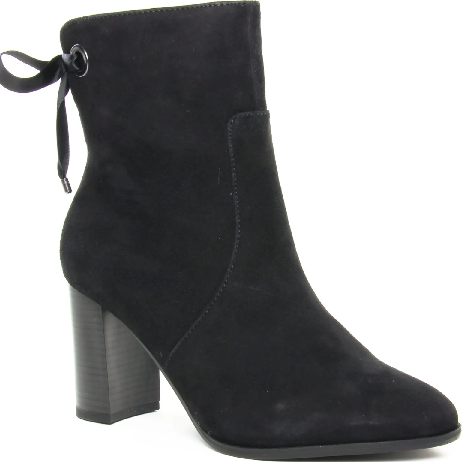 Boots de la marque Tamaris de couleur noir. Boots en cuir suédé nubuck noir ou vert kaki, petit soufflet en haut de tige à l’arrière avec un lacets ruban, tige haute de 10 cm environ au dessus du coup de pied, talon bloc haut de 8 cm breveté, doublure et première textile, bottines glamour et fémine de la nouvelle collection hiver 2019 de chez Tamaris.