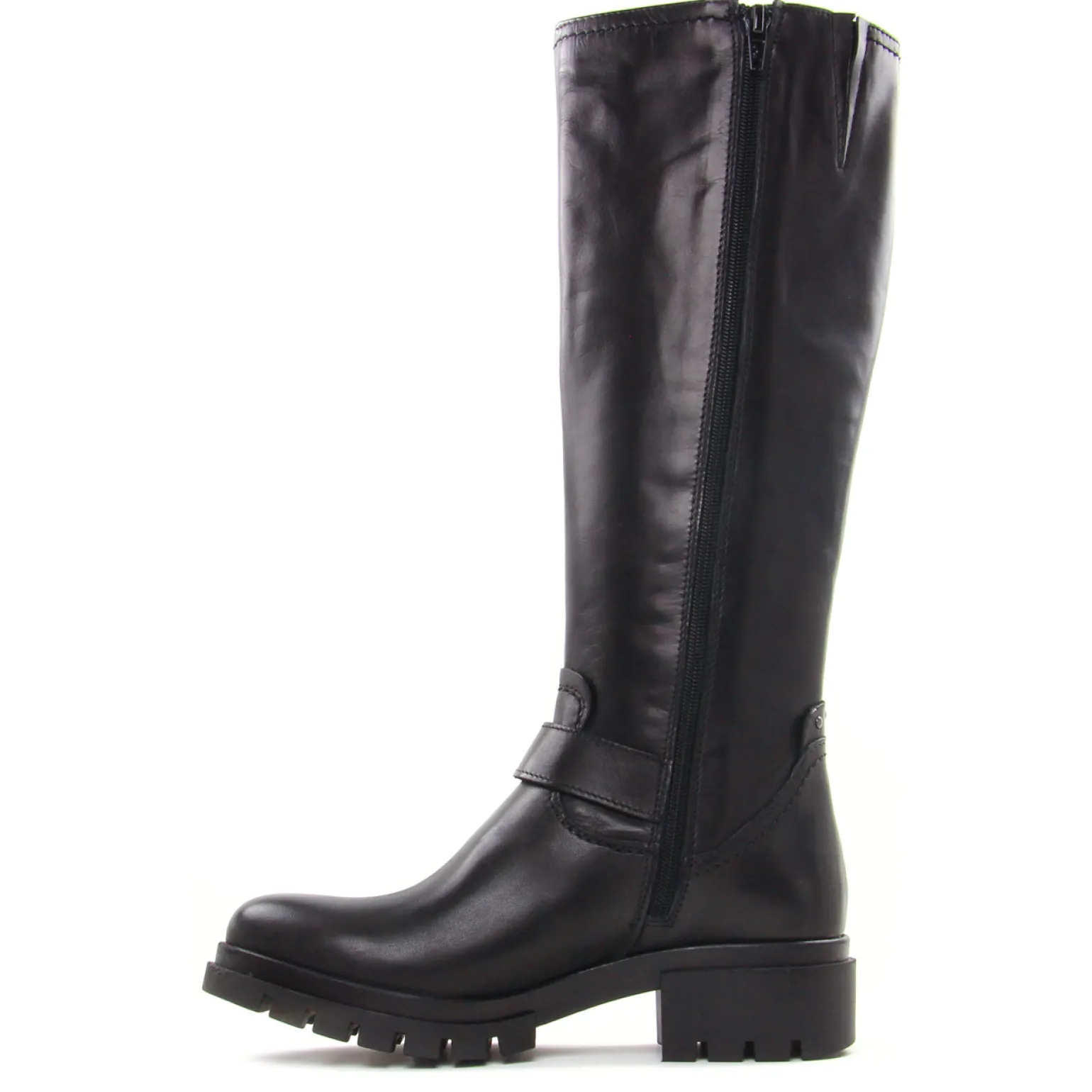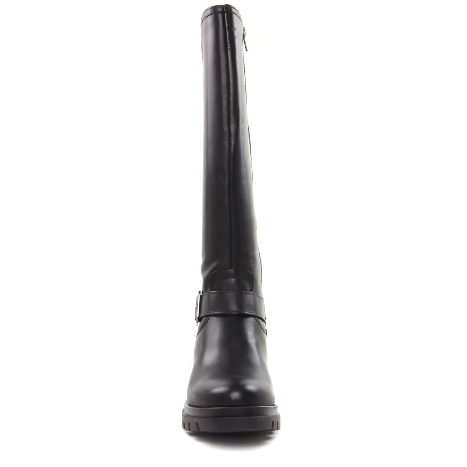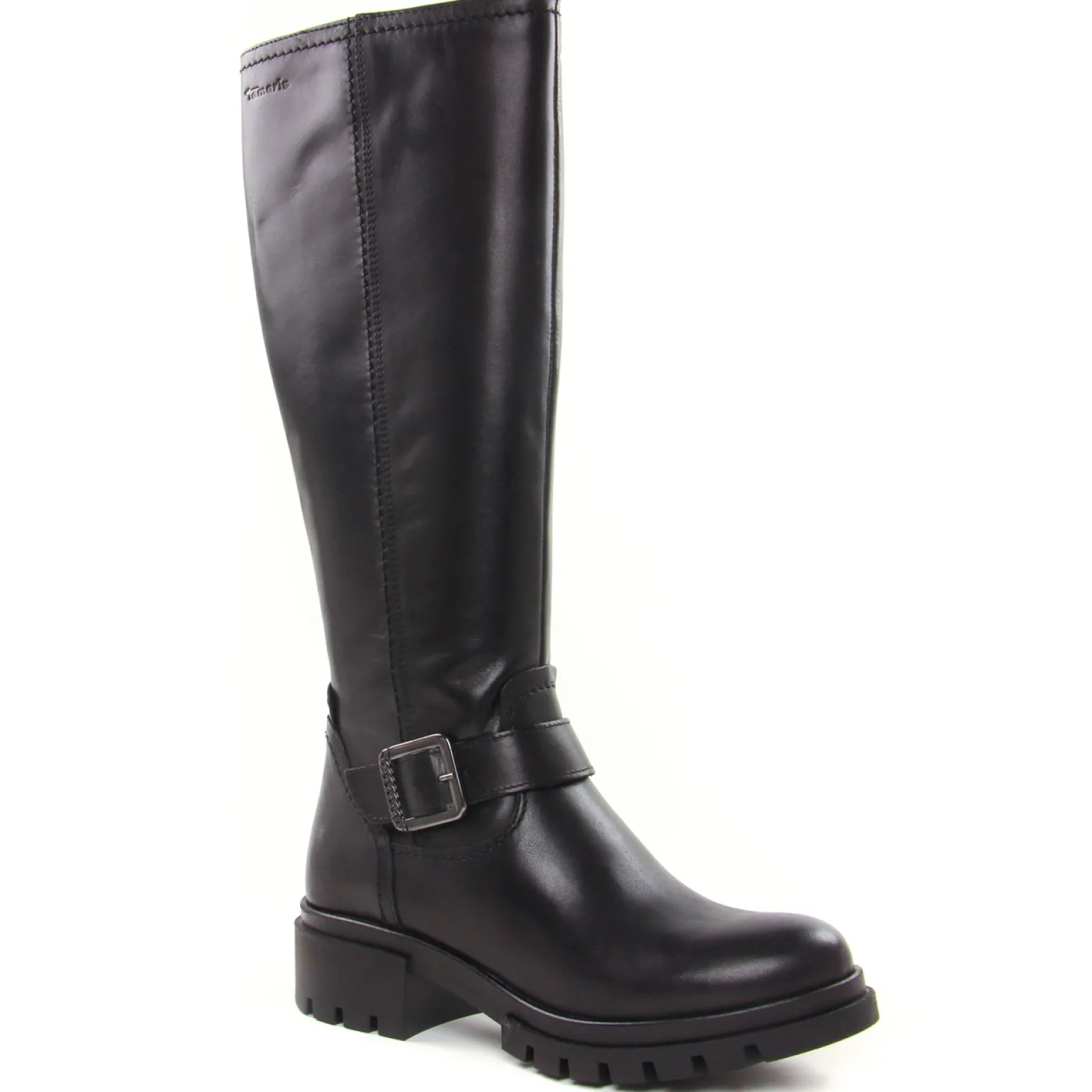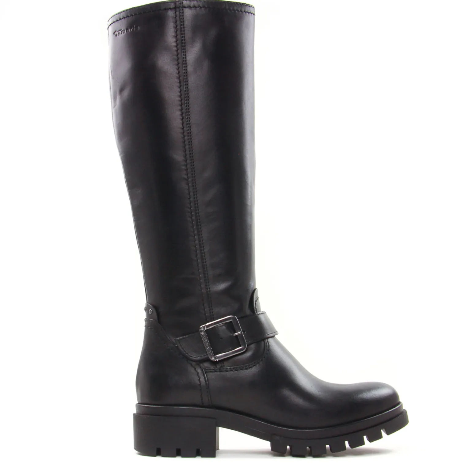 Bottes de la marque Tamaris de couleur noir. Bottes style biker avec une tige en cuir, doublure textile effet velours, une semelle épaisse crantée avec 4.5 cm de hauteur sous talon en gomme élastomère souple, bottes au look rock chic nouvelle collection hiver 2021-2022 de chez Tamaris
