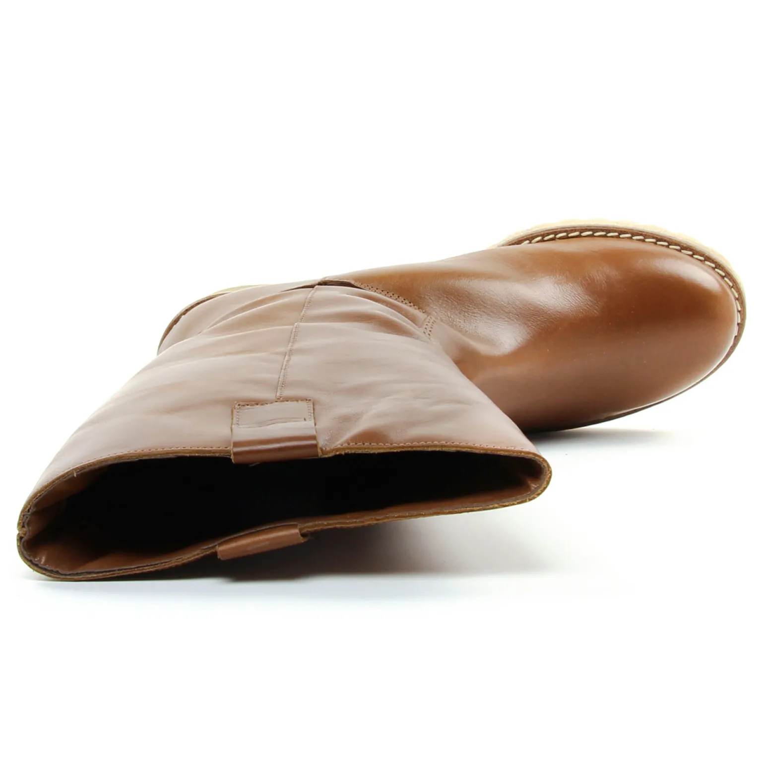 Bottillons de la marque Maria Jaén de couleur marron. Mi-botte en cuir glacé de couleur marron, une semelle effet crêpe avec 6 cm de hauteur sous talon, une tige haute de 24 cm au dessus du coup de pied, doublées cuir, première de propreté en cuir également, bottes fabriquées en Espagne.