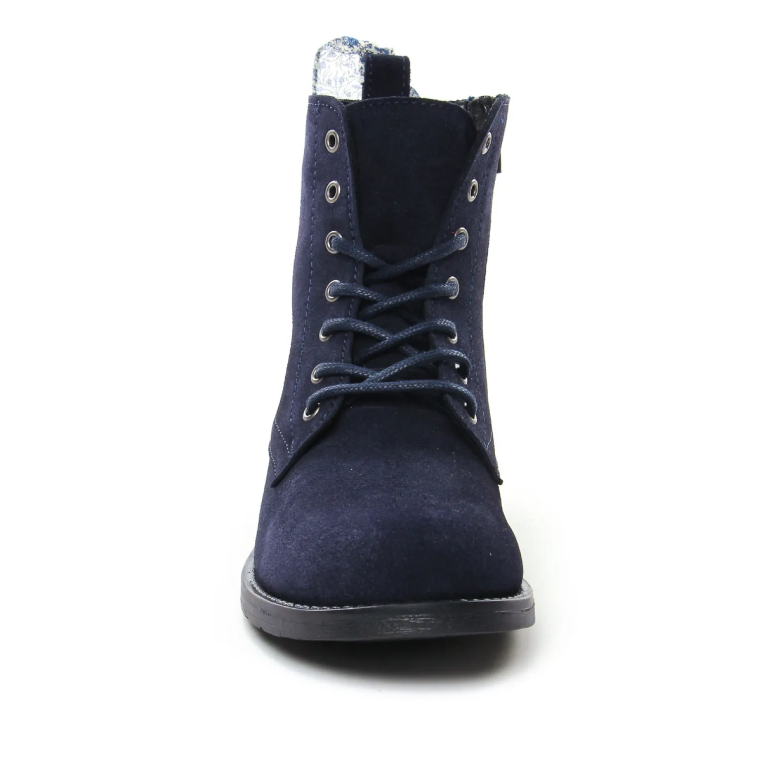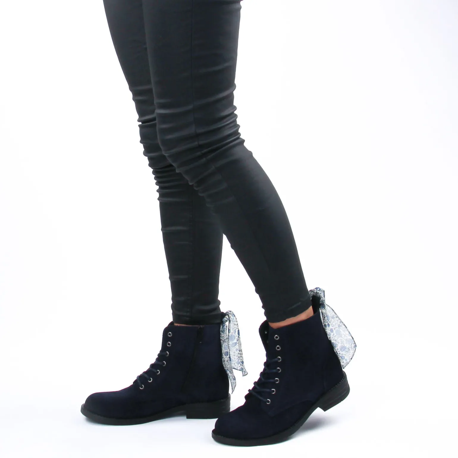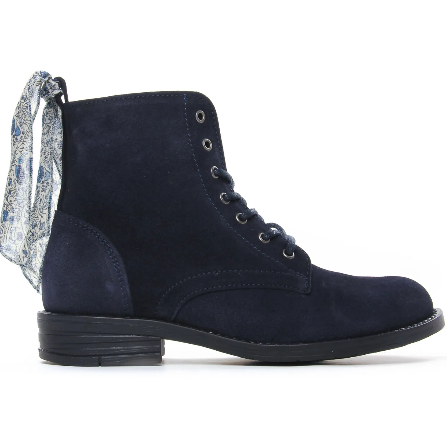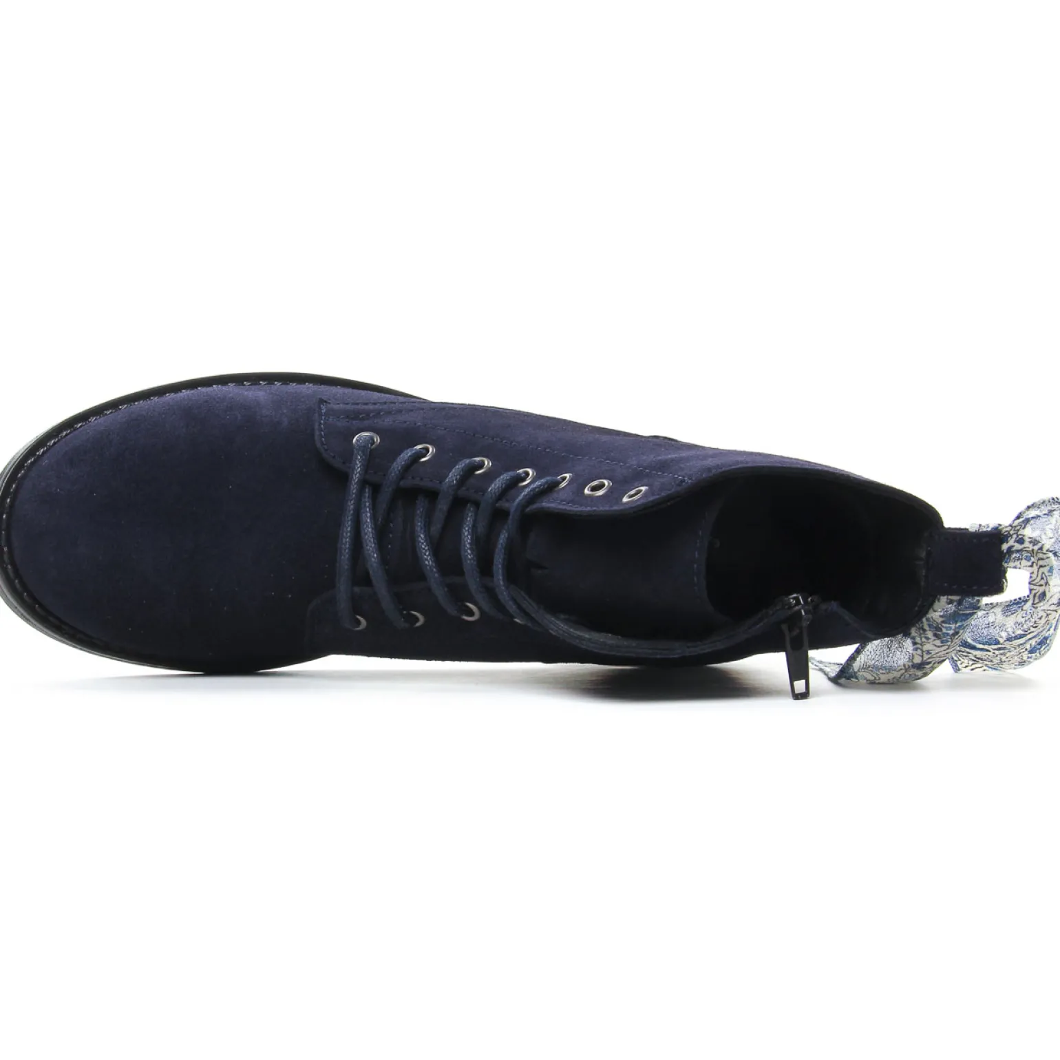 Bottines À Lacets de la marque Scarlatine de couleur bleu marine. Fabriquées en Europe au Portugal, une tige en cuir suédé nubuck disponibles en bleu marine, noir, beige et kaki, une première cuir, semelle souple en gomme élastomère, bottines à lacets nouvelle collection Scarlatine automne hiver 2022.