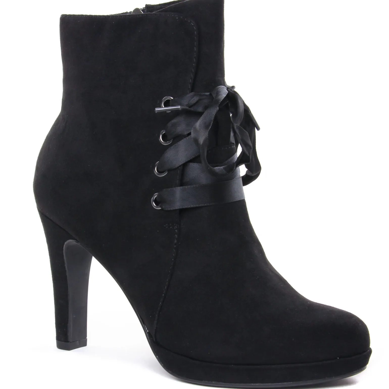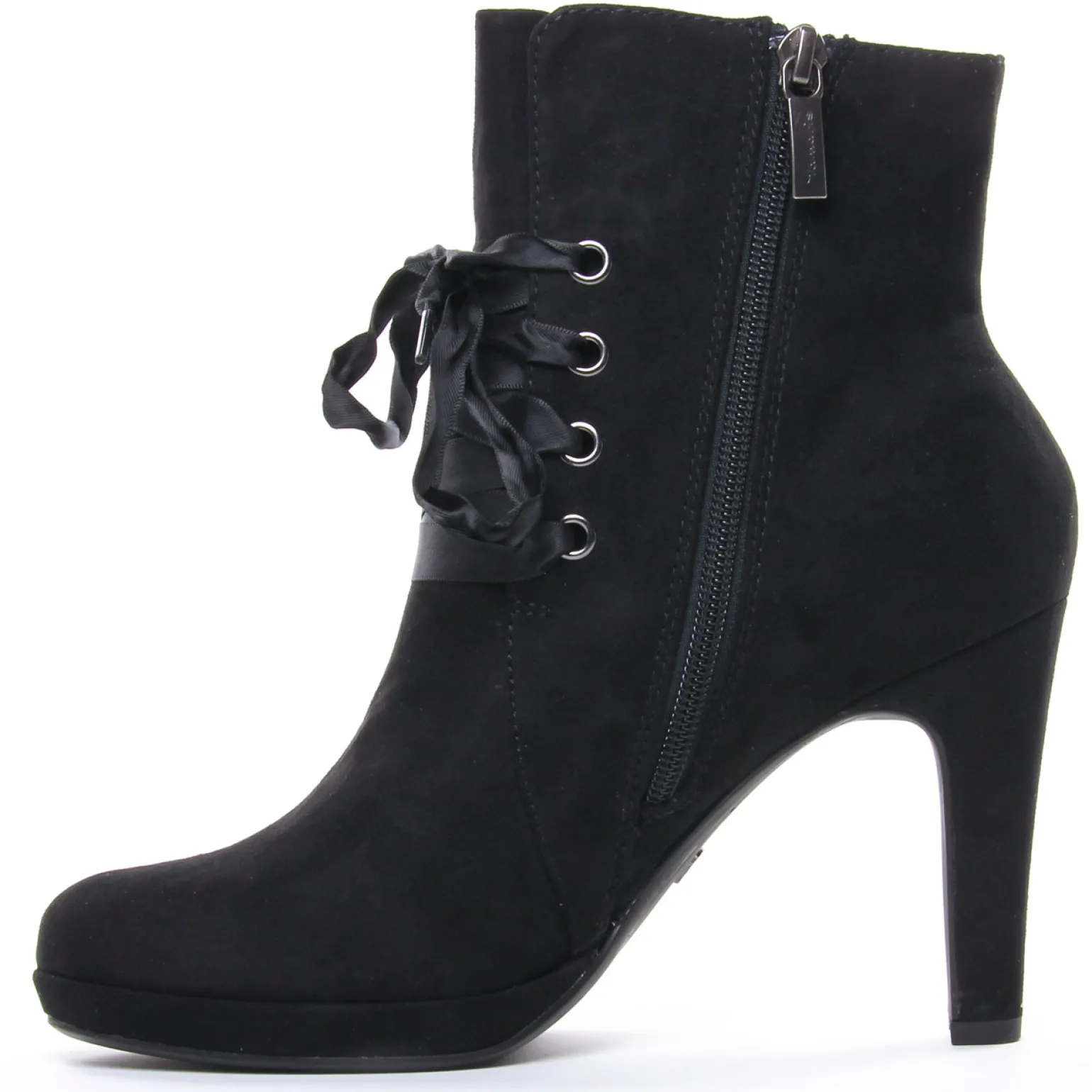 Bottines À Lacets de la marque Tamaris de couleur noir. Pour un style glamour et féminin, craquez pour ces bottines à talon d’escarpins fin presque stiletto, une tige en textile velours avec un joli lacet ruban, doublés textile, un talon de 10 cm, pour le confort un première textile Touch It, bottines à lacets de la nouvelle collection Tamaris automne hiver 2020.