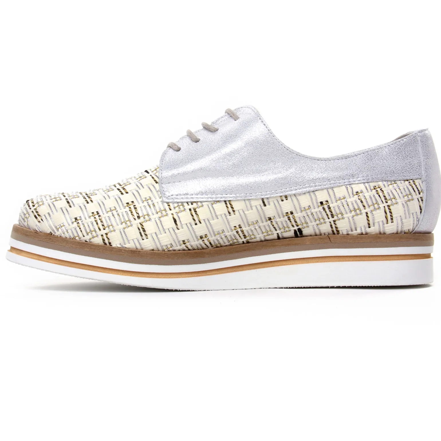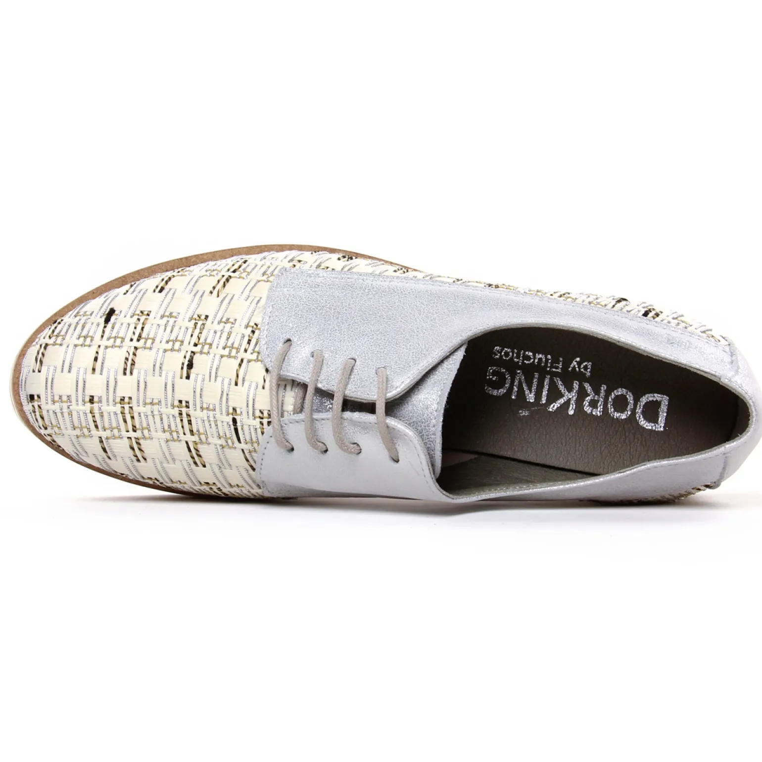 Derbys Compensées de la marque Dorking de couleur beige argent. Superbes derbies originales et glamour, une tige multicolore avec un effet tressé et métal, semelle plateforme haute de presque 4 cm de hauteur au talon, doublure et première de propreté textile microfibre brevetée, chaussures confortables grâce à leur légèreté et leur souplesse.