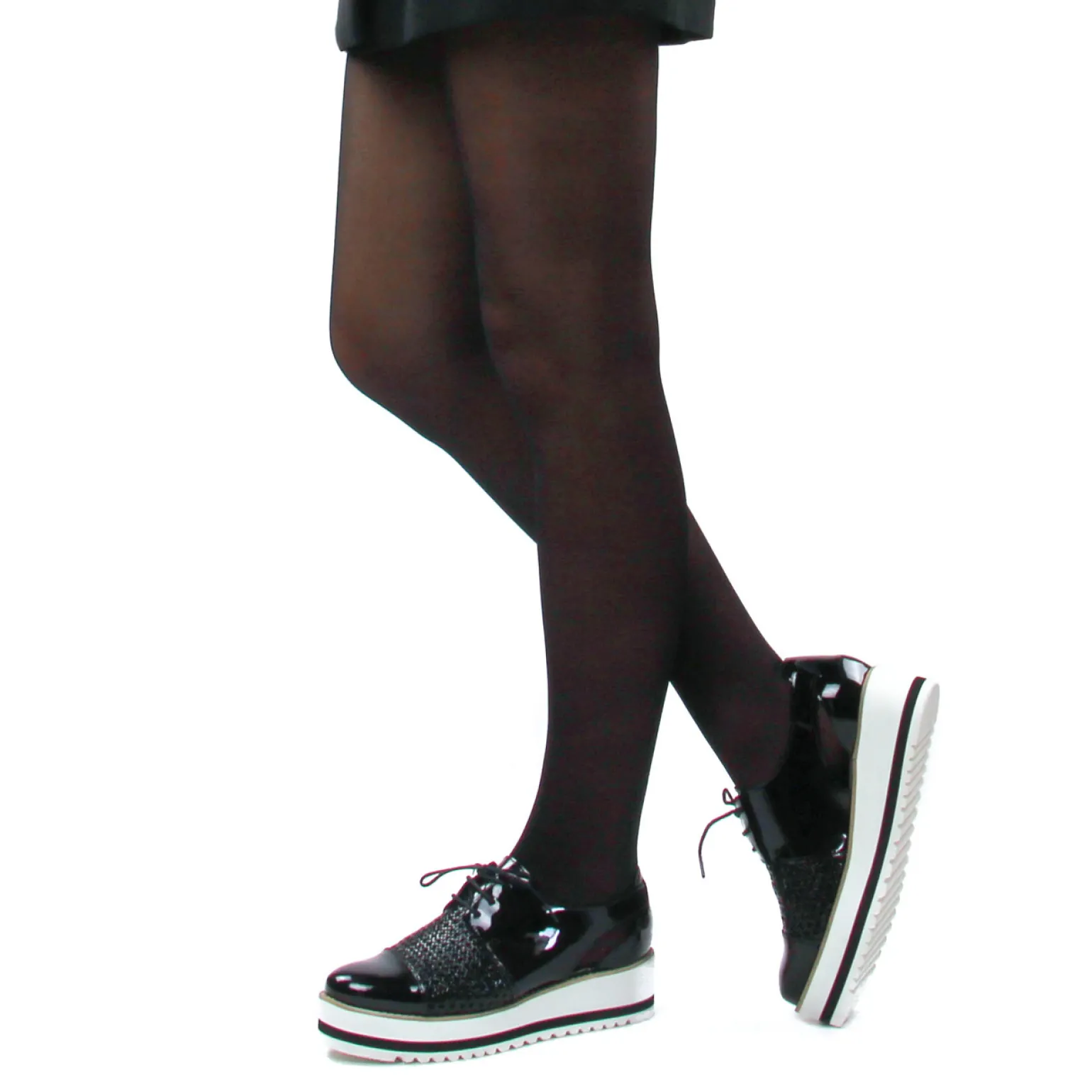 Derbys Compensées de la marque Scarlatine de couleur noir vernis. Derbys tendances hyper légères, revisite moderne de la derbie classique, un excellent choix pour un look boyish féminin masculin, une semelle plateforme en gomme blanche, très belle finition avec une découpe sous la cheville fermée, tige mariant les textures de cuir, empeigne ajouré, derbies hyper tendances et originales disponibles en blanc et noir ou beige doré.