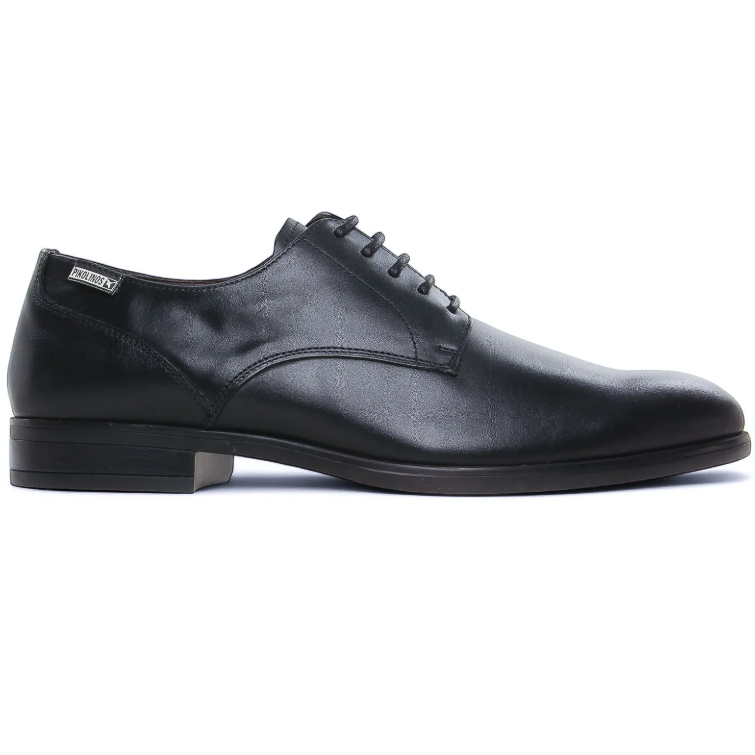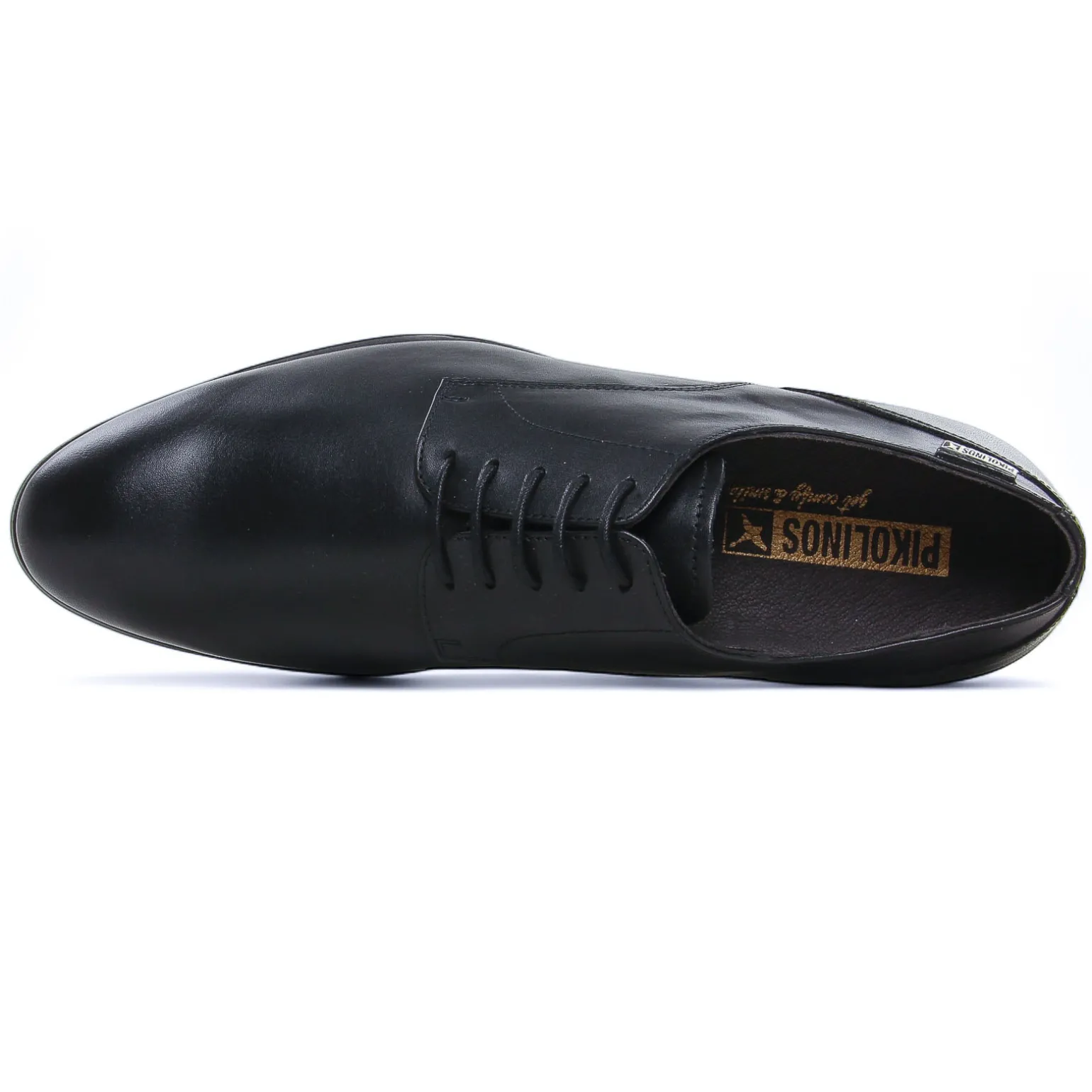 Derbys de la marque Pikolinos de couleur noir. Chics et élégantes derbies confortables en cuir, doublure en cuir et textile, semelle en gomme élastomère souple, talon haut de 2.5 cm, derbies confort Bristol M7J-4187 reviennent pour cette nouvelle collection printemps été 2025 de chez Pikolinos Homme.