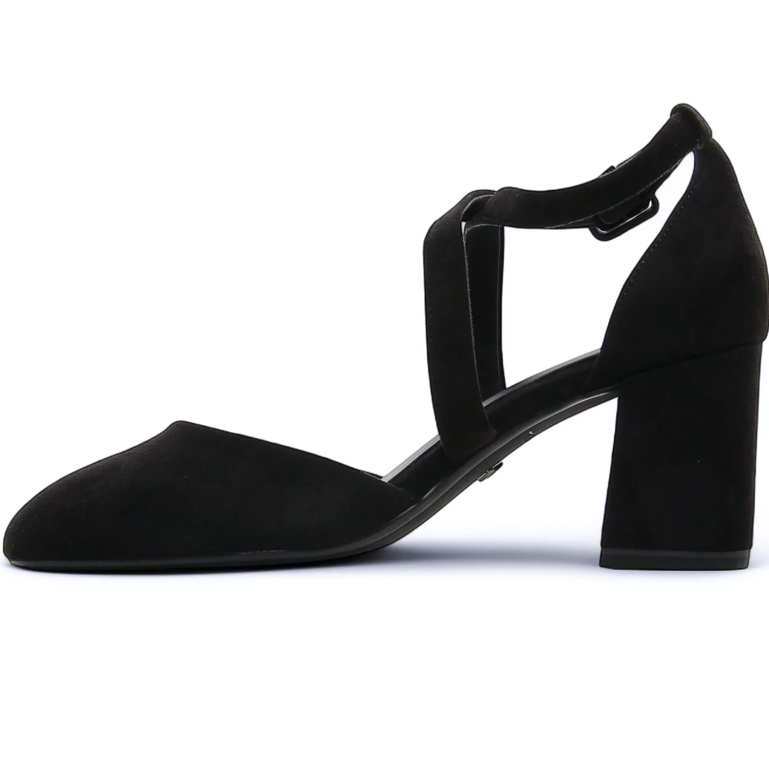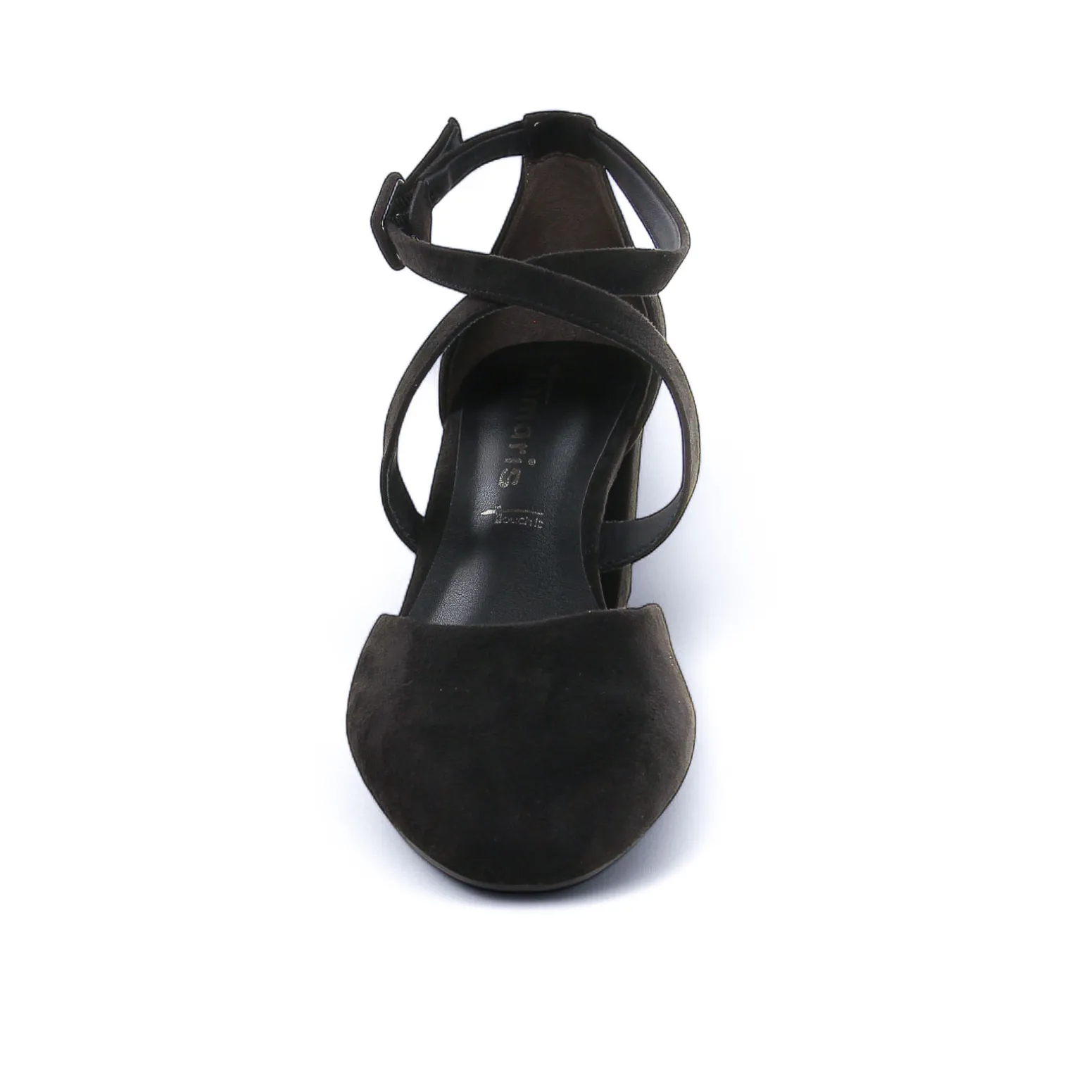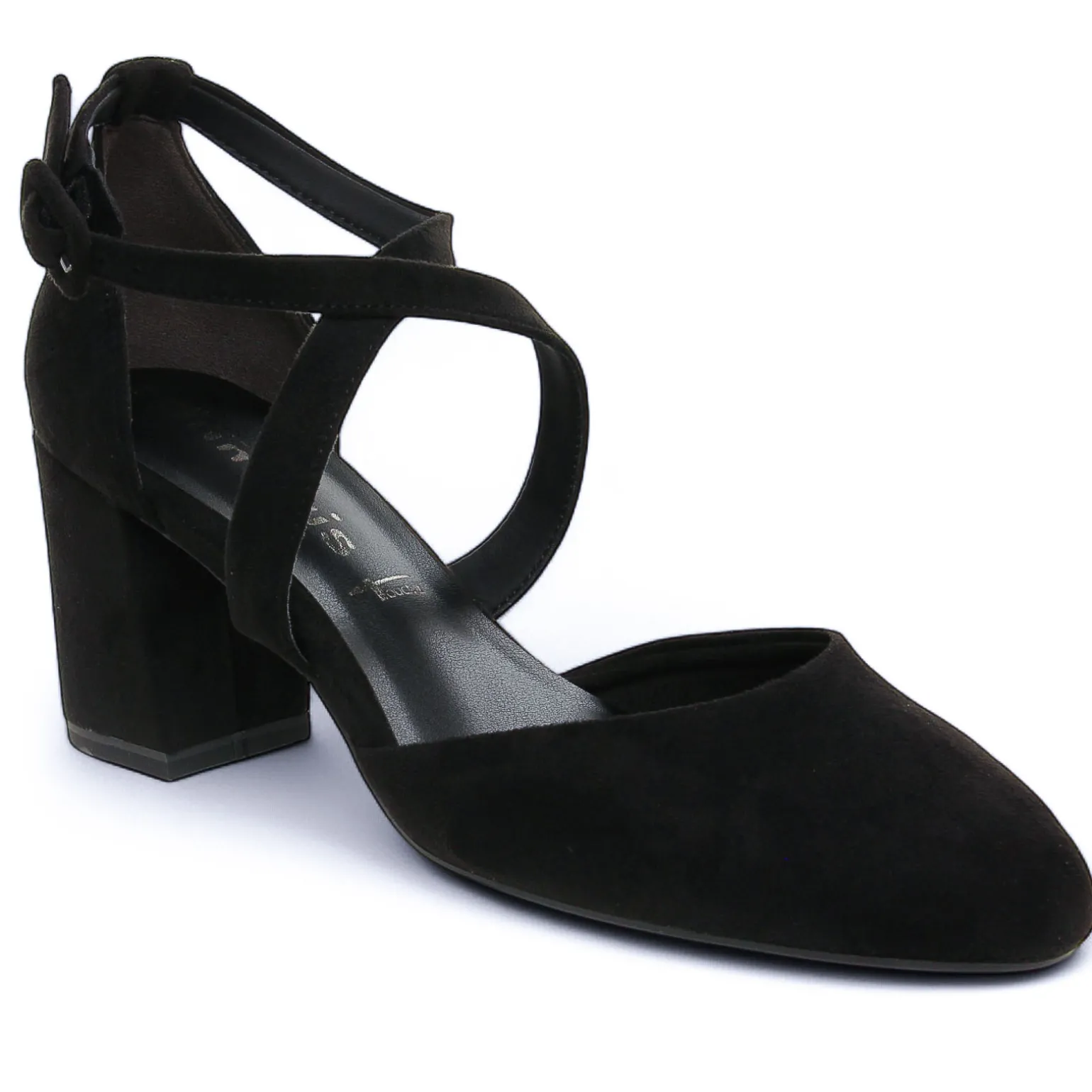 Escarpins Brides de la marque Tamaris de couleur noir. Escarpins ouverts en textile effet velours, brides croisées sur coup de pied réglables, une première Touch it qui ravira les femmes en quête de confort de marche, talon carre 7 cm et bout fin