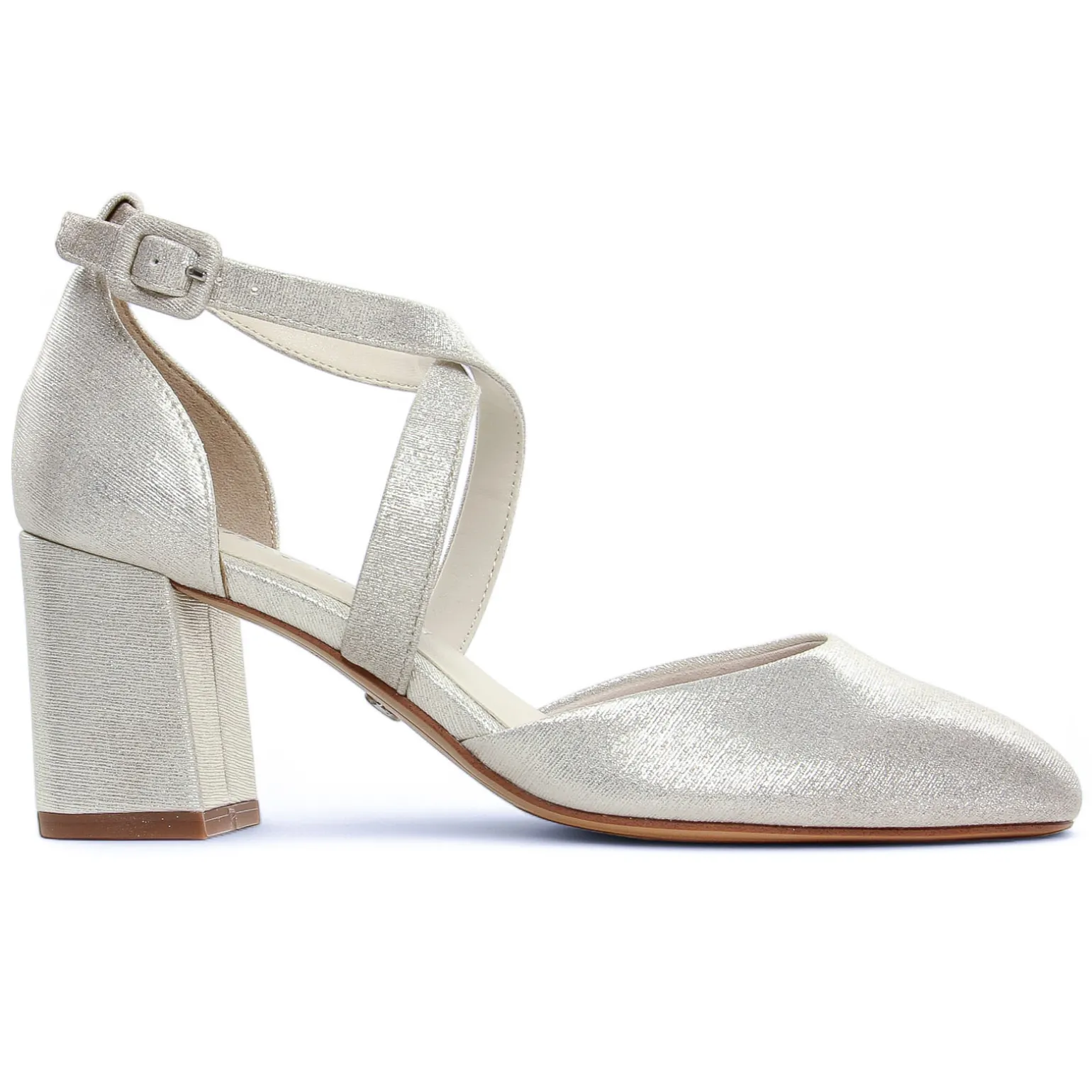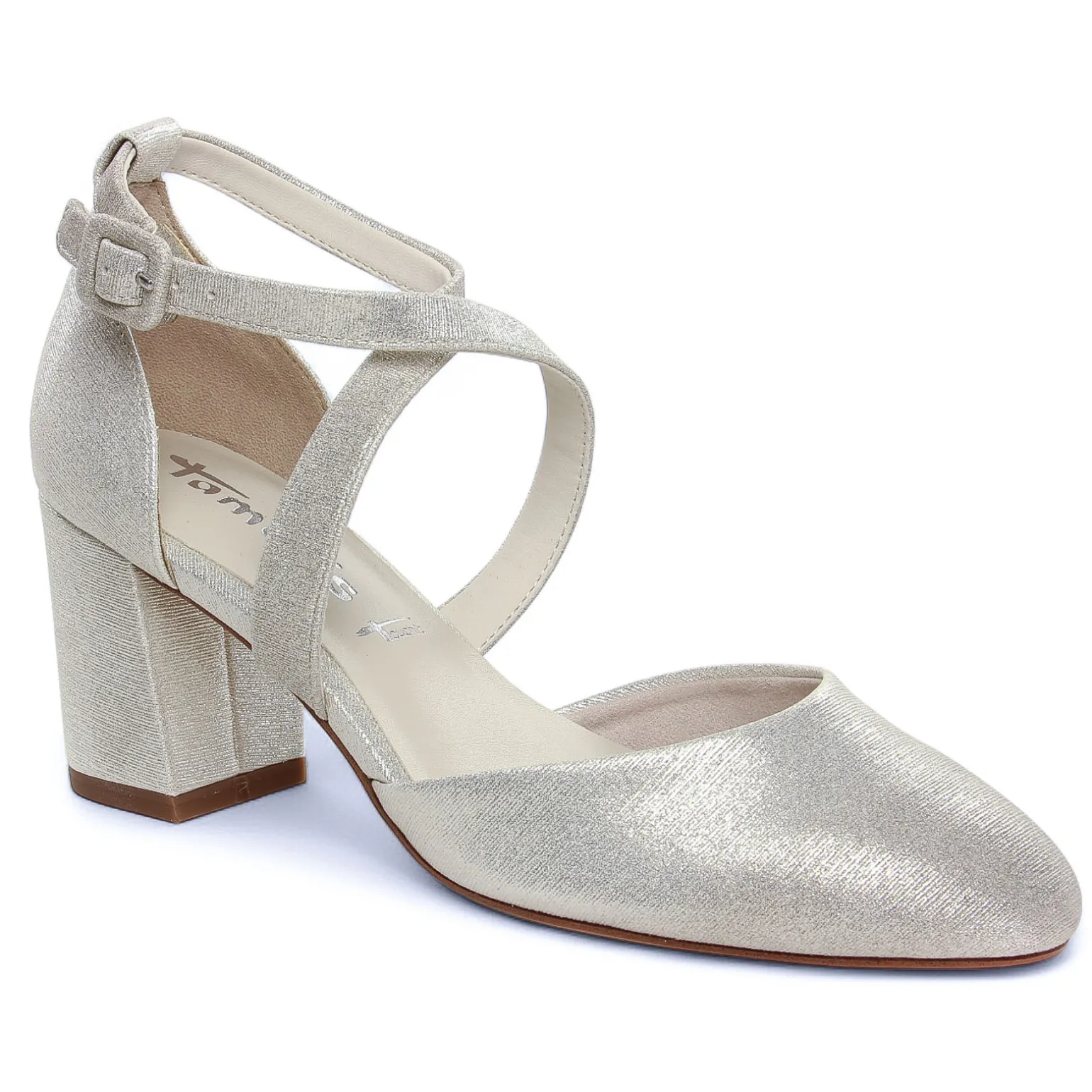 Escarpins Brides de la marque Tamaris de couleur gris argent. Escarpin irisé platine avec brides croisées sur le coup de pied et réglage par boucle sur le coté, un bout pointu et fermé, un talon carré recouvert d’une hauteur de 7 cm, première confortables grâce notamment à sa semelle intérieure Touch it