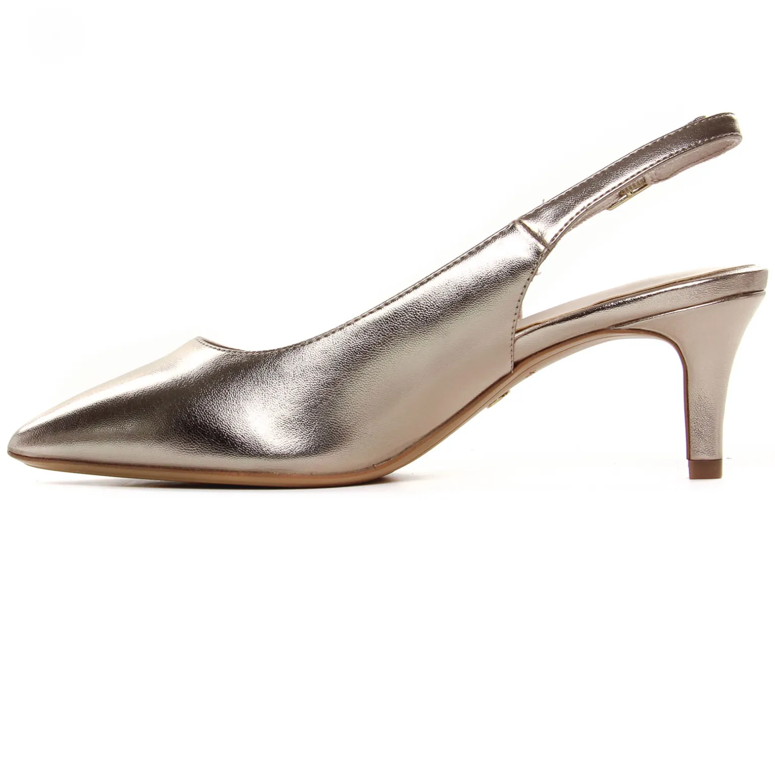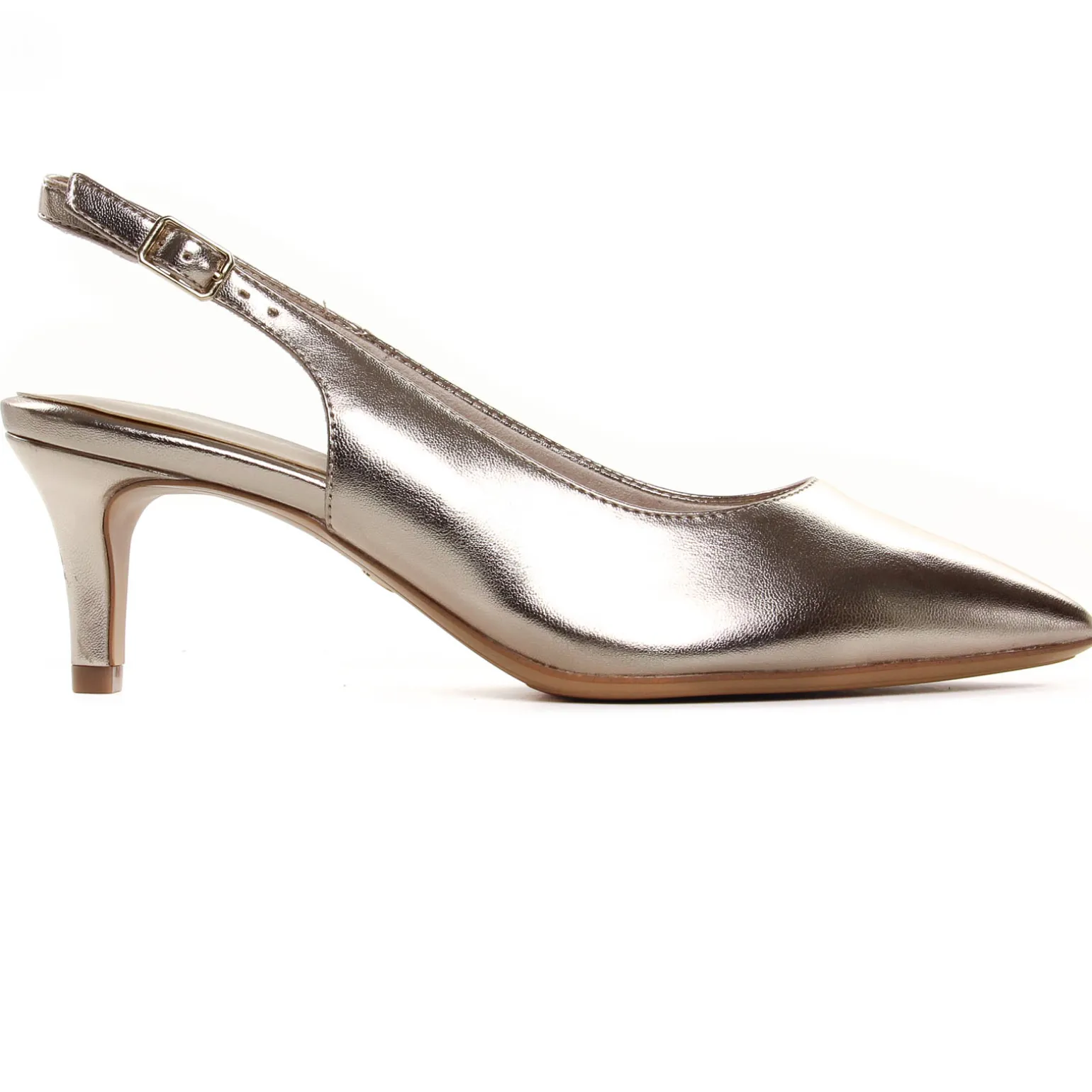 Escarpins Brides de la marque Tamaris de couleur beige or. Élégants escarpins à bride arrière réglable, un talon fin de 6 cm de hauteur, un bout pointu très féminin, une première avec un procédé de confort de marche accru nommé Touch it, disponibles en noir ou en bronze pour cette nouvelle collection printemps été 2025 de chez Tamaris