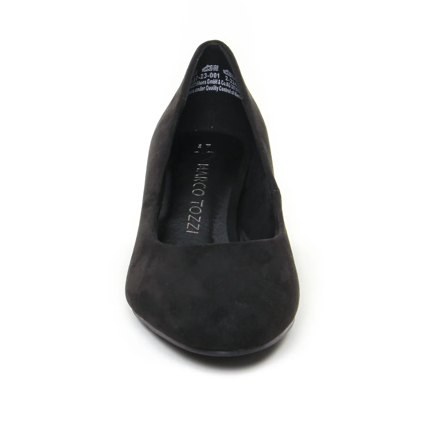 Escarpins de la marque Marco Tozzi de couleur noir. Élégants escarpins avec un talon haut de 6 cm, tige en velours noir, doublés textile, un talon haut assez large et donc stable et confortable, escarpins de la gamme véganne de chez Marco Tozzi, la mode à petit prix !