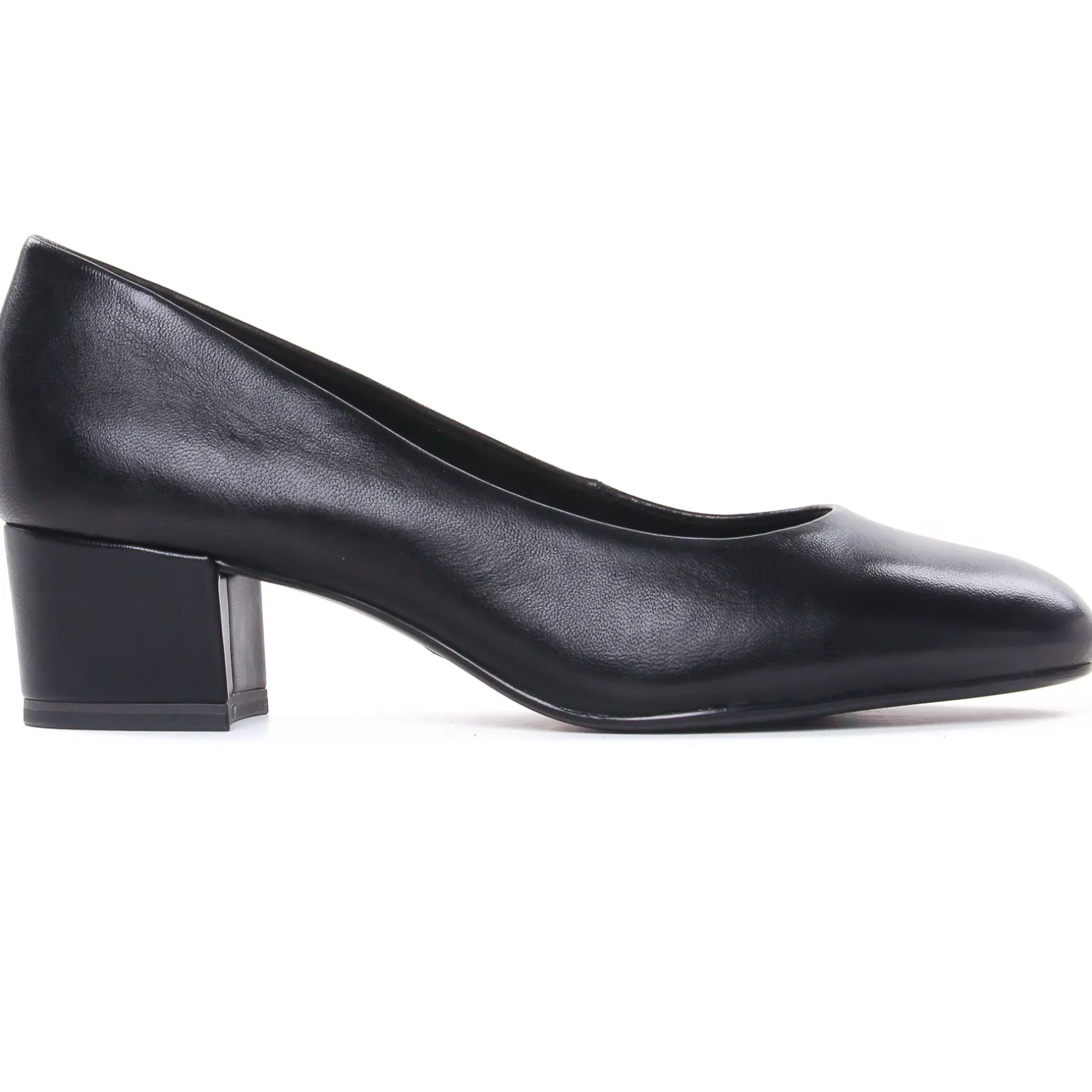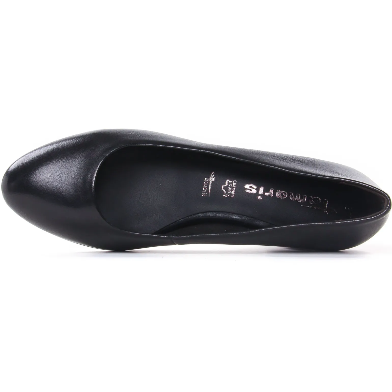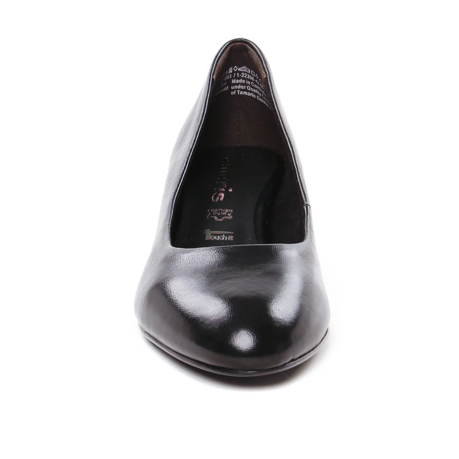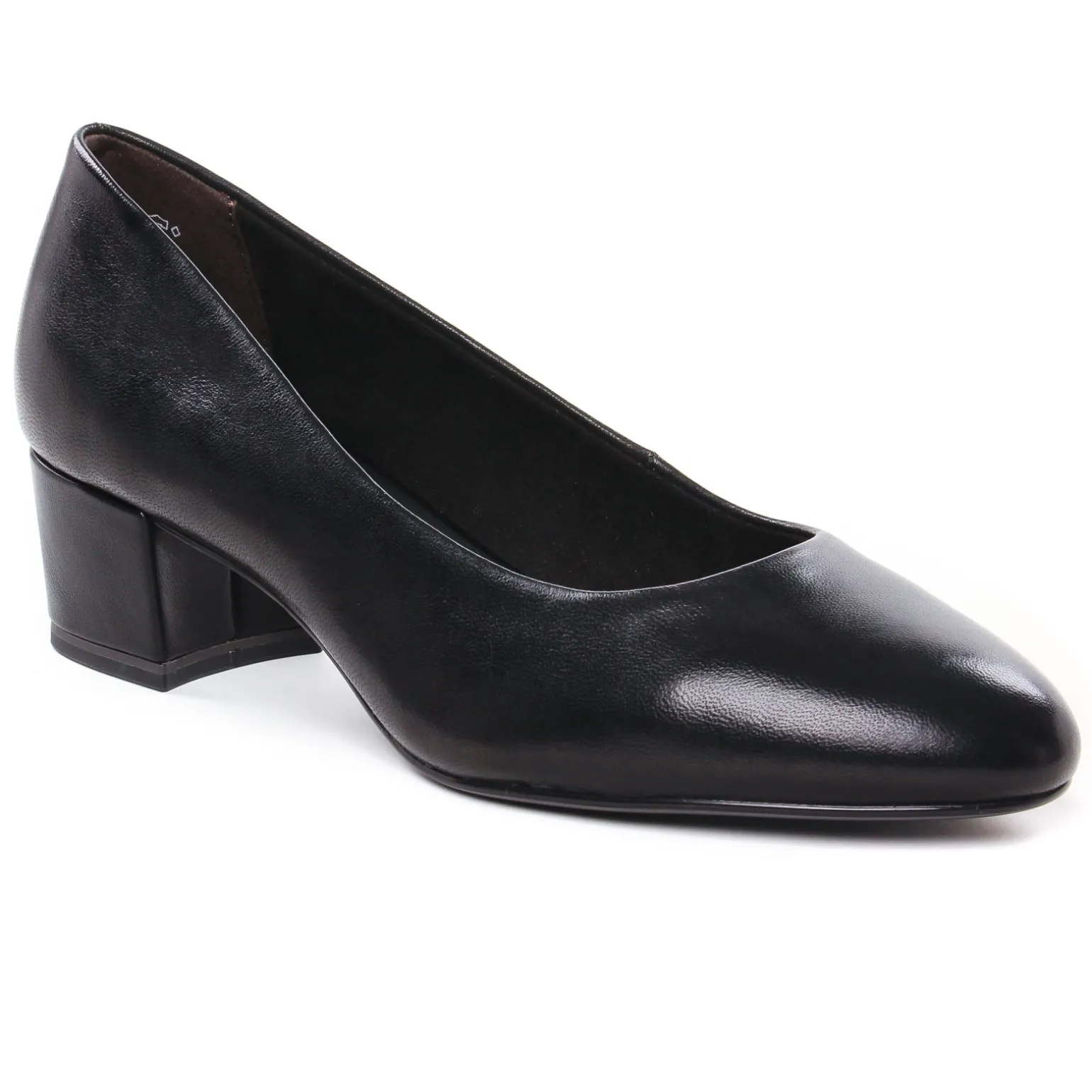 Escarpins Trotteur de la marque Tamaris de couleur noir. Jolis escarpins en cuir confortables, un talon bloc antiglisse haut de 5 cm, une première ergonomique confort en cuir Touch It, un bout rond et assez fin, très élégants et modernes, escarpins cuir noir signés par la marque allemande Tamaris