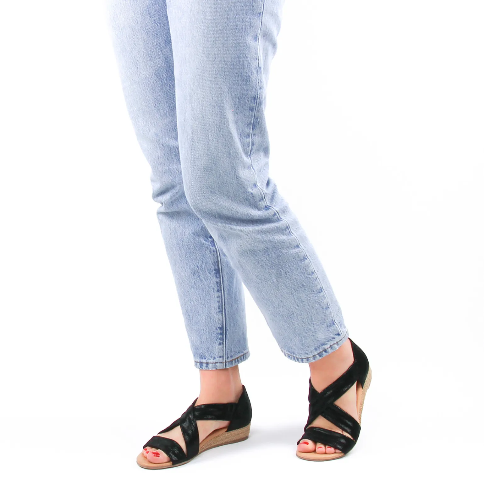 Espadrilles Compensées Cordes de la marque Scarlatine de couleur noir metal. Petit talon compensé haut de 3.5 cm, semelle recouverte de cordes, nu-pieds avec deux brides croisées sur le coup de pied et une claque, cuir nubuck pailleté noir ou métallisé or, talon fermé, sandales femme nouvelle collection été 2022. Nu-pieds fabriquées en Europe au Portugal.