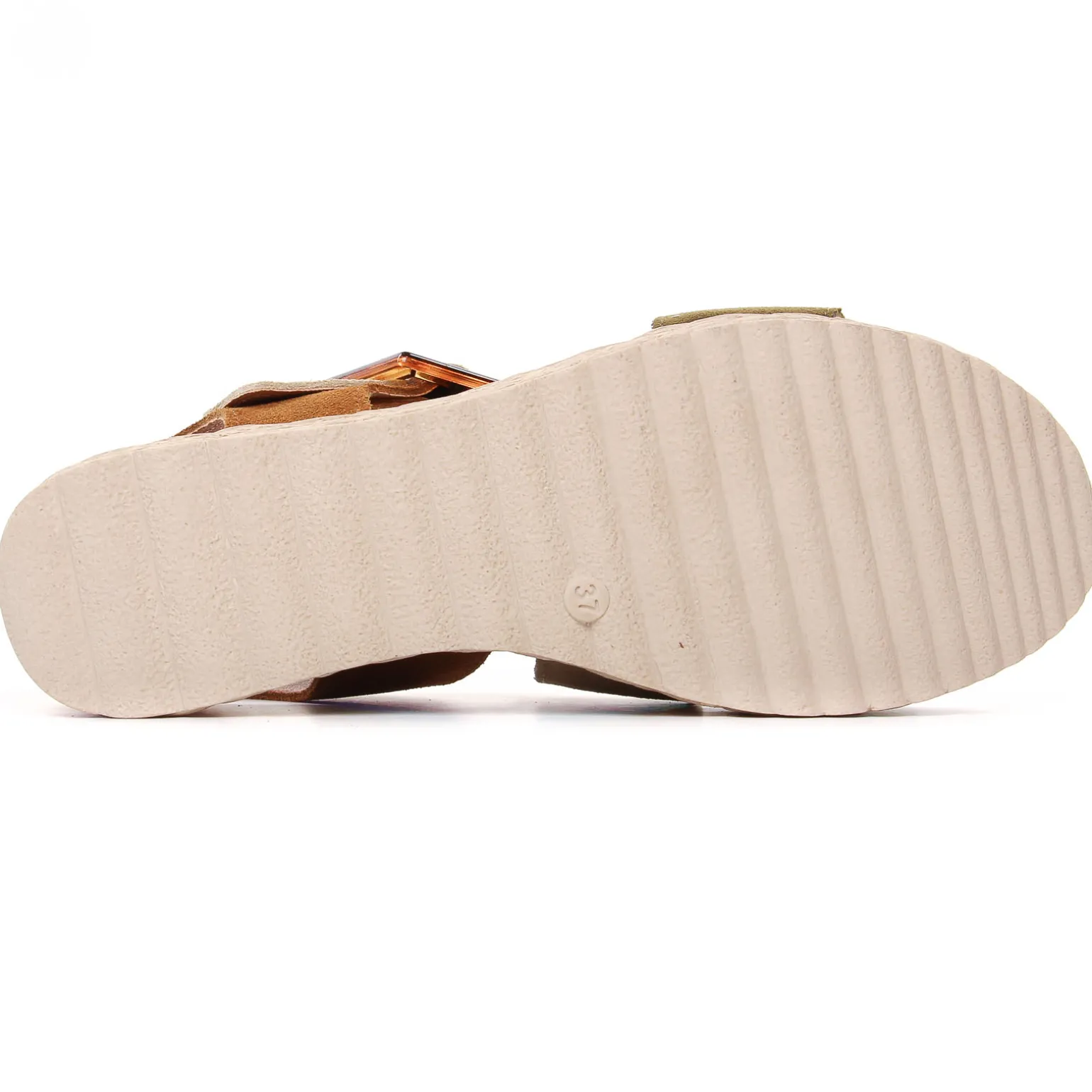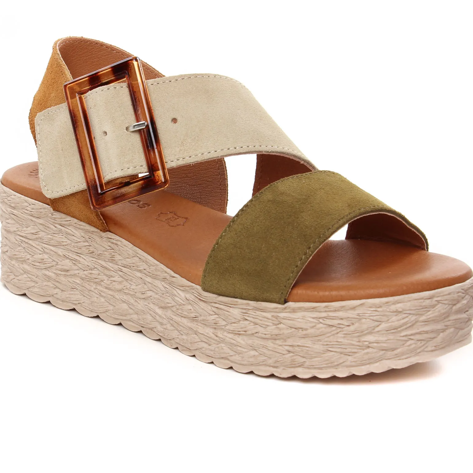 Espadrilles Compensées de la marque Eva Frutos de couleur vert kaki. Une plateforme en simili cordes hyper légère et du coup hyper confort, nu-pied cuir compensé haut de 5.5 cm au talon signé Eva Frutos nouvelle collection été 2024, bride coup de pied ornée d’une belle boucle, une tige en cuir suédé nubuck, une première cuir confortable