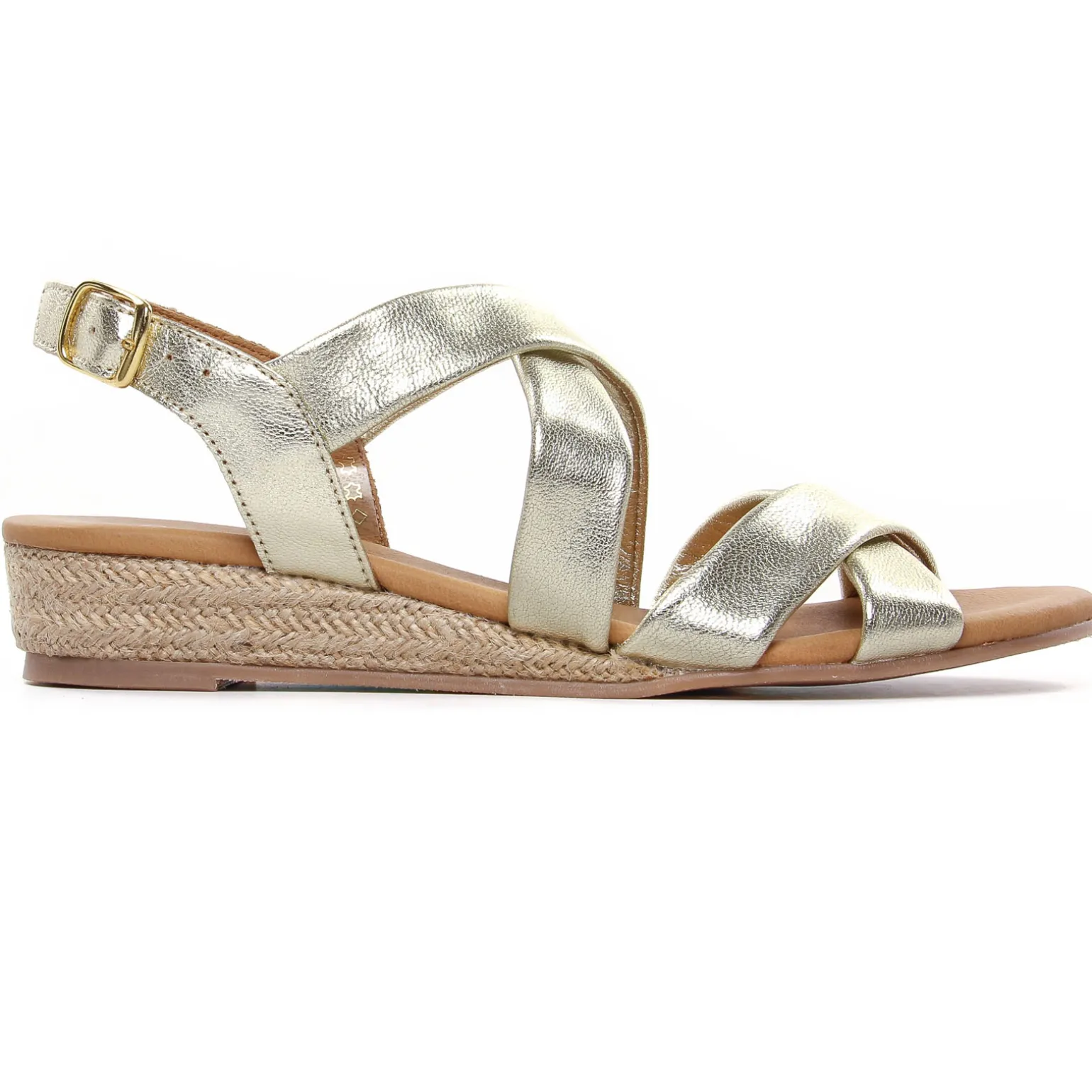 Espadrilles Compensées de la marque Scarlatine de couleur or. Élégants nu-pieds avec des brides en cuir nubuck bleu marine ou en cuir métal doré, brides croisées sur les orteils et le coup de pied, réglage avec une boucle, semelle intérieure confortable en cuir, un petit talon compensé recouvert de cordes haut de presque 4 cm