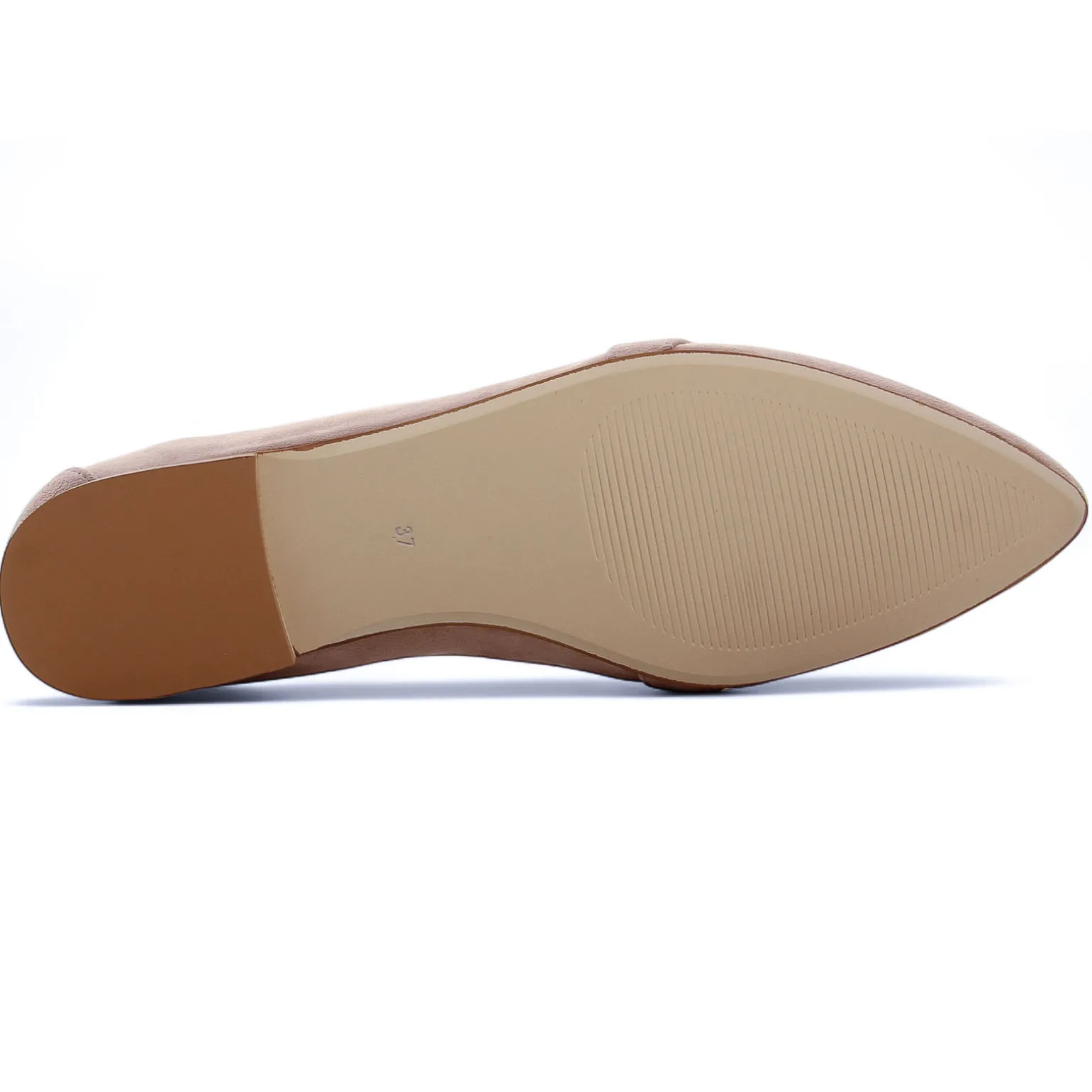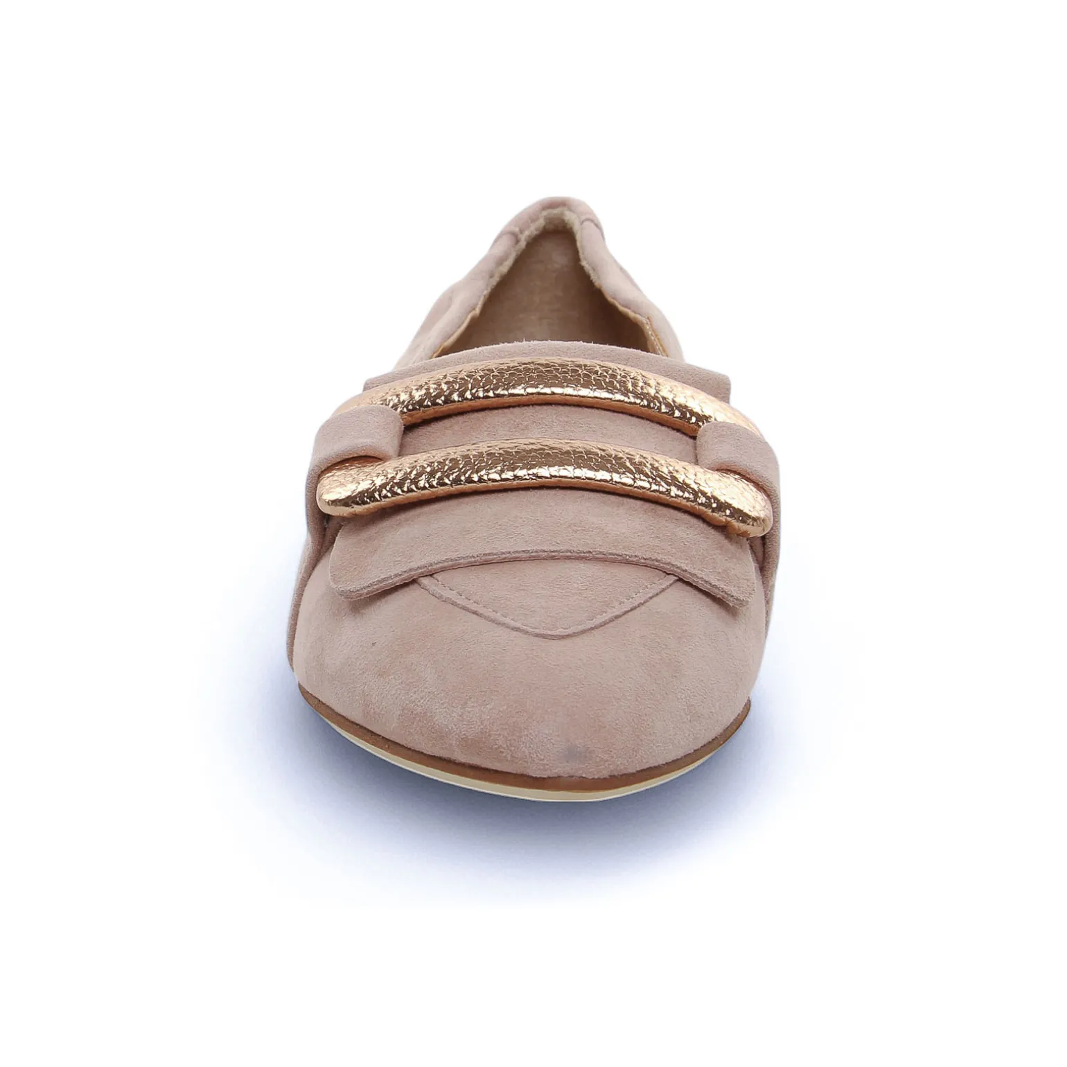 Mocassins de la marque Regarde Le Ciel de couleur taupe. Entre le mocassin et la ballerine, un bout pointu, tige en cuir nubuck couleur havane clair, bleu marine ou en cuir lisse blanc, empiècement sur coup de pied agrémenté d’une large boucle rectangulaire or, première cuir avec un léger amorti, petit talon carré effet bois