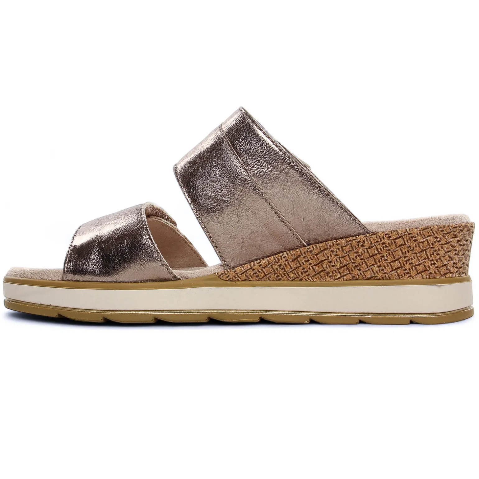 Mules Compensées de la marque Caprice de couleur beige taupe. Mules glamours et confortables avec une tige cuir taupe métallisée, 2 brides larges surle coup de pied et réglables par velcro, une première de propreté confort, amortissante, une semelle compensée haute de 5 cm au talon et 2.5 à l’avant