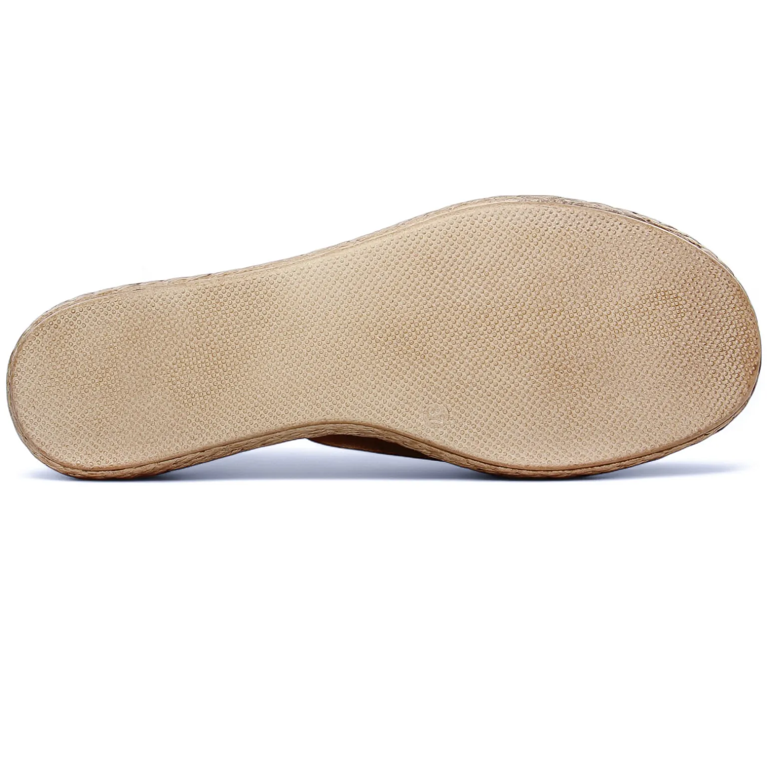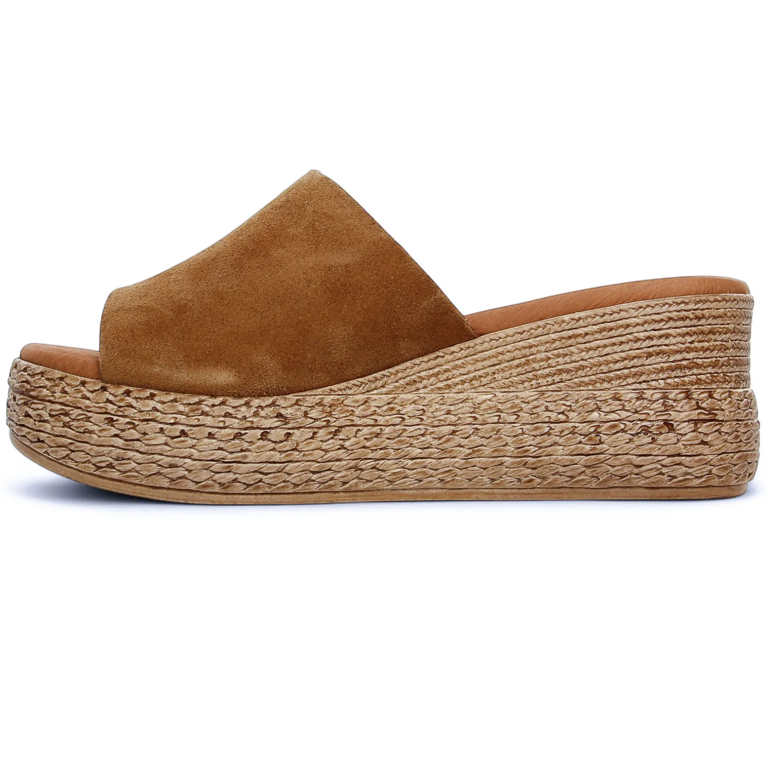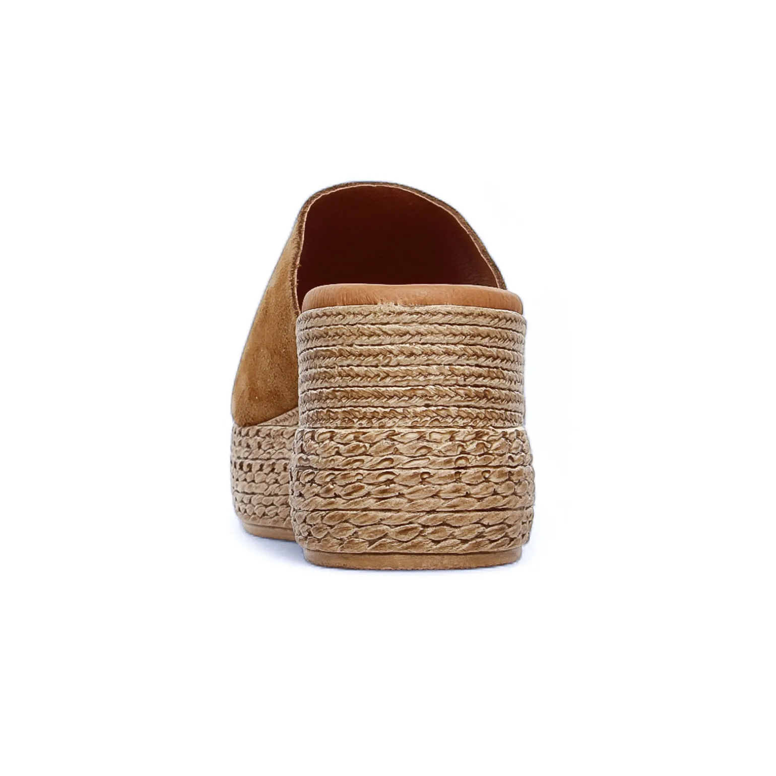 Mules Compensées de la marque Eva Frutos de couleur marron. Perturbes mules avec une claque en cuir suédé marron cognac ou noir, une première de propreté en cuir confortable, une talon compensé de 7 cm et une patin de 3,5 cm, une semelle plafeforme avec un magnifique effet cordes très légère