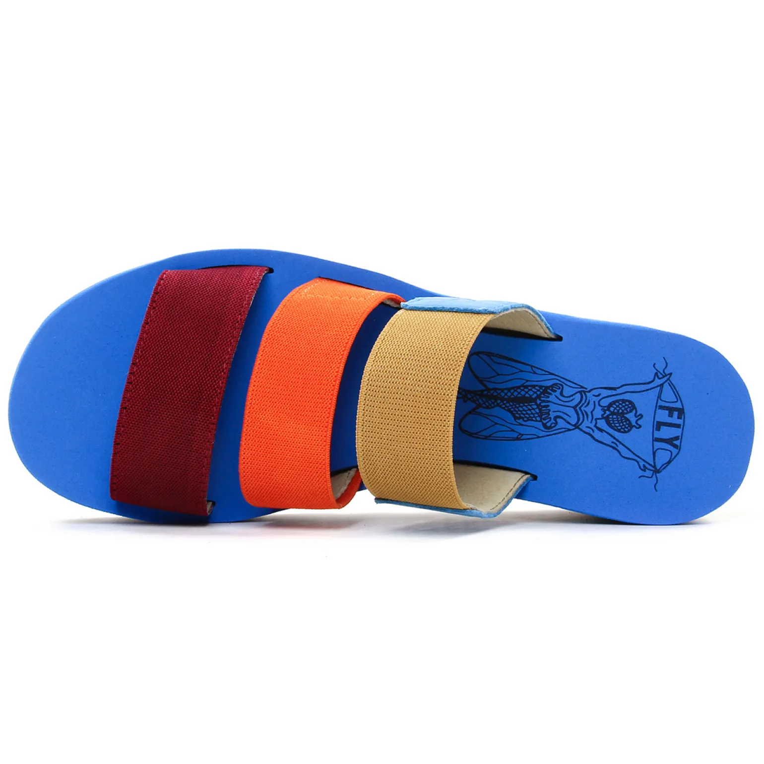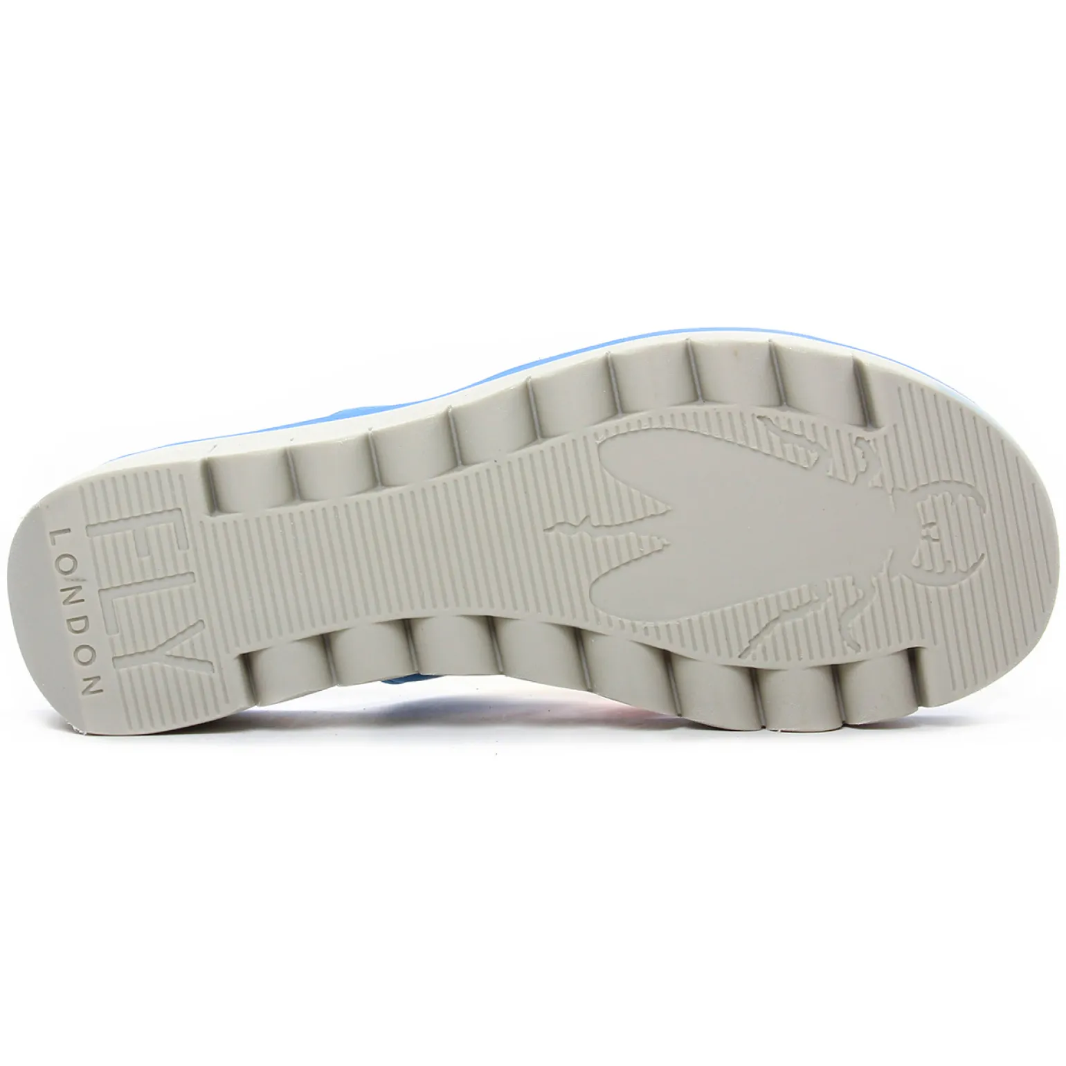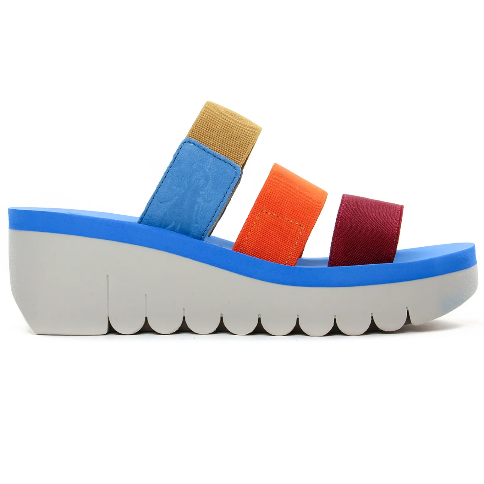 Mules Compensées de la marque Fly London de couleur bleu multi. Un design fun et estivale pour ces sandales compensées Fly London nouvelle collection été 2022, brides dans des couleurs vives, mariage de cuir et de textile elastiqué, une semelle très légère grise, une première cuir bleue piscine originale : on adore !