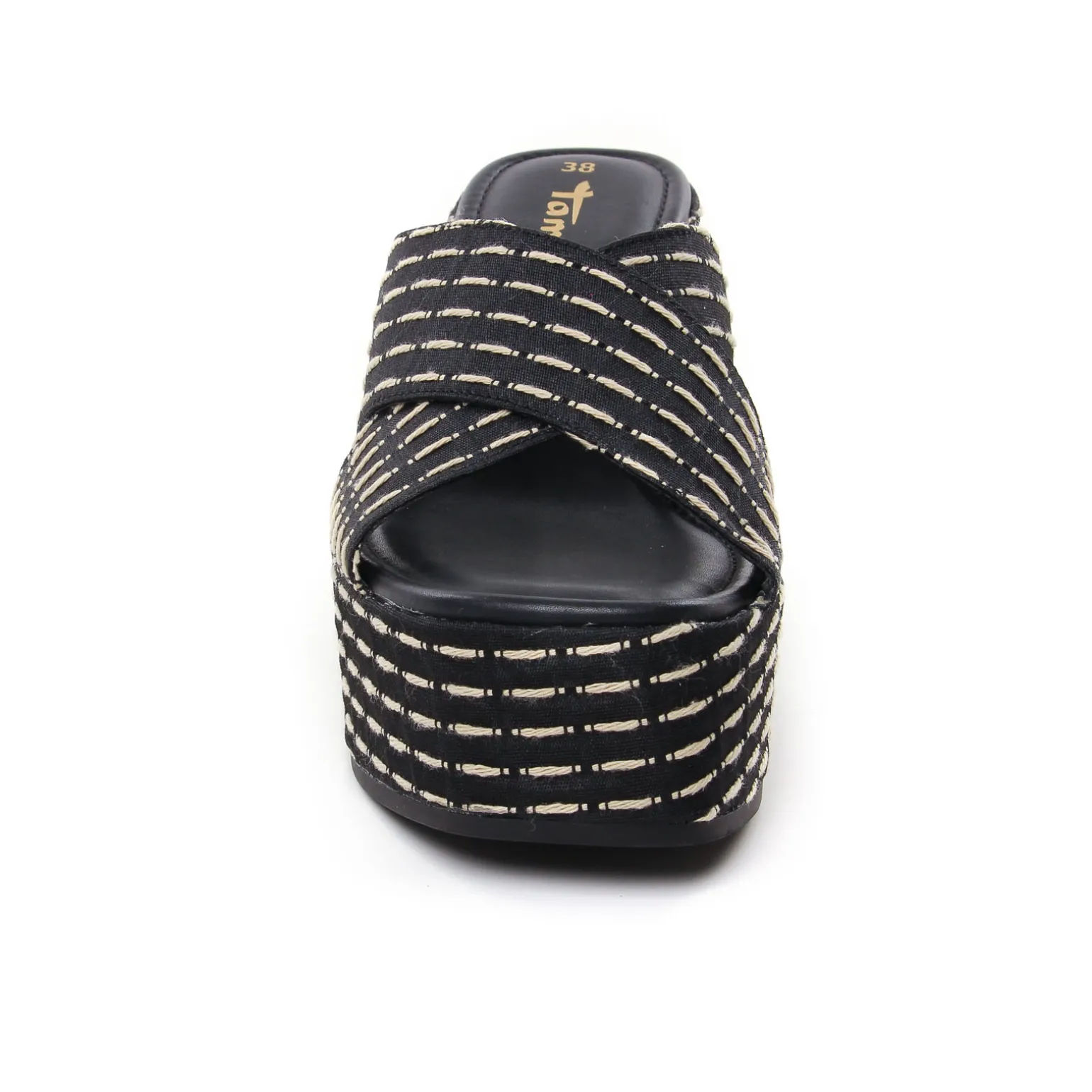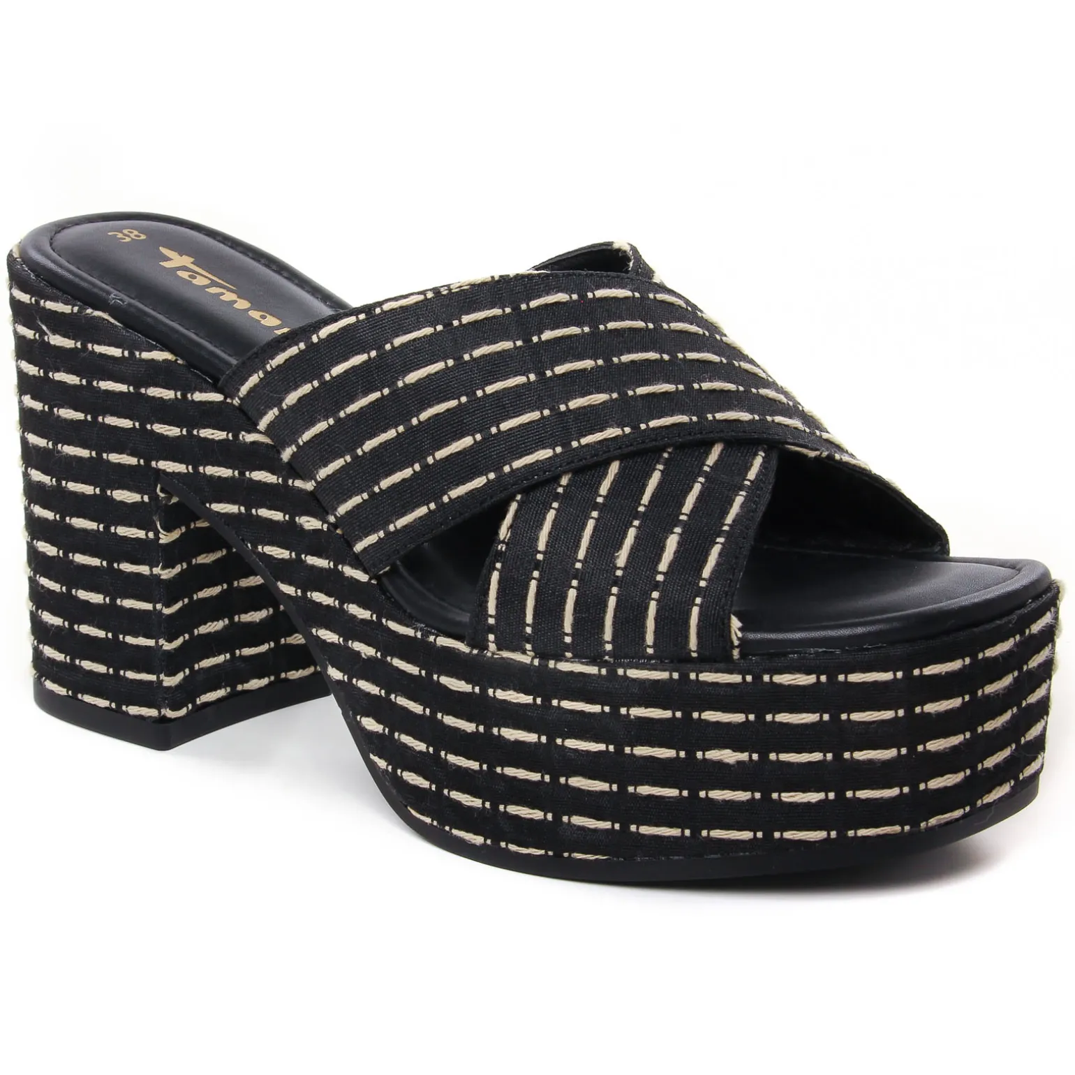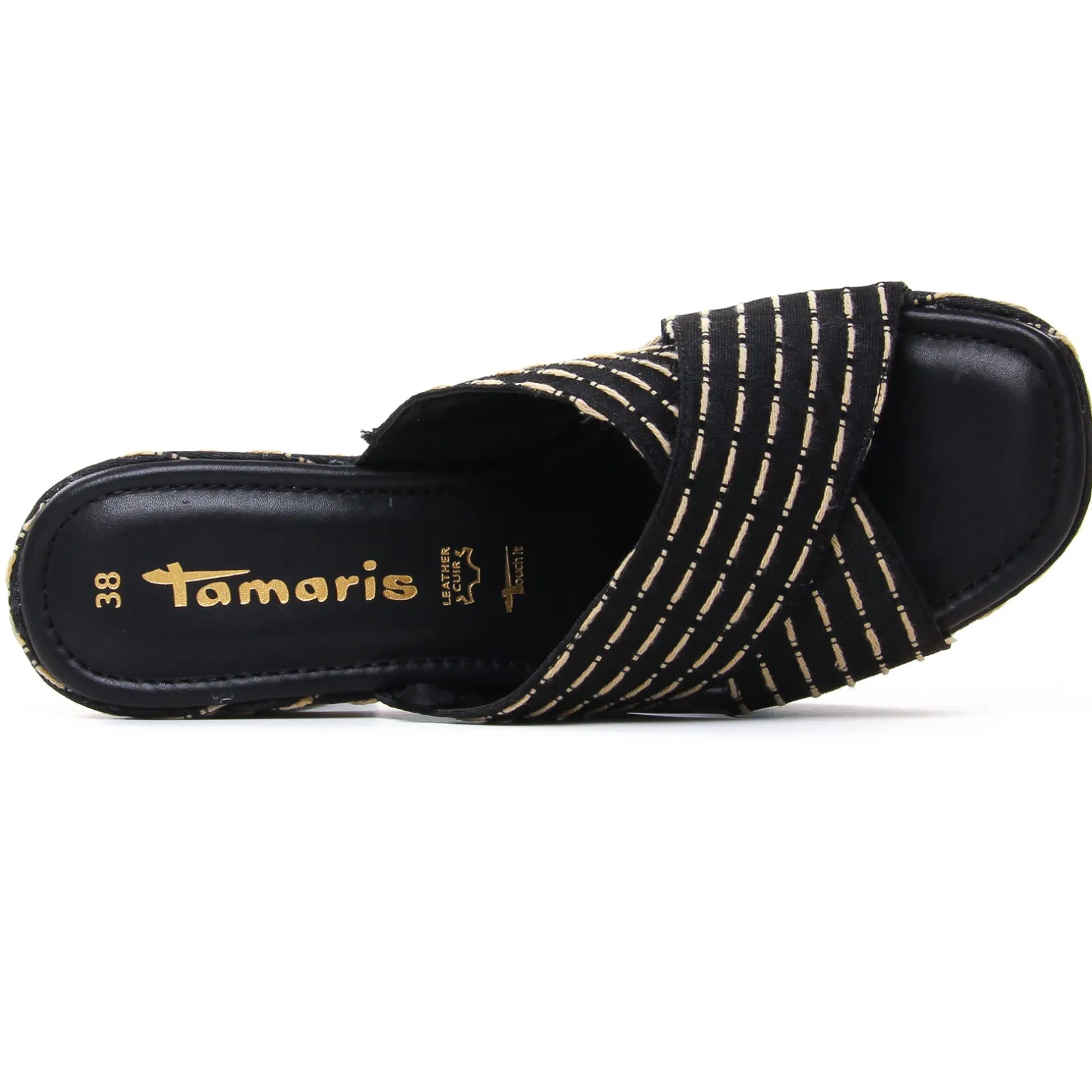 Mules de la marque Tamaris de couleur noir or. Originales et modernes, mules à talon massif, pour le confort une première Touch It qui prend le galbe de votre pied instantanément, tige et semelle recouverts d’un textile noir et or tressé élégamment, sandales à talon tendances signées Tamaris nouvelle collection été 2023