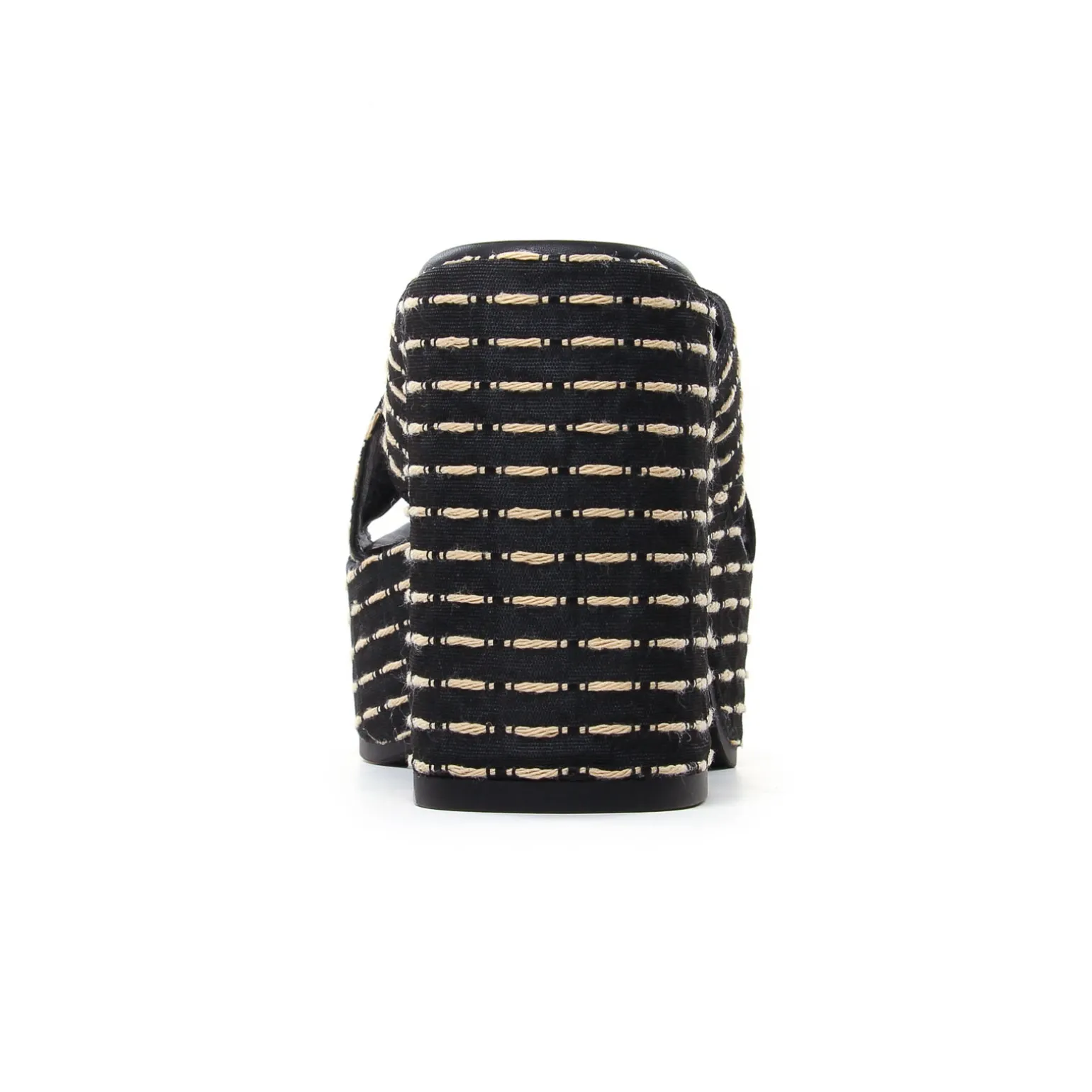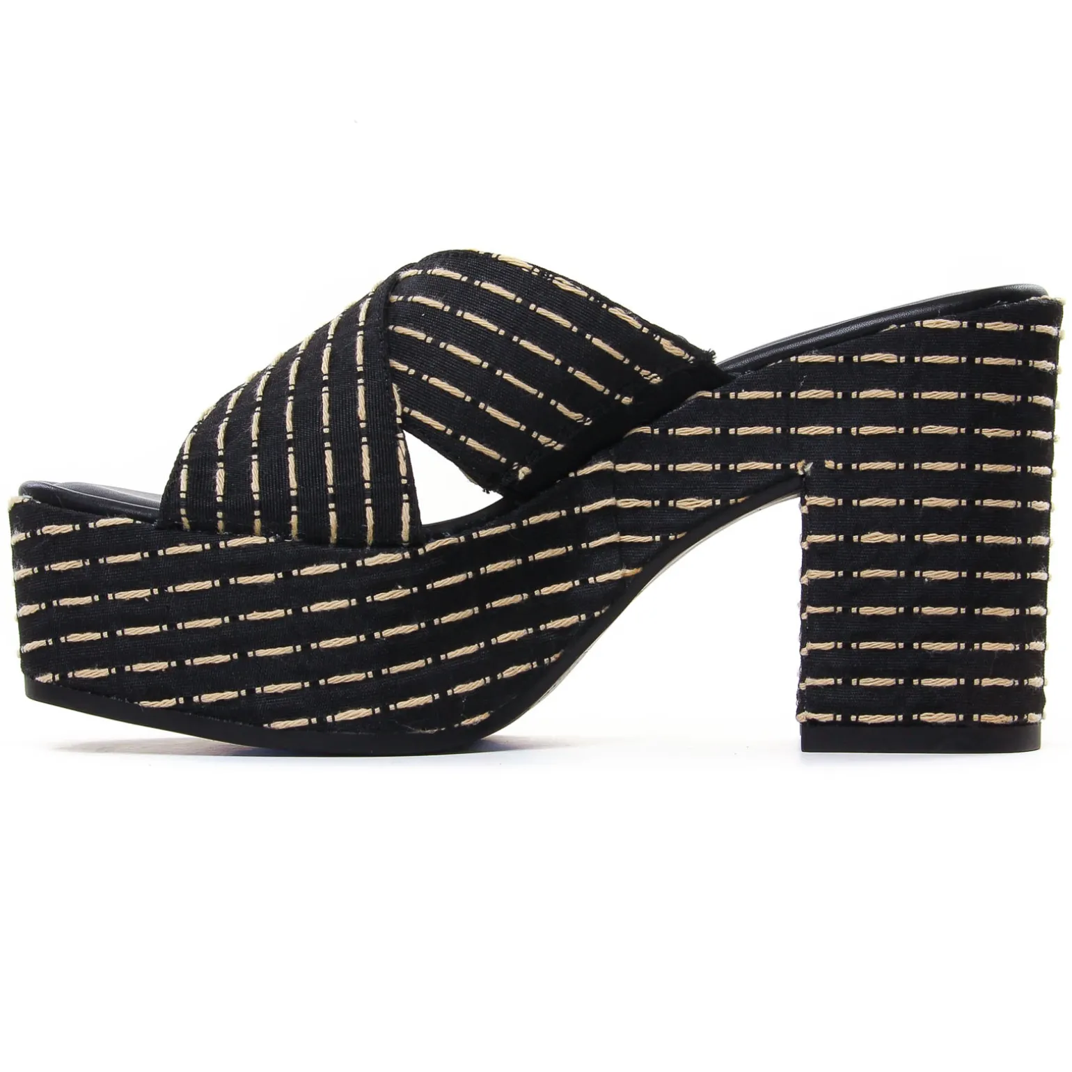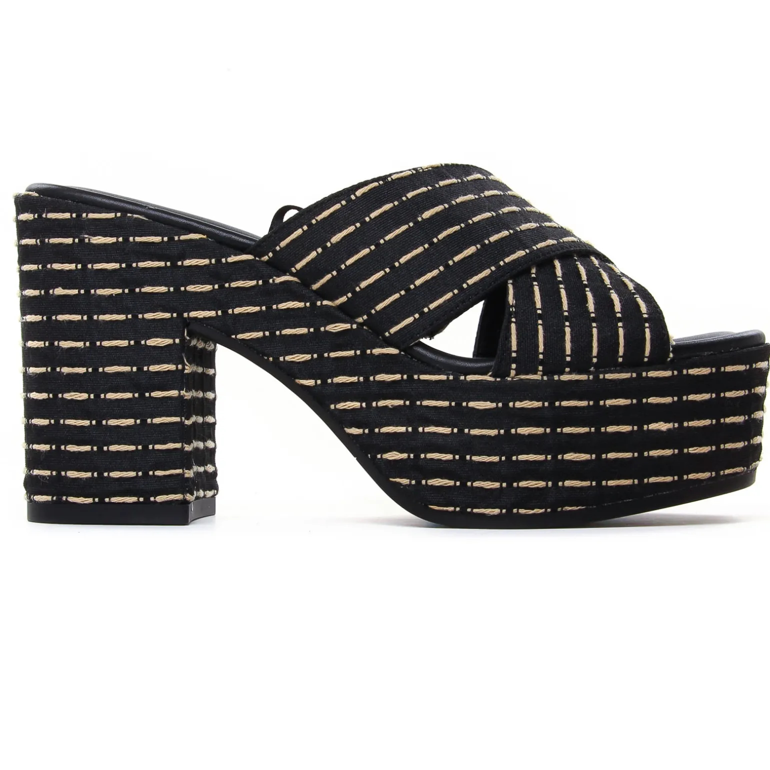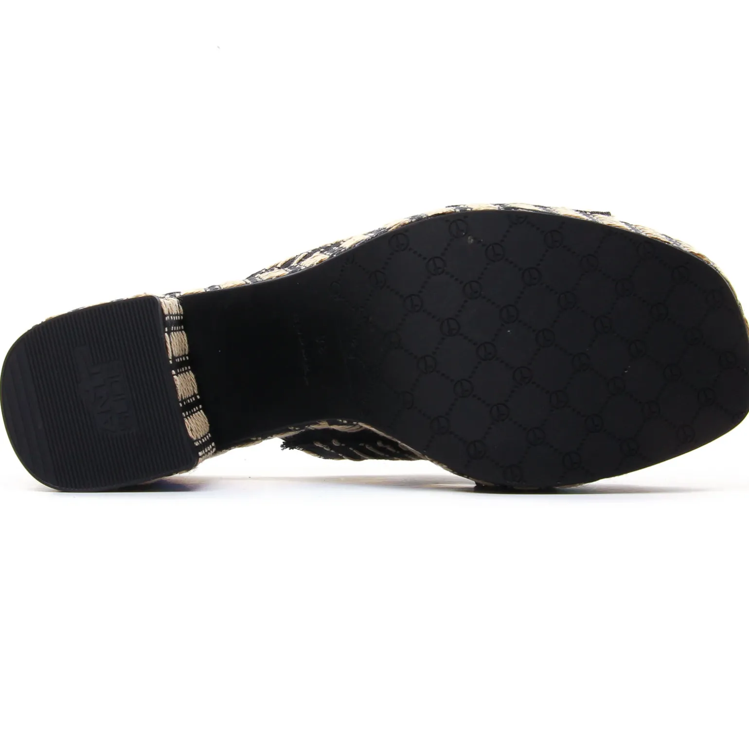 Mules de la marque Tamaris de couleur noir or. Originales et modernes, mules à talon massif, pour le confort une première Touch It qui prend le galbe de votre pied instantanément, tige et semelle recouverts d’un textile noir et or tressé élégamment, sandales à talon tendances signées Tamaris nouvelle collection été 2023