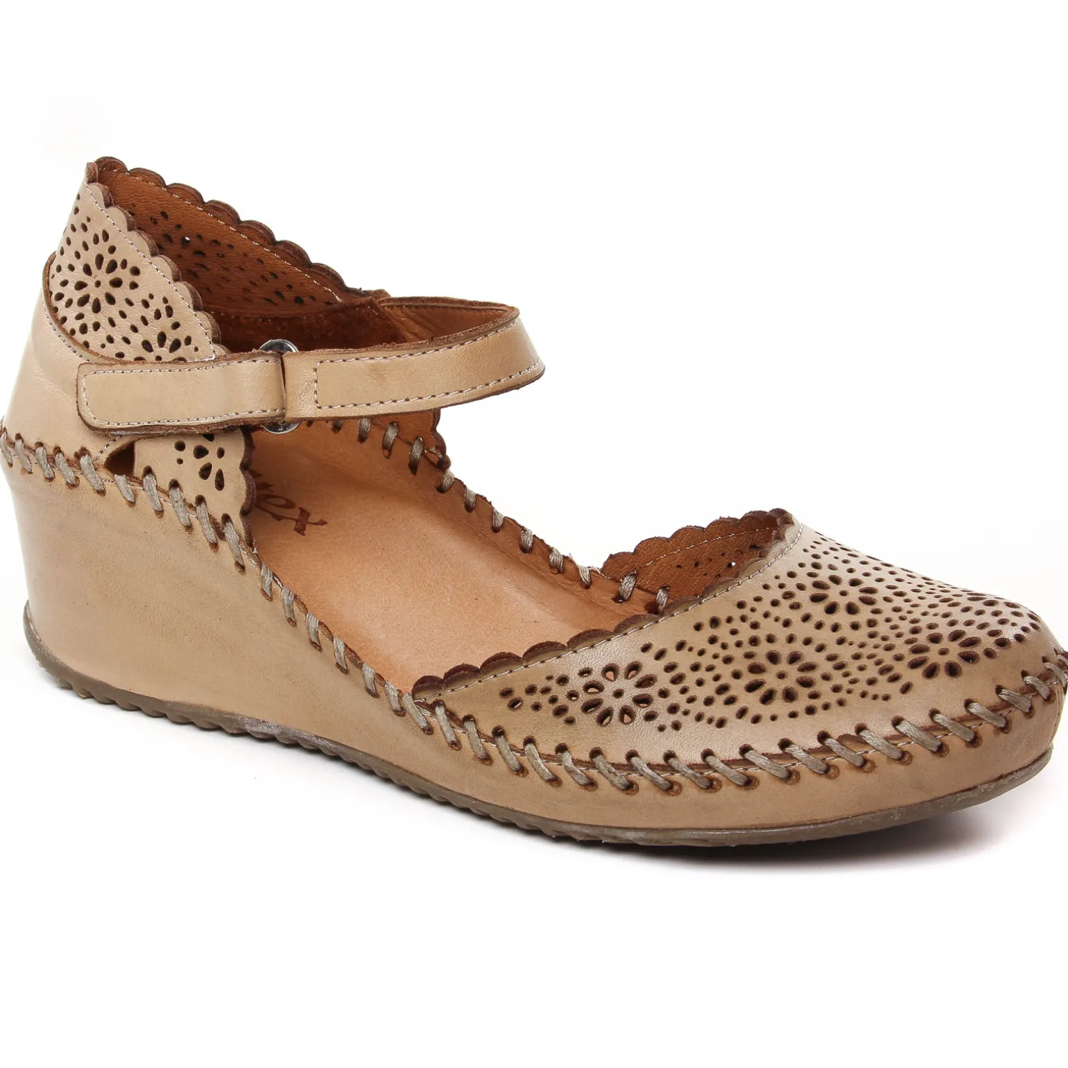 Nu-Pieds Compensés de la marque Altex de couleur beige. Sandales compensées confortables signées Altex, nu-pied en cuir, première et doublure cuir, une bride à scratch autour de la cheville une semelle recouverte de cuir, une teinte verte beige pour cette nouvelle collection été 2023, 5 cm de hauteur sous talon