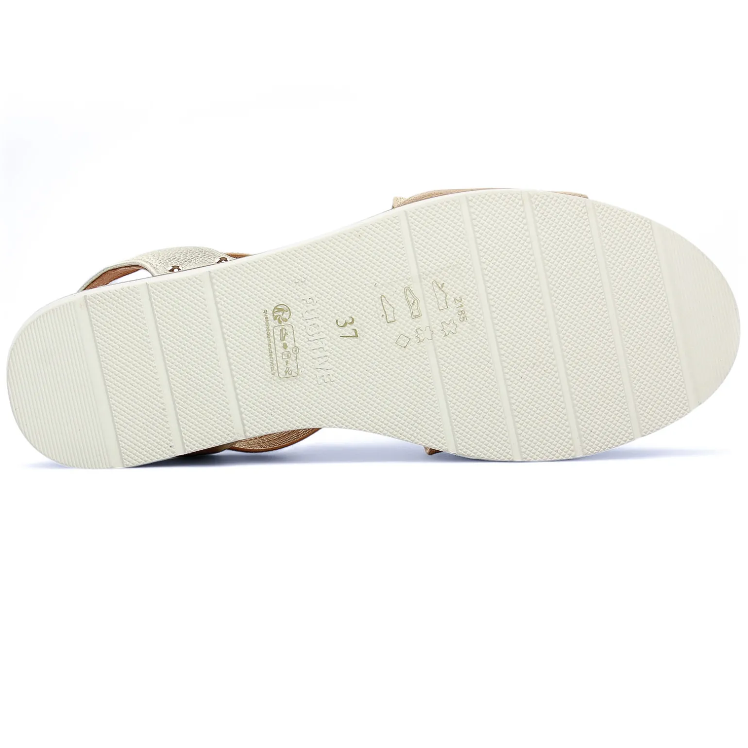 Nu-Pieds Compensés de la marque Fugitive de couleur beige or. Superbes sandales compensées en cuir, légères et donc confortables, une touche vintage avec son croisé élastiqué doré sur le coup de pied, un talon compensé recouvert or ou argent, un patin de 1.5 cm à l’avant, sandales un plateau couleur crème, sandales signées par la marque française Fugitive