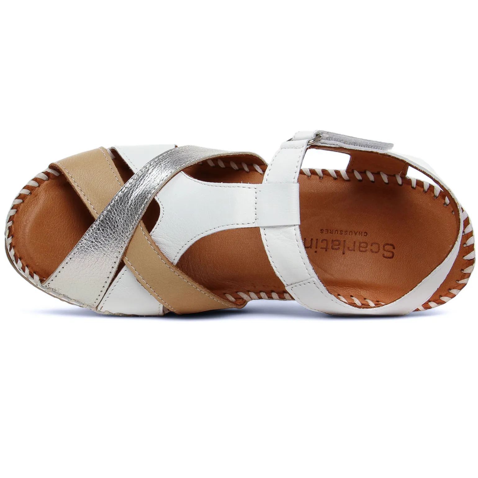 Nu-Pieds Compensés de la marque Scarlatine de couleur blanc argent crème. Élégants nu-pieds tout cuir avec une semelle compensée légères et souple, une tige construite avec 3 brides croisées à l’avant, une première cuir, une bride tour de cheville avec une fermeture par velcro, talon recouvert de cuir