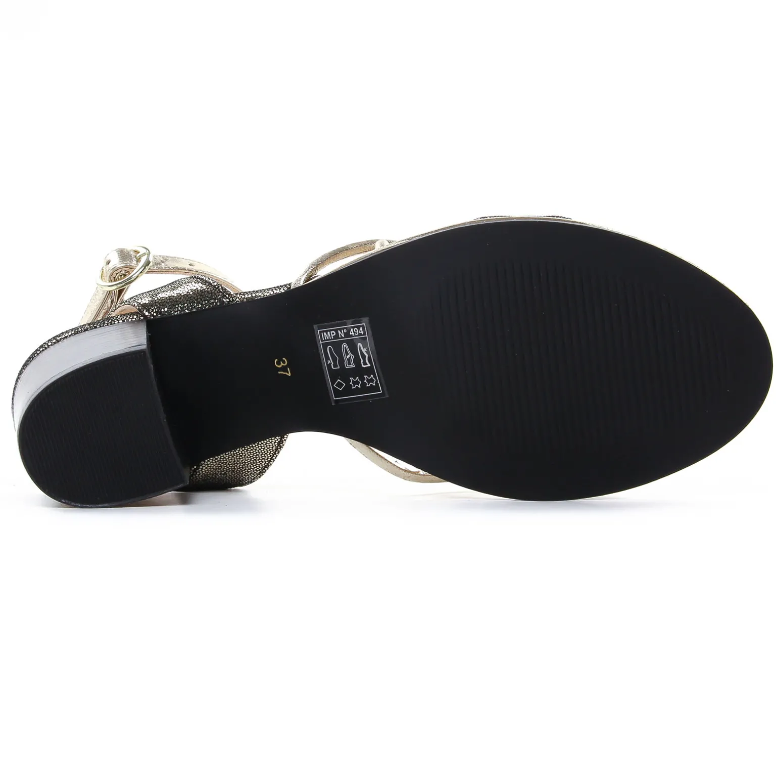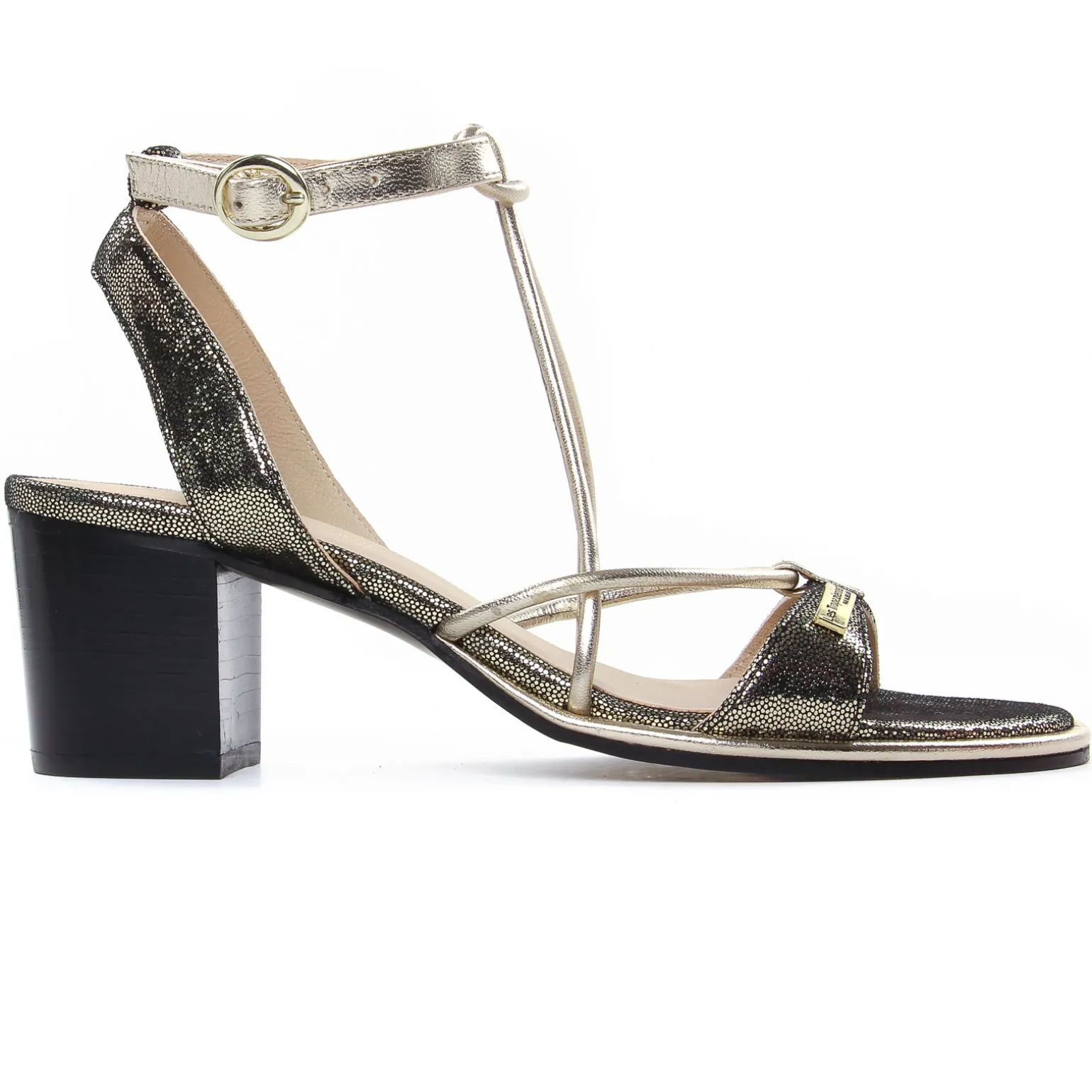 Nu-Pieds Talons Hauts de la marque Les Tropéziennes de couleur noir irisé. Jolies spartiates élégantes à souhait sur un talon haut bois magnifique, un cuir noir irisé, des brides cuir fines argentées, un talon carré noir haut de 6.5 cm avec, première de propreté en cuir confortable, jolies sandales à talon haut glamours et chics signées Les Tropéziennes par M Belarbi.