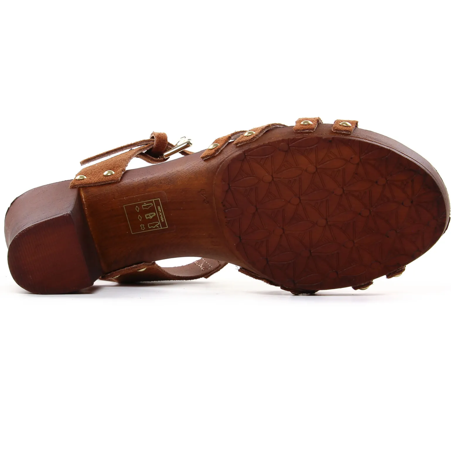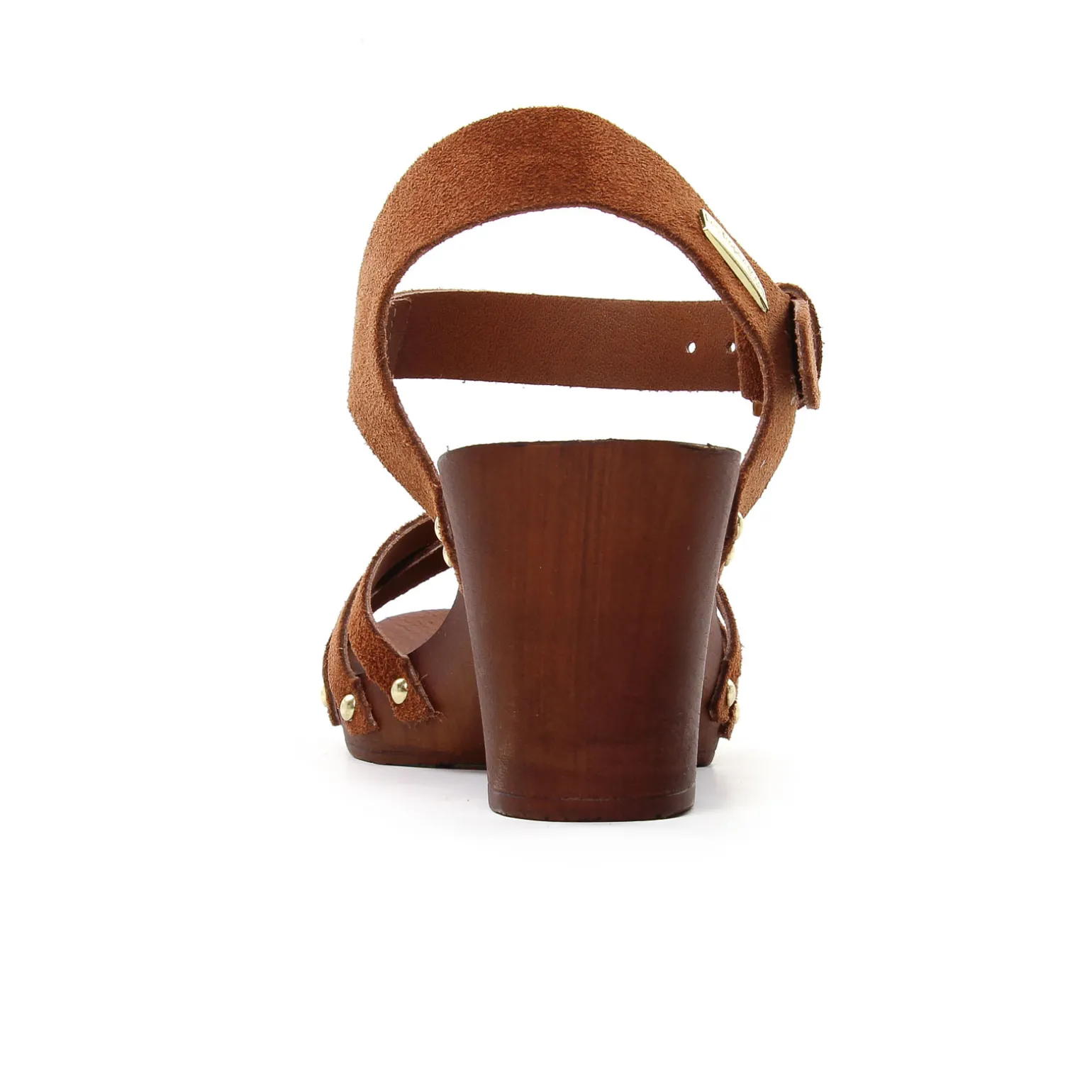 Nu-Pieds Talons Hauts de la marque Les Tropéziennes de couleur marron. Jolis nu-pieds en cuir suédé marron ou métallisé or, des clous or pour une touche glam supplémentaire, bride réglable par boucle, un talon carre aspect bois superbe, nu-pieds à talon haut Les Tropéziennes nouvelle collection été 2023