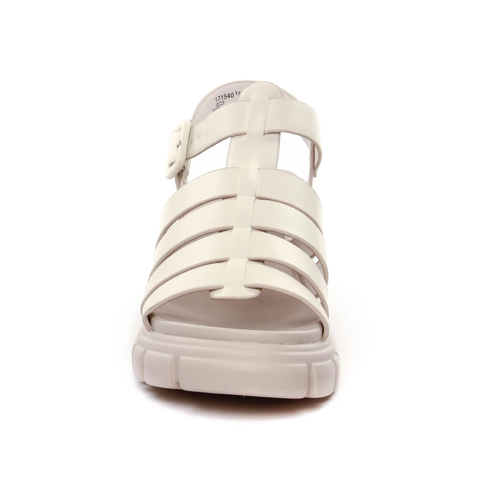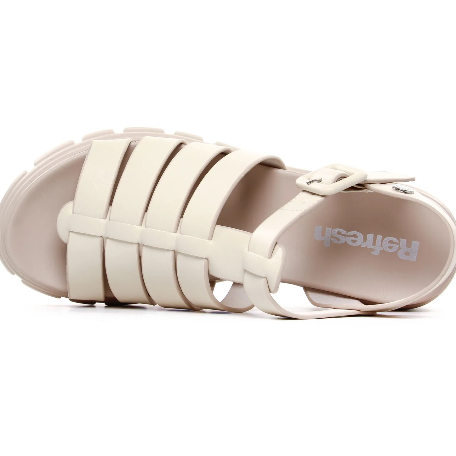 Nu-Pieds Talons Hauts de la marque Refresh de couleur crème. Un talon bloc massif et une semelle crantée, voici des nu-pieds tendances de la gamme Vegan de chez Refresh, sandales multibrides avec un talon haut de 6.5 cm, réglage par boucle, disponibles en noir ou en blanc crème