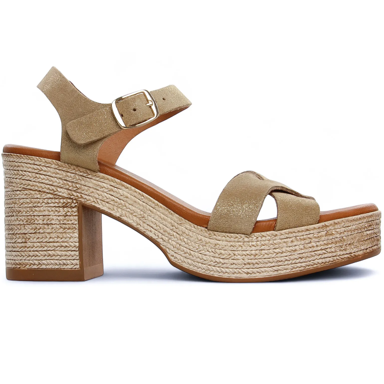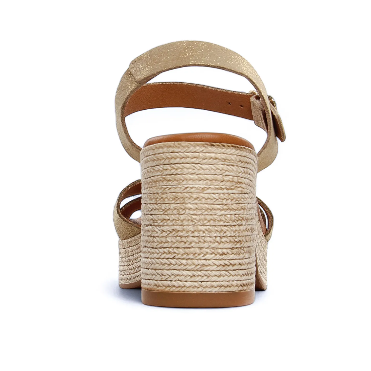 Nu-Pieds Talons Hauts de la marque Scarlatine de couleur beige doré. Sandales en cuir à patin bloc de 3 cm et un talon bloc de 8 cm de hauteur recouvert d’une belle imitation cordes ! Sandales très tendances d’aspect massif mais très légères, une première cuir confortable, bride tour de cheville réglable par une boucle dorée.