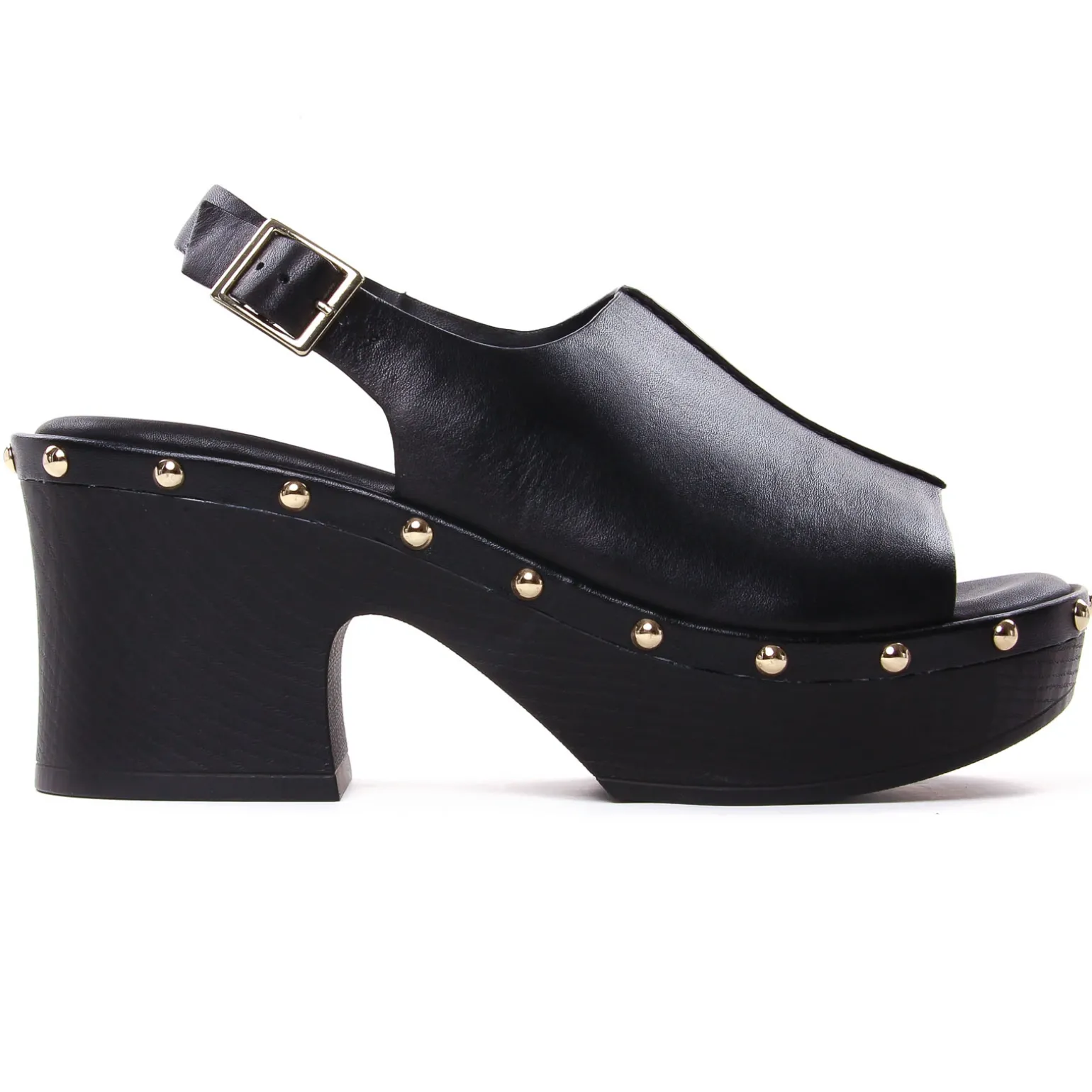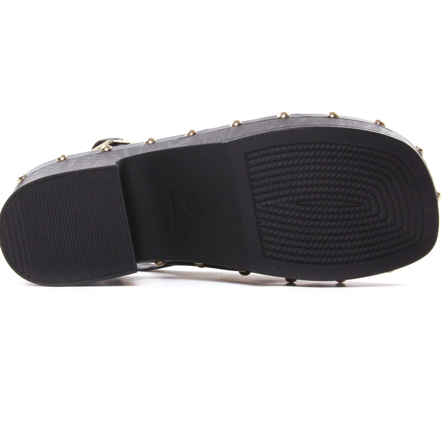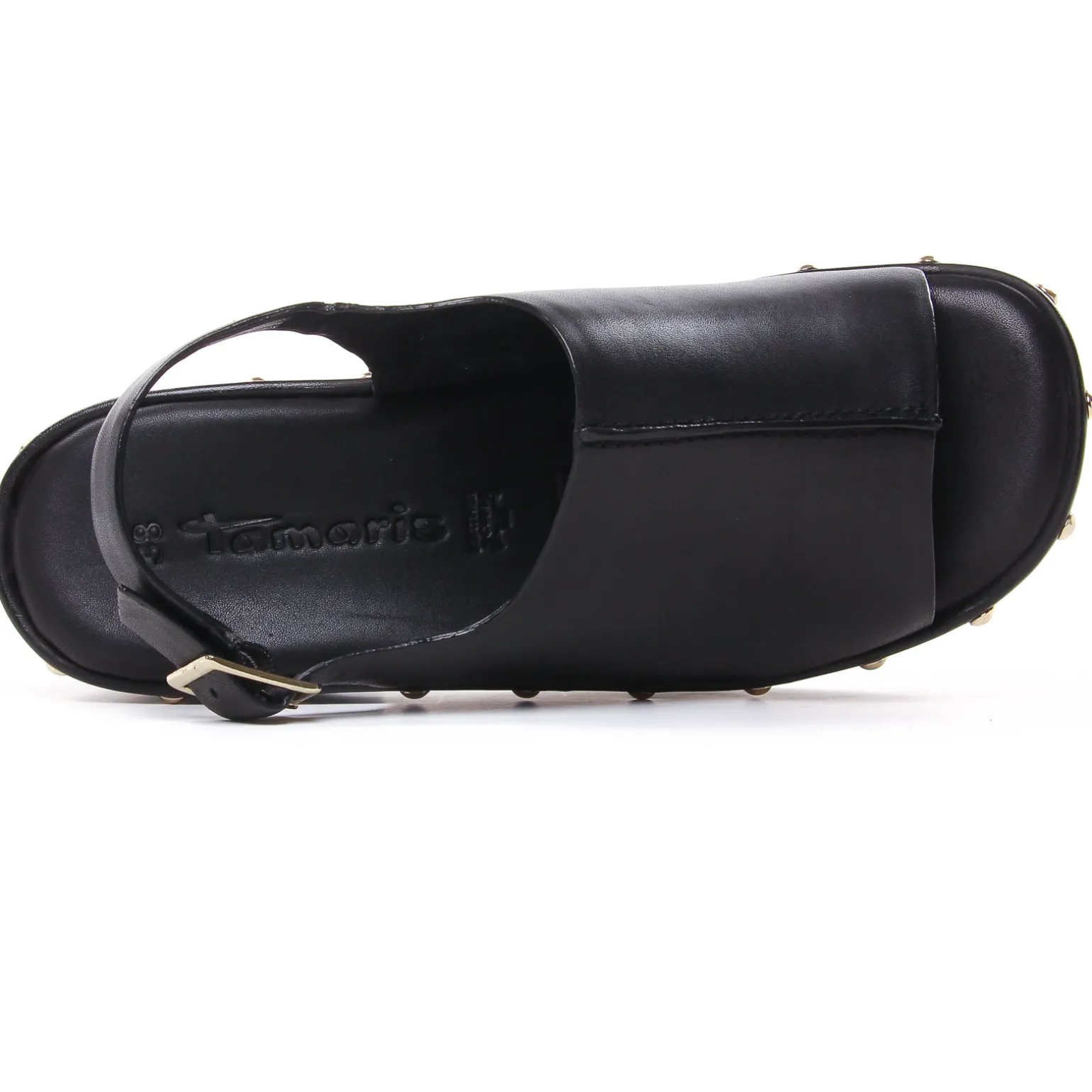 Nu-Pieds Talons Hauts de la marque Tamaris de couleur noir. Sabots glam et modernes, un talon massif haut de 7.5 cm, une tige en cuir lisse noir, brides en cuir autour de la cheville, des clous dorés autour de la semelle noires en gomme légère, première de propreté Touch It très confortable, sandales à talon de la nouvelle collection Tamaris été 2023.