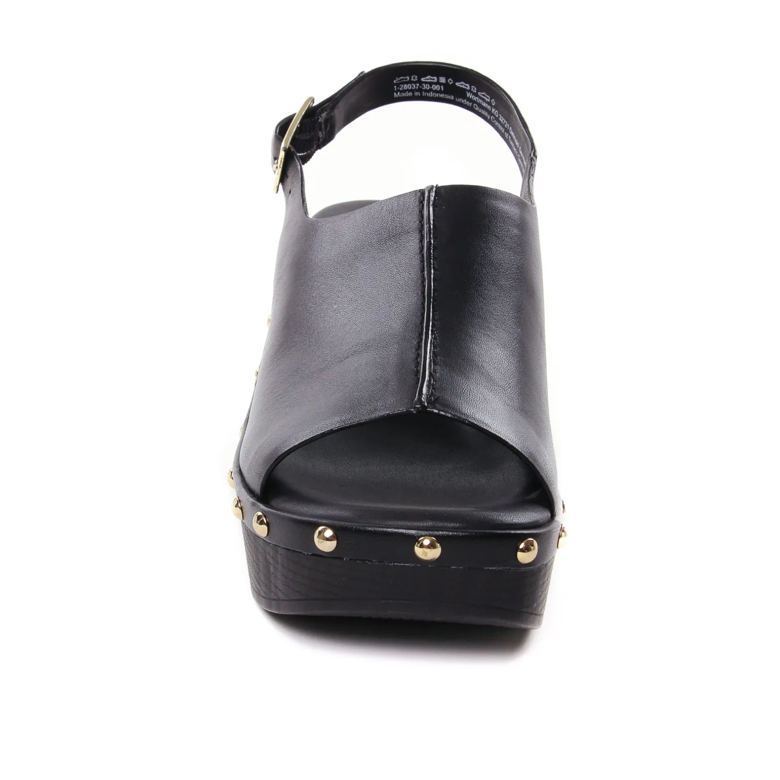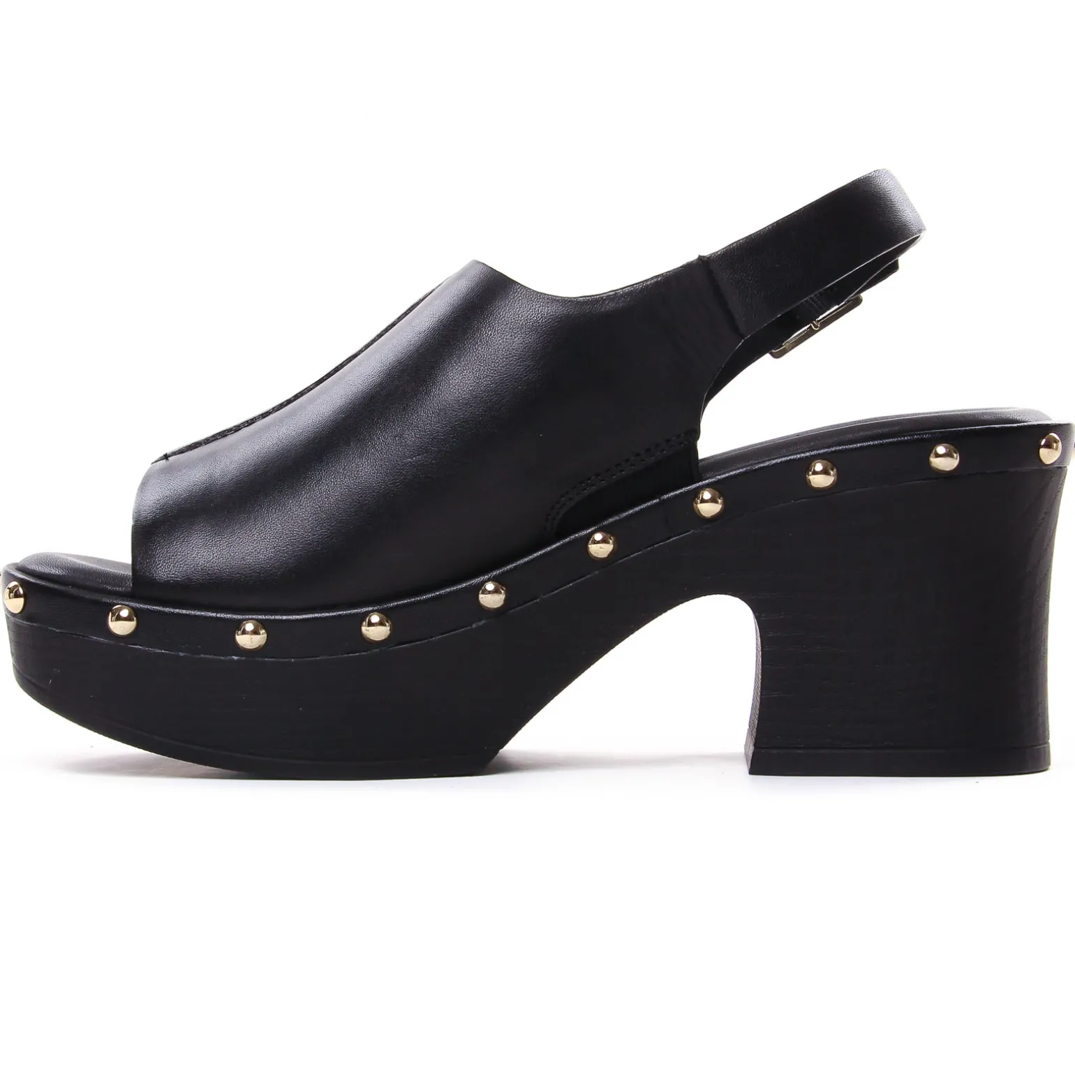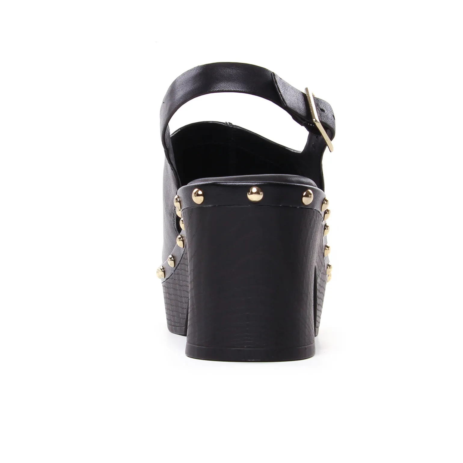 Nu-Pieds Talons Hauts de la marque Tamaris de couleur noir. Sabots glam et modernes, un talon massif haut de 7.5 cm, une tige en cuir lisse noir, brides en cuir autour de la cheville, des clous dorés autour de la semelle noires en gomme légère, première de propreté Touch It très confortable, sandales à talon de la nouvelle collection Tamaris été 2023.